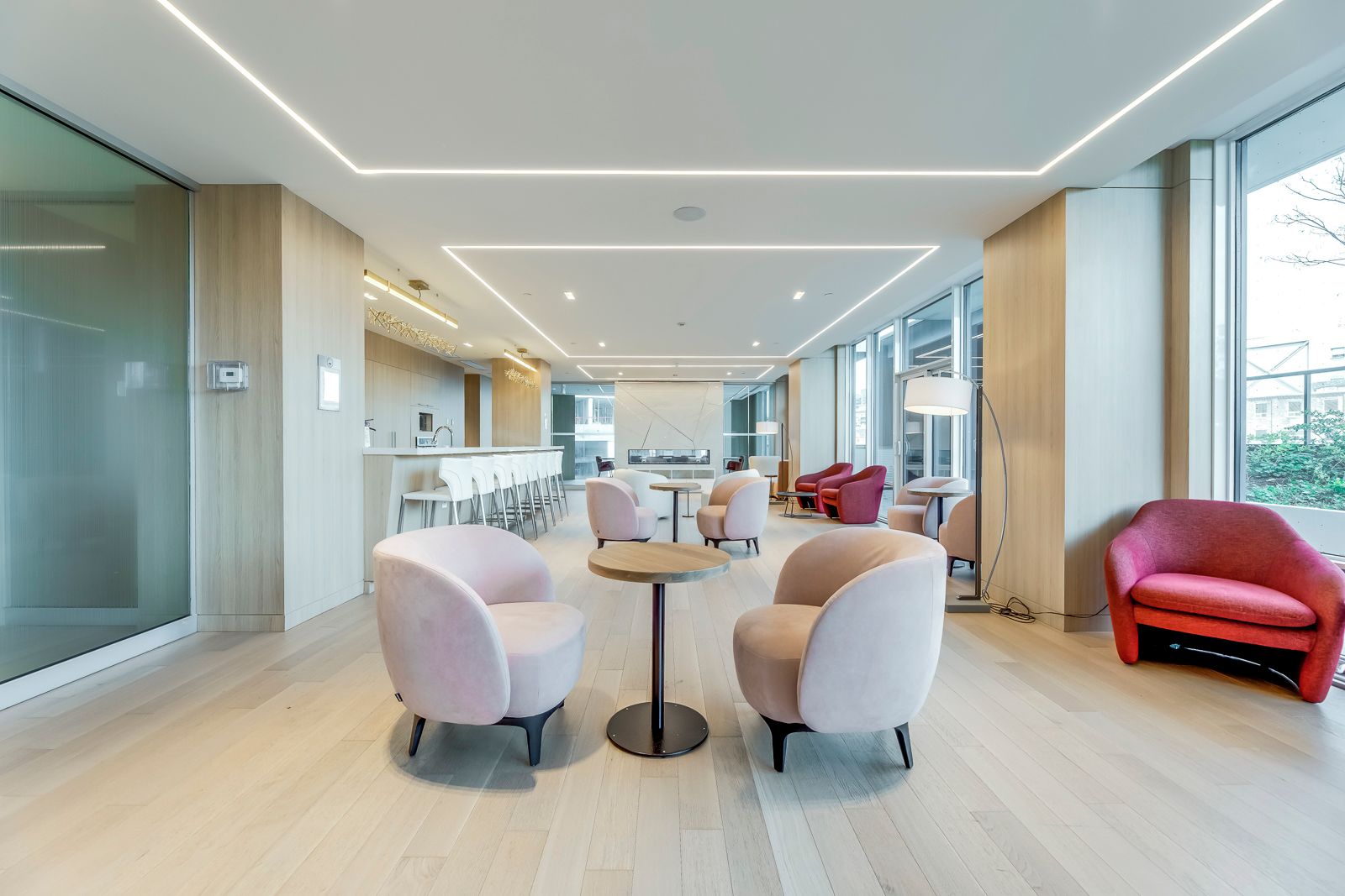 • Floor-to-ceiling windows provide stunning views of Lake Ontario.