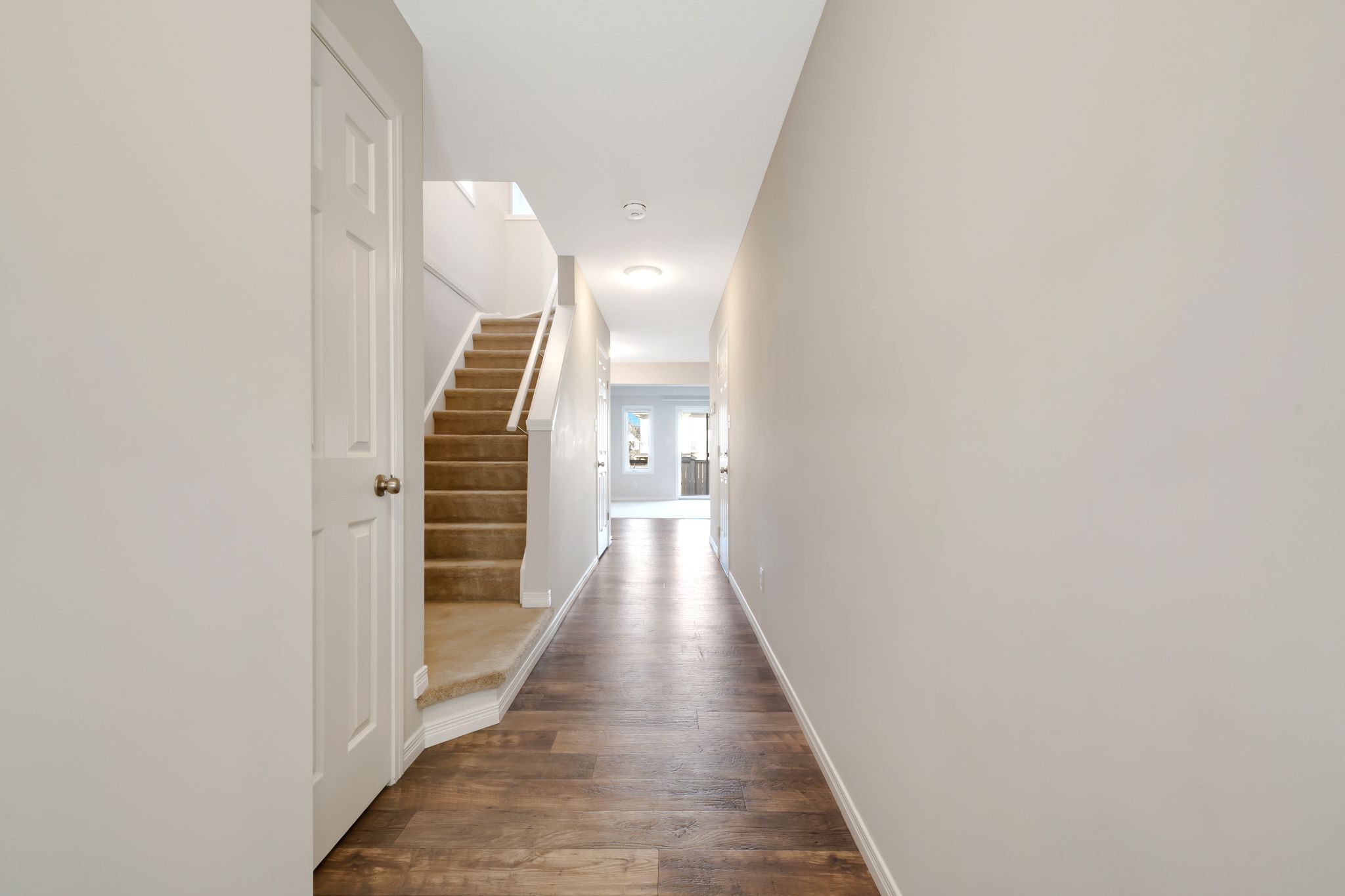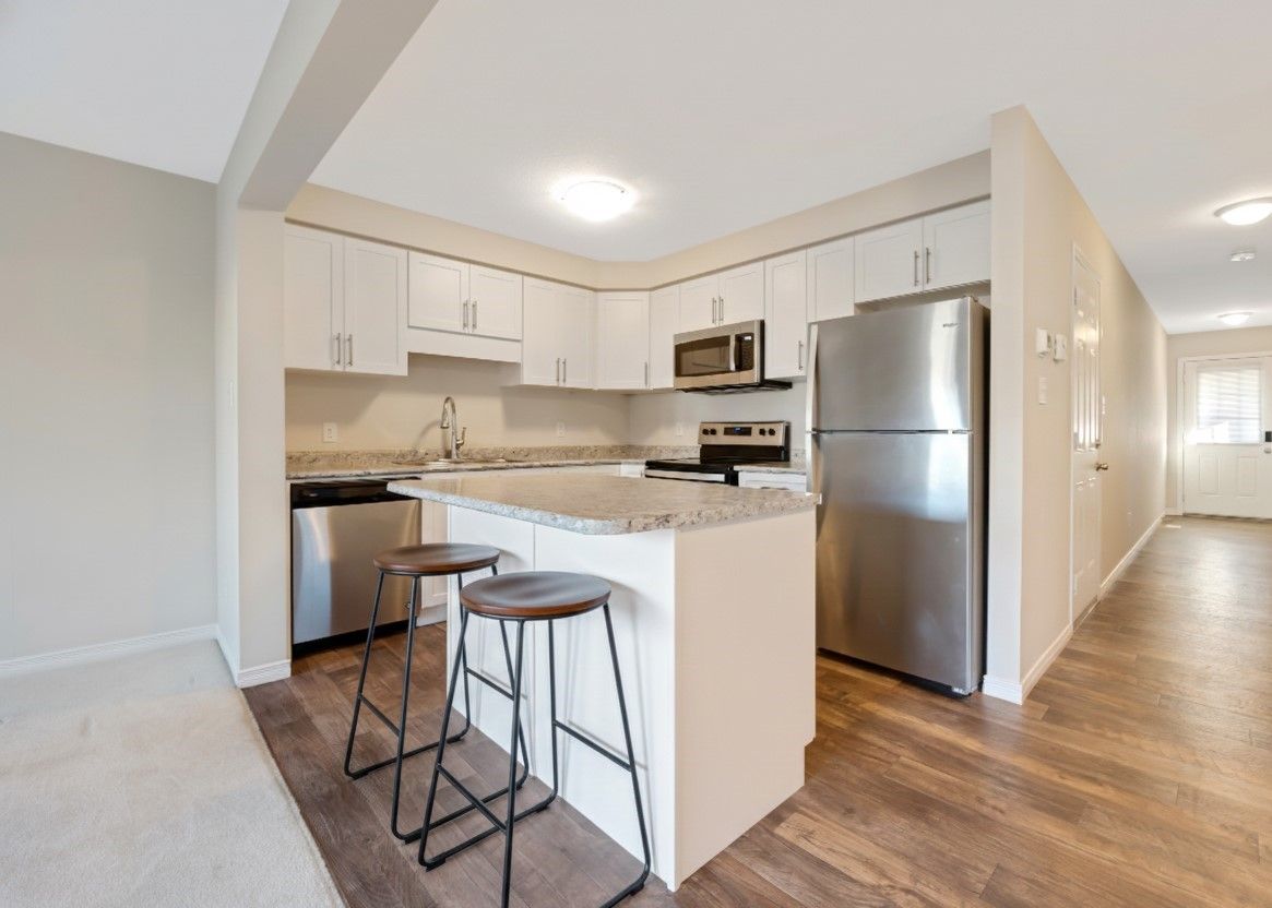 Clean, contemporary & full of natural light! This bright, open-concept end-unit townhome feels instantly welcoming with its neutral tones, modern finishes, and thoughtfully designed layout. The spacious main floor features a stylish kitchen complete with an island, breakfast bar seating, and ample storage-perfect for everyday living and entertaining. The living room opens through sliders to a private back patio, ideal for relaxing or enjoying a morning coffee. Upstairs, you'll find 3 generous bedrooms and 2 full bathrooms in total, including a primary bedroom with its own ensuite. The unspoiled basement is ready for your personal touch and future possibilities. Located just minutes from conestoga college, scenic walking trails, everyday amenities, and with quick 2-minute access to the 401, this home blends comfort with convenience. This unit offers a water softener, garage door open, freshly shampooed carpets and more. A fantastic opportunity for first-time buyers, investors, or young families. Additional parking available for rent or purchase. Photos are virtually staged.