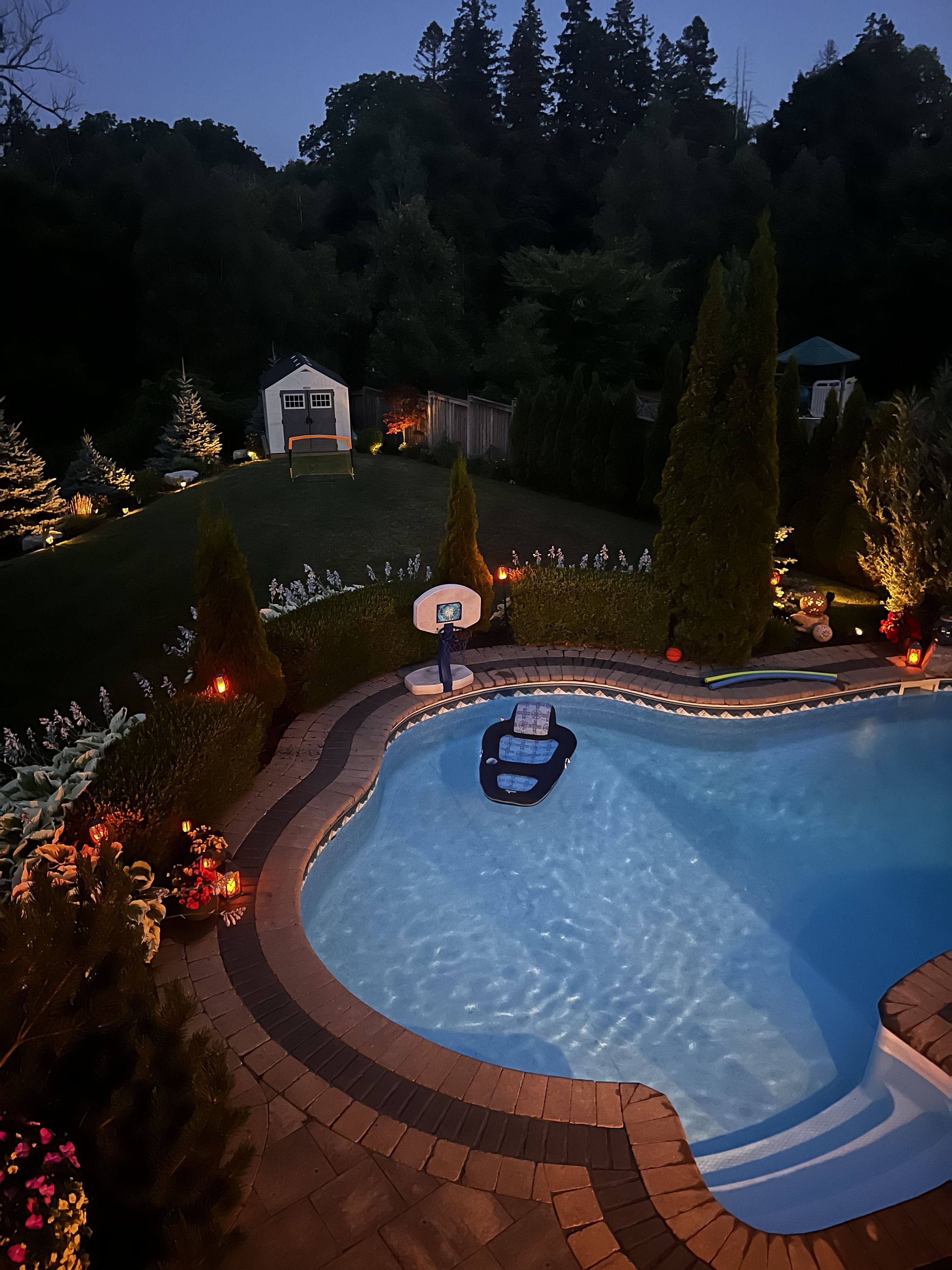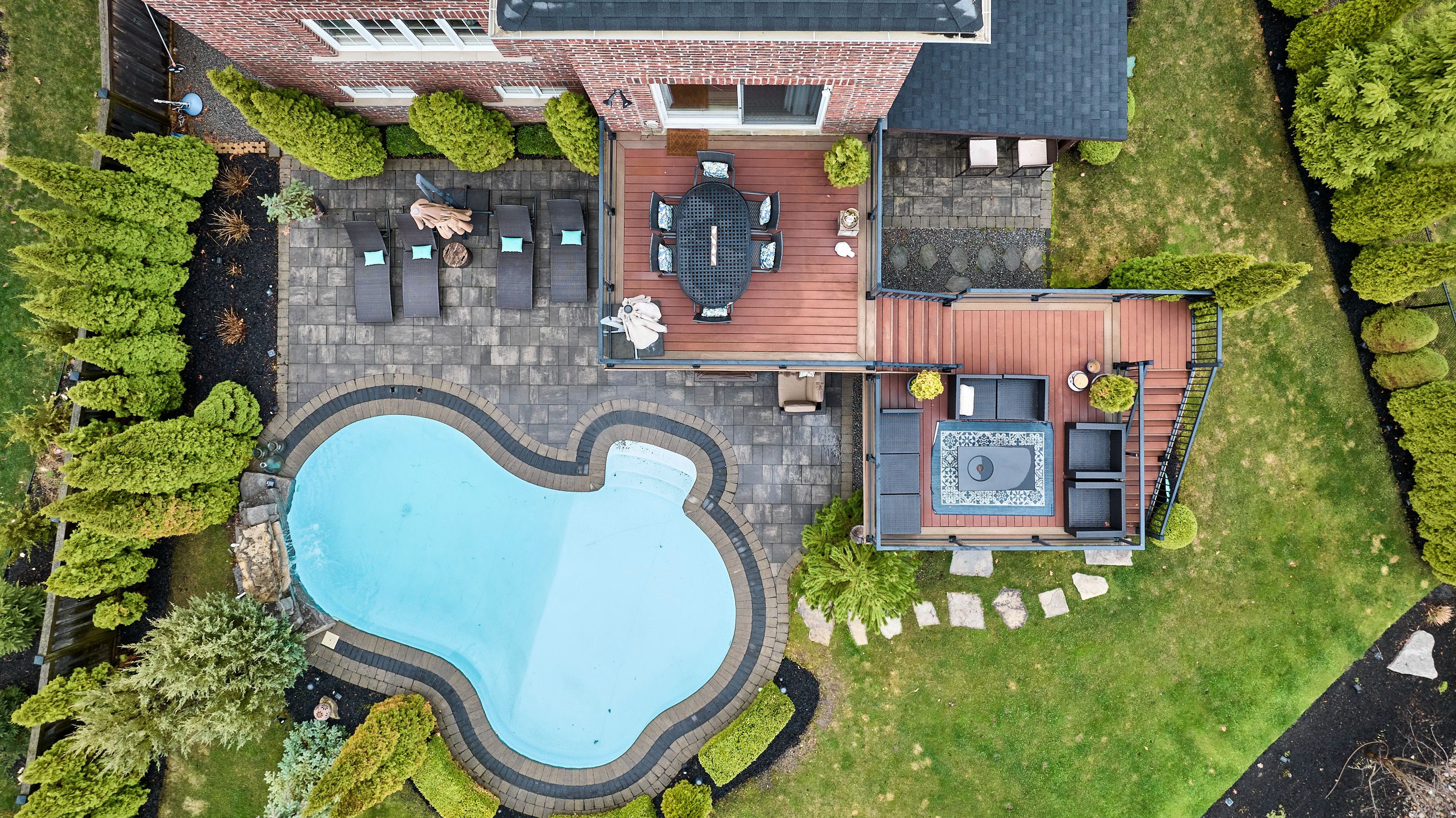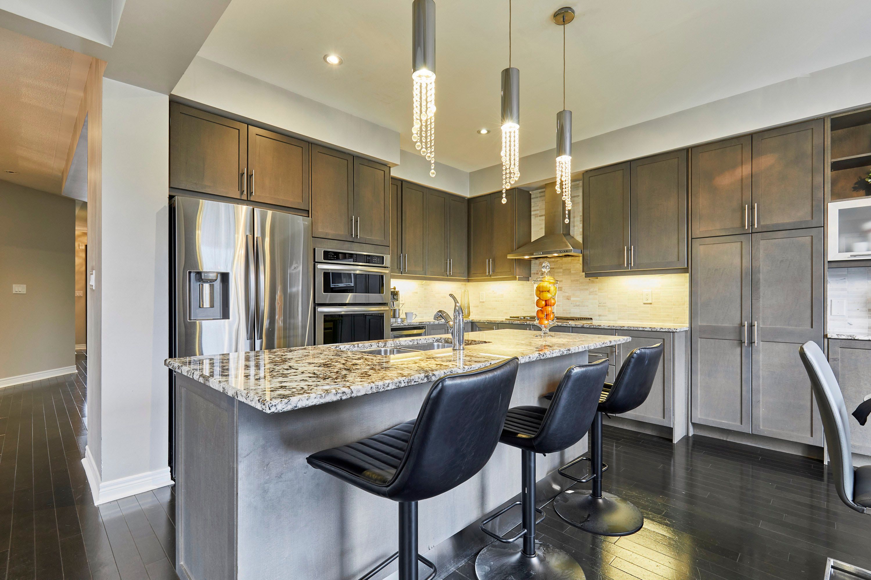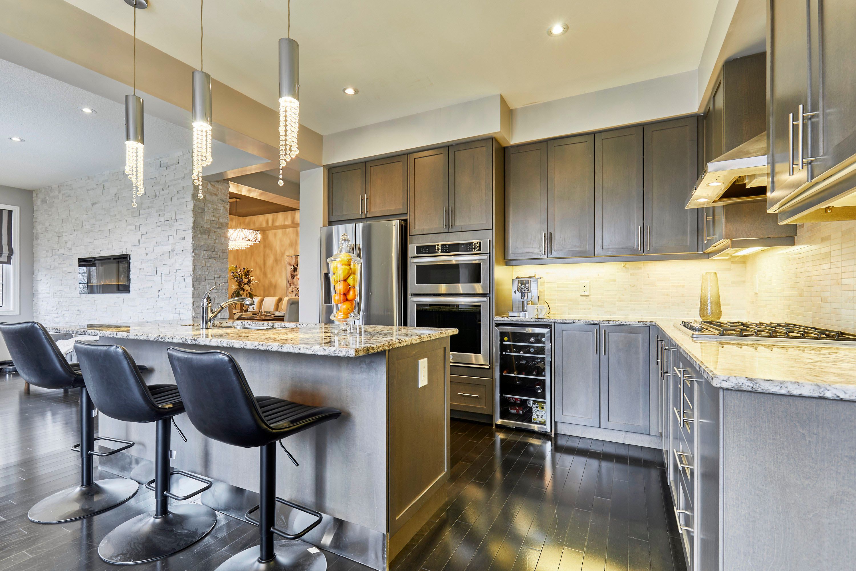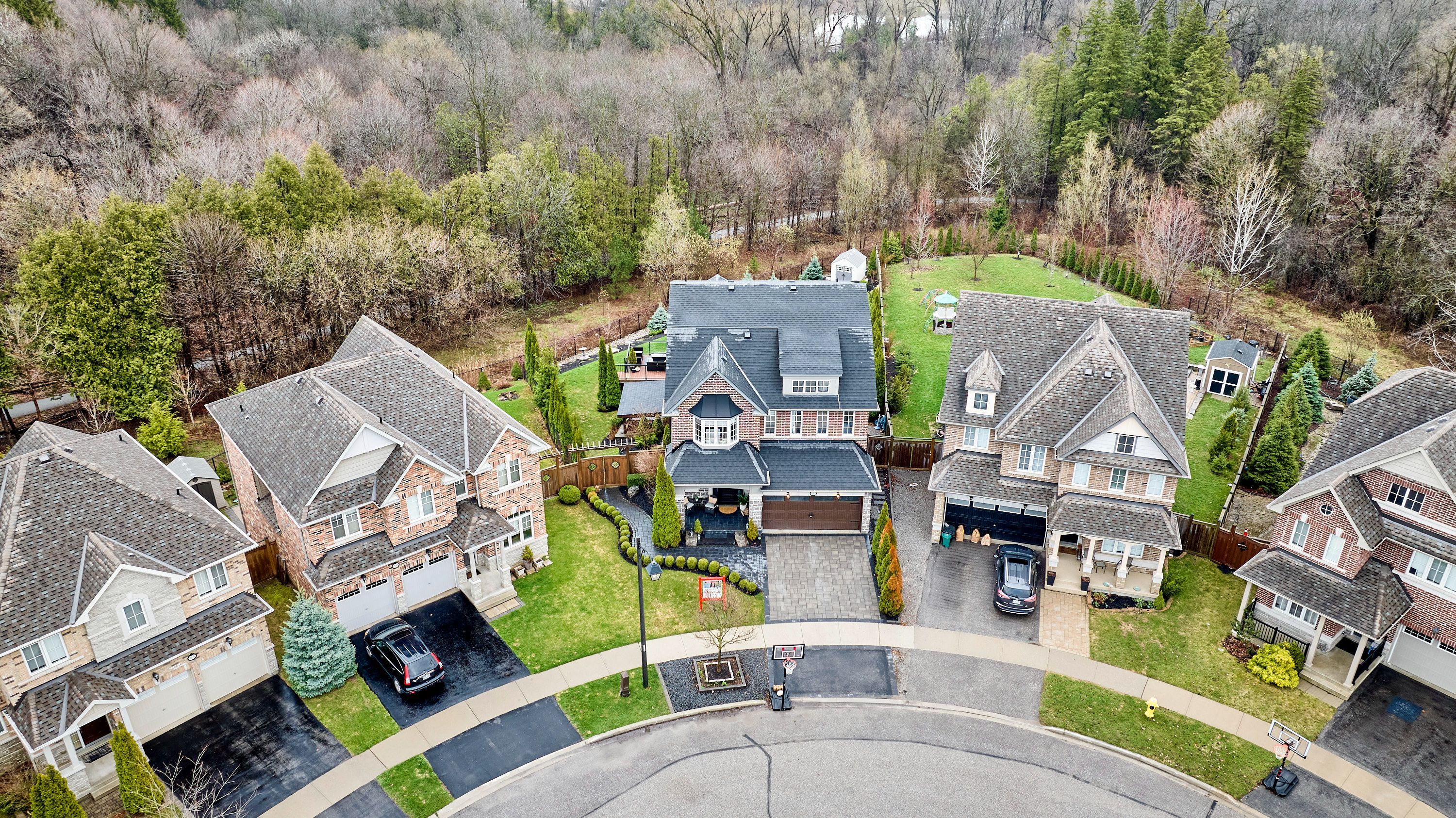 Welcome to this exceptional executive residence, perfectly nestled on a coveted pie-shaped lot backing onto a private ravine-offering a rare blend of luxury living and natural serenity. This stunning home boasts a bright, open concept main floor with five spacious bedrooms and five beautifully appointed bathrooms, all complemented by gleaming hardwood floors throughout. Designed for both everyday living and elegant entertaining, the chef-inspired eat-in kitchen features an oversized island with breakfast bar, granite countertops and high-end appliances with a seamless walk-out to your own private backyard oasis. The inviting family room showcases a sophisticated stone fireplace, while separate living and dining rooms provide refined spaces for hosting family gatherings. The second level offers your primary retreat complete with a spa-like 5-piece ensuite and a large walk-in closet. Three additional spacious bedrooms include a convenient shared 4-piece bath between bedrooms two and three. A versatile second-floor office/media space is ideal for working from home. The upper level also features a fifth bedroom with a dream walk-in closet and dressing room, complimented by an additional family room-perfect for extended family or private guest quarters. The finished walk-out basement is an entertainer's dream, featuring a large wet bar, expansive games area and a cozy gas fireplace all opening to the spectacular backyard. Over $300,000 in professional landscaping has transformed the outdoor space into a true resort-style retreat. Enjoy a heated saltwater in-ground pool with a breathtaking waterfall cascading over natural stone, an expansive patio designed for seamless indoor-outdoor living, and a fully equipped outdoor kitchen-perfect for hosting unforgettable summer events. This is more than just a home-it's a private escape designed for those who value space, elegance, and endless entertaining.