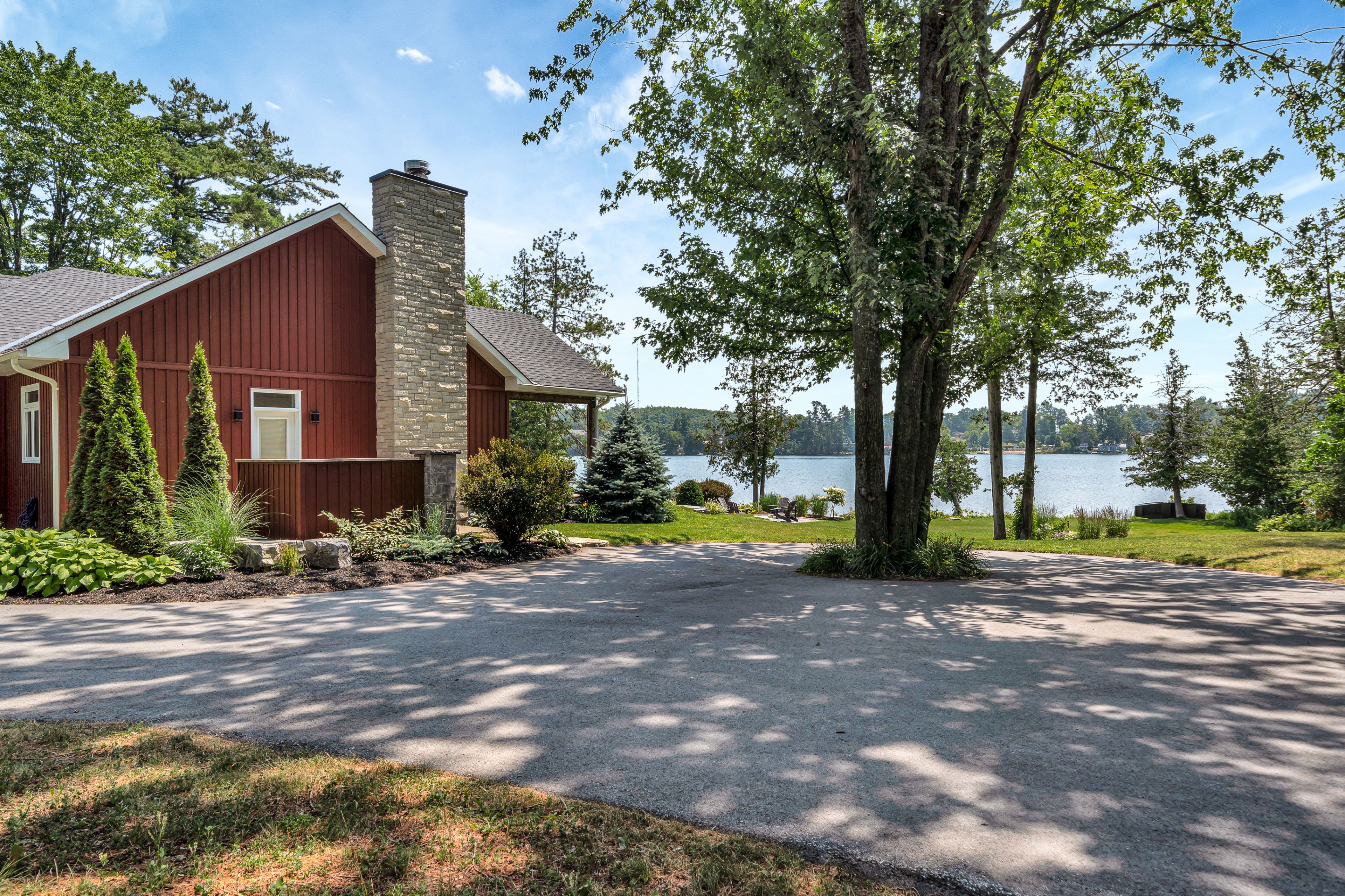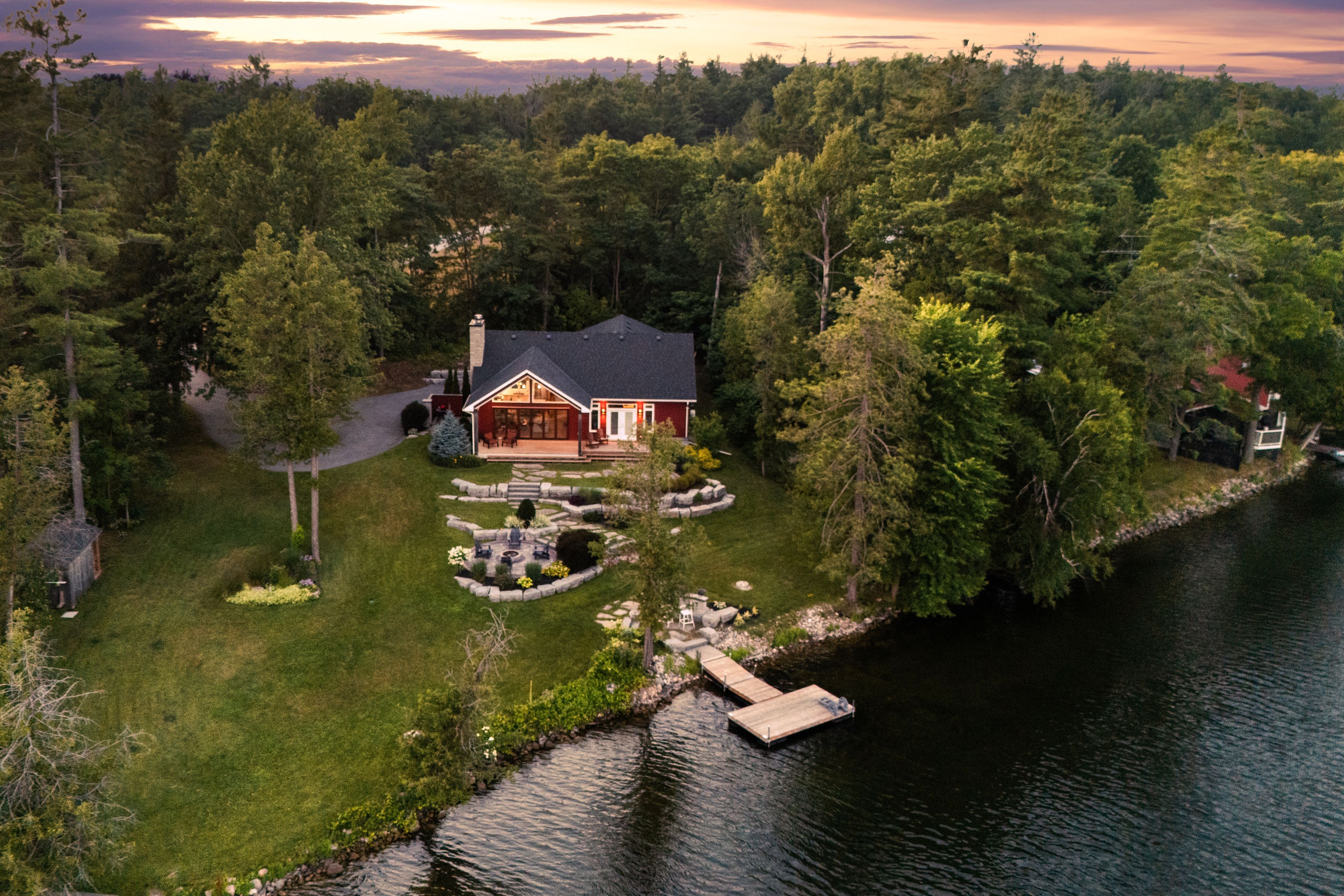 • Landscaped outdoor area with fire pit and pathways to the water's edge.