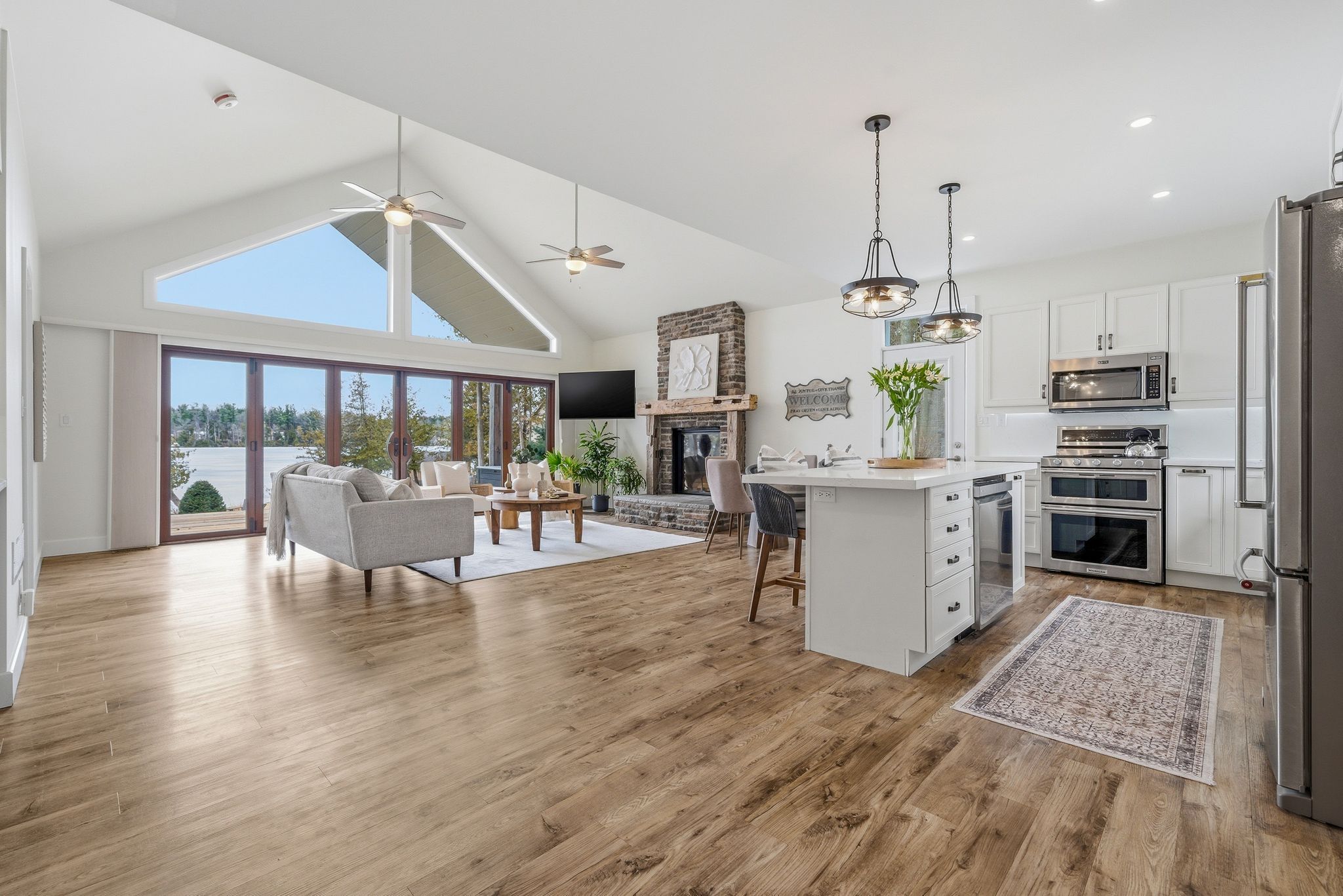 Experience refined waterfront living where timeless design meets effortless comfort on the serene shores of oak lake. This beautifully crafted 3 bedroom, 2 bath bungalow is a rare offering-thoughtfully designed to embrace its surroundings and capture uninterrupted views of the water from nearly every angle. From the moment you step inside, the home welcomes you with an airy, open-concept layout bathed in natural light. Expansive bifold doors create a stunning architectural focal point, perfectly framing the lake and manicured grounds beyond while seamlessly blending indoor and outdoor living. Whether hosting elegant dinner parties or enjoying relaxed evenings at home, the space transitions with ease-offering both sophistication and warmth in equal measure. Every detail reflects pride of ownership and exceptional craftsmanship. The main level is designed for both beauty and practicality, featuring a tranquil primary retreat with a private ensuite, two additional bedrooms for family or guests, a stylish main bath, and convenient main-floor laundry. The flow is intuitive and inviting-ideal for entertaining, yet equally suited to peaceful mornings overlooking the water. Step outside to your own landscaped oasis. A thoughtfully curated outdoor living area includes a fire pit, bar area, and a graceful pathway guiding you to the water's edge-perfect for sunset gatherings, quiet reflection, or launching into lake days ahead. Mature trees and lush gardens provide privacy while enhancing the natural beauty of the setting. Just minutes from stirling and belleville, this exceptional property offers the best of both worlds: tranquil lakeside living with convenient access to amenities. Whether you're searching for a year-round residence or a luxurious escape, this oak lake retreat invites you to slow down, soak in the view, and live every day like you're on vacation.