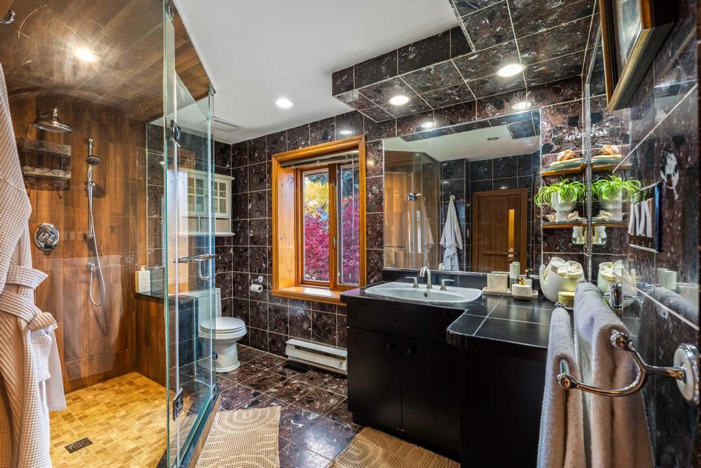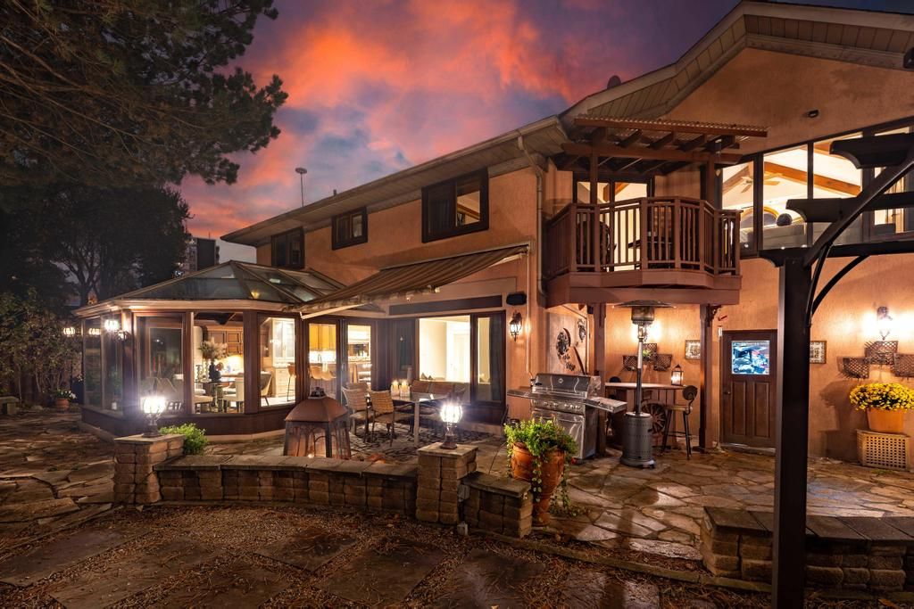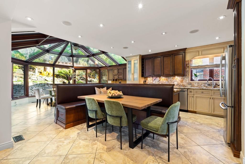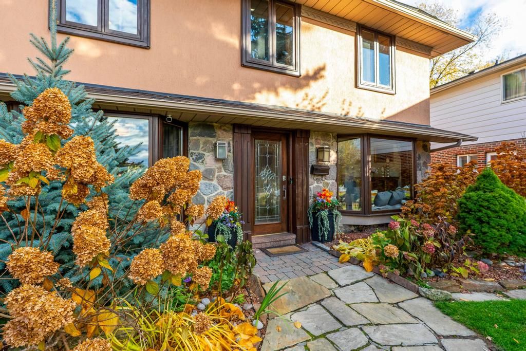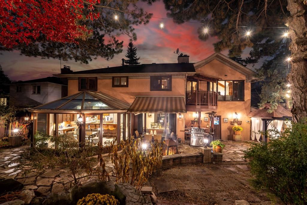 Step into your private urban oasis with this exceptional home, featuring 3 spacious bedrooms and a versatile 4th den on the 2nd floor, perfect as a nursery, office, or cozy retreat. The primary suite impresses with vaulted ceilings, a custom wood-burning fireplace, a private balcony, and a spa-inspired ensuite complete with a built-in sauna and a glass-enclosed oversized shower. Natural light floods the upper hallway through a skylight, creating a warm and inviting atmosphere. At the heart of the home, the chef's kitchen is designed for both family living and entertaining, with built-in appliances, generous stone surfaces, a prep sink, a built-in breakfast nook, and integrated indoor sonos speakers with dedicated wall controls. Sunlight fills the adjacent dining room and sunroom, offering year-round views of the lush, meticulously curated gardens. Additional highlights include a private main floor office with its own wood-burning fireplace, a functional mudroom with built-in bench, a walk-in closet, abundant storage throughout, and a fully equipped lower-level in-law or nanny suite with its own kitchen, fireplace, living space, and 5th bedroom. Three wood-burning fireplaces throughout the home add warmth and charm to every room. The resort-style backyard is a true entertainer's dream, featuring a heated pool, cabana, two fire pits, an outdoor speaker, a natural gas bbq, multiple seating and dining areas, and beautifully landscaped gardens that ensure privacy and serenity. Set on a rare pie-shaped lot spanning almost 1/3 acre, over 200 feet deep and opening to a 121 ft rear lot line, this property perfectly balances the tranquility of a private retreat with the convenience of city living, just moments from highways, fairview mall, the subway, parks, and top-rated schools. An extraordinary offering not to be missed, schedule your private tour today.