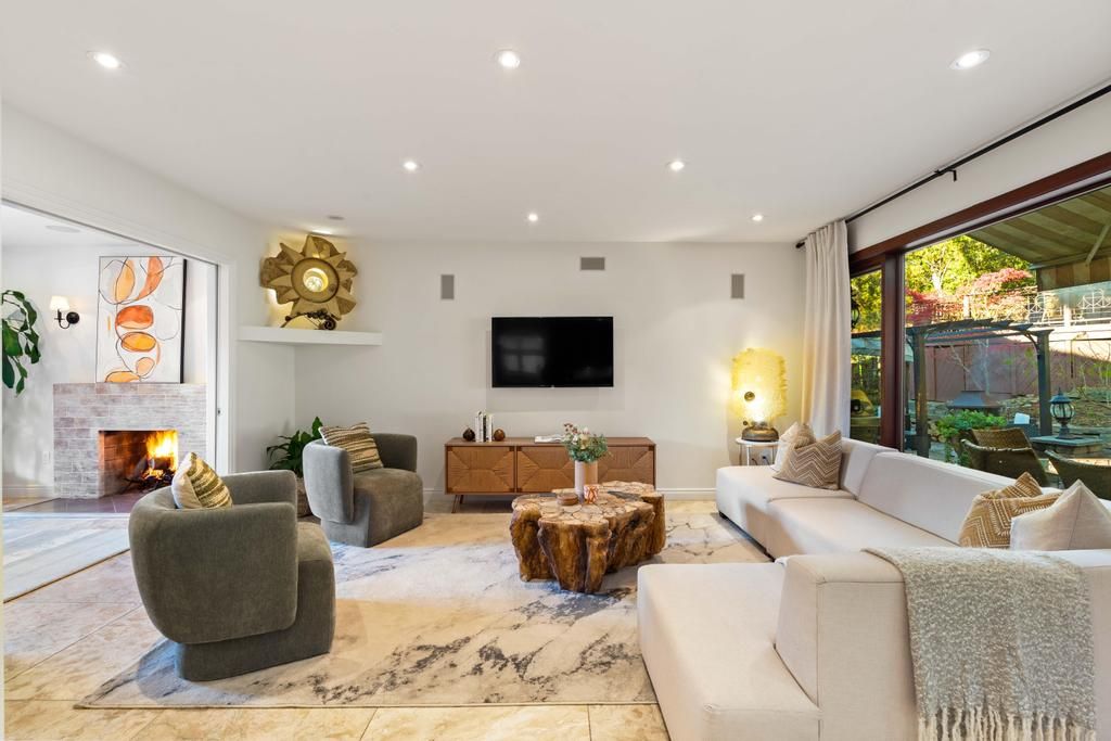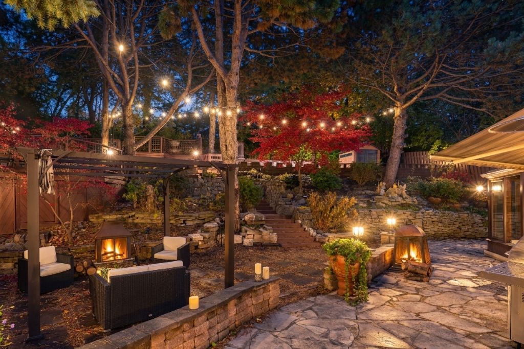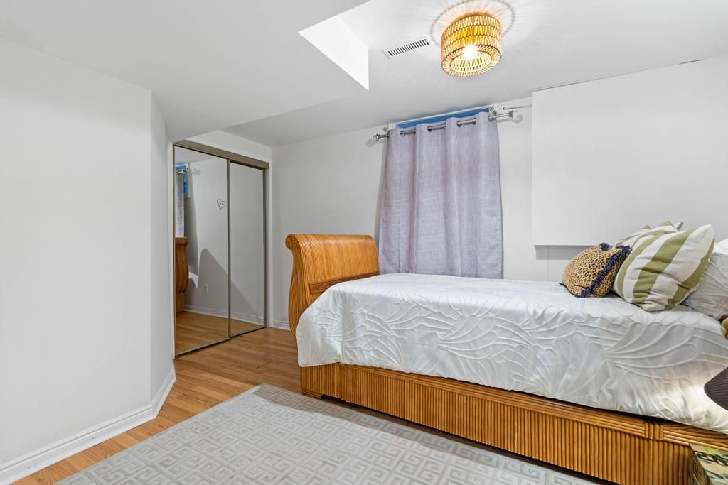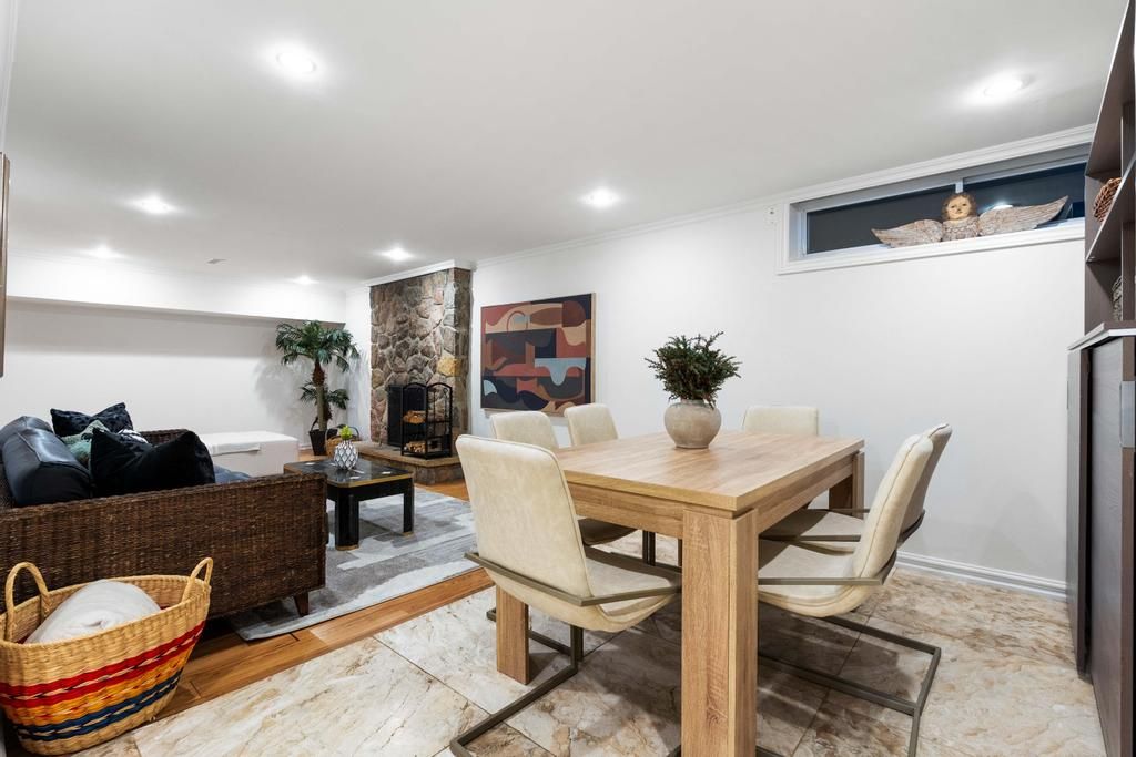 Step into your private urban oasis with this exceptional home, featuring 3 spacious bedrooms and a versatile 4th den on the 2nd floor, perfect as a nursery, office, or cozy retreat. The primary suite impresses with vaulted ceilings, a custom wood-burning fireplace, a private balcony, and a spa-inspired ensuite complete with a built-in sauna and a glass-enclosed oversized shower. Natural light floods the upper hallway through a skylight, creating a warm and inviting atmosphere. At the heart of the home, the chef's kitchen is designed for both family living and entertaining, with built-in appliances, generous stone surfaces, a prep sink, a built-in breakfast nook, and integrated indoor sonos speakers with dedicated wall controls. Sunlight fills the adjacent dining room and sunroom, offering year-round views of the lush, meticulously curated gardens. Additional highlights include a private main floor office with its own wood-burning fireplace, a functional mudroom with built-in bench, a walk-in closet, abundant storage throughout, and a fully equipped lower-level in-law or nanny suite with its own kitchen, fireplace, living space, and 5th bedroom. Three wood-burning fireplaces throughout the home add warmth and charm to every room. The resort-style backyard is a true entertainer's dream, featuring a heated pool, cabana, two fire pits, an outdoor speaker, a natural gas bbq, multiple seating and dining areas, and beautifully landscaped gardens that ensure privacy and serenity. Set on a rare pie-shaped lot spanning almost 1/3 acre, over 200 feet deep and opening to a 121 ft rear lot line, this property perfectly balances the tranquility of a private retreat with the convenience of city living, just moments from highways, fairview mall, the subway, parks, and top-rated schools. An extraordinary offering not to be missed, schedule your private tour today.
