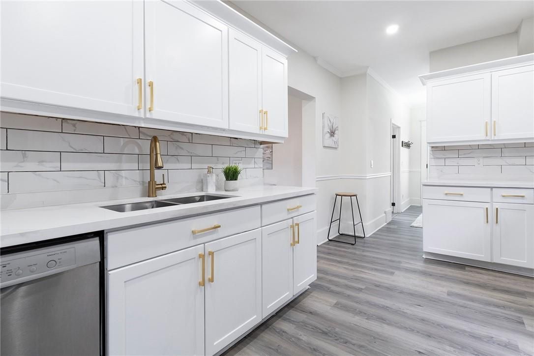 • Large eat-in kitchen with modern cabinets and stainless steel appliances.