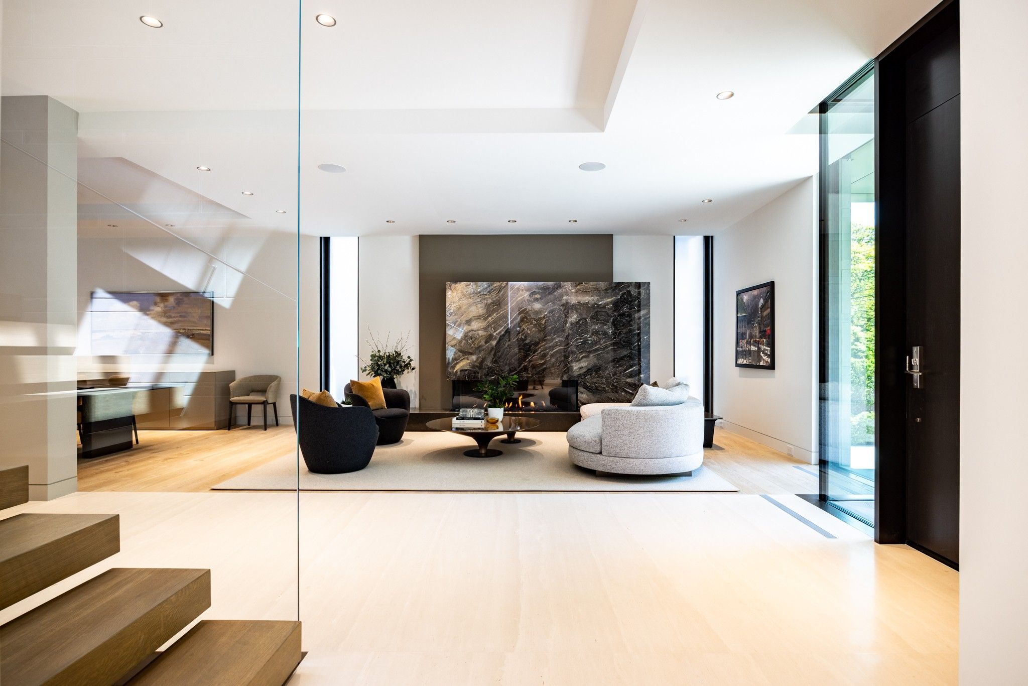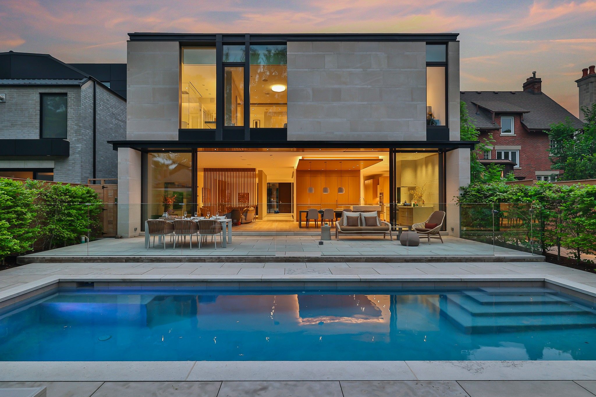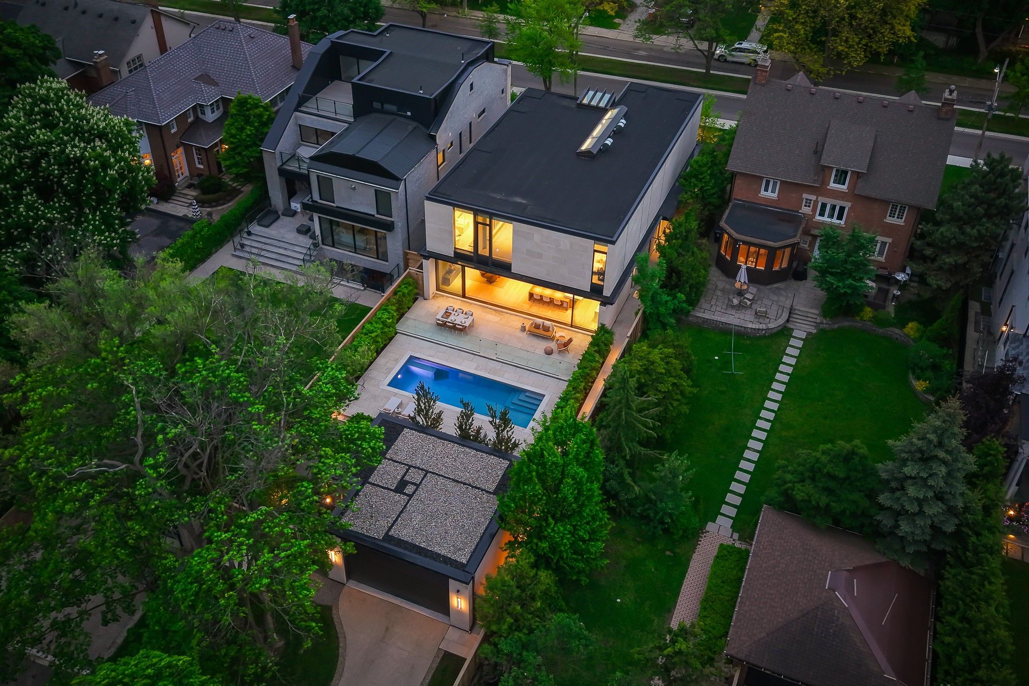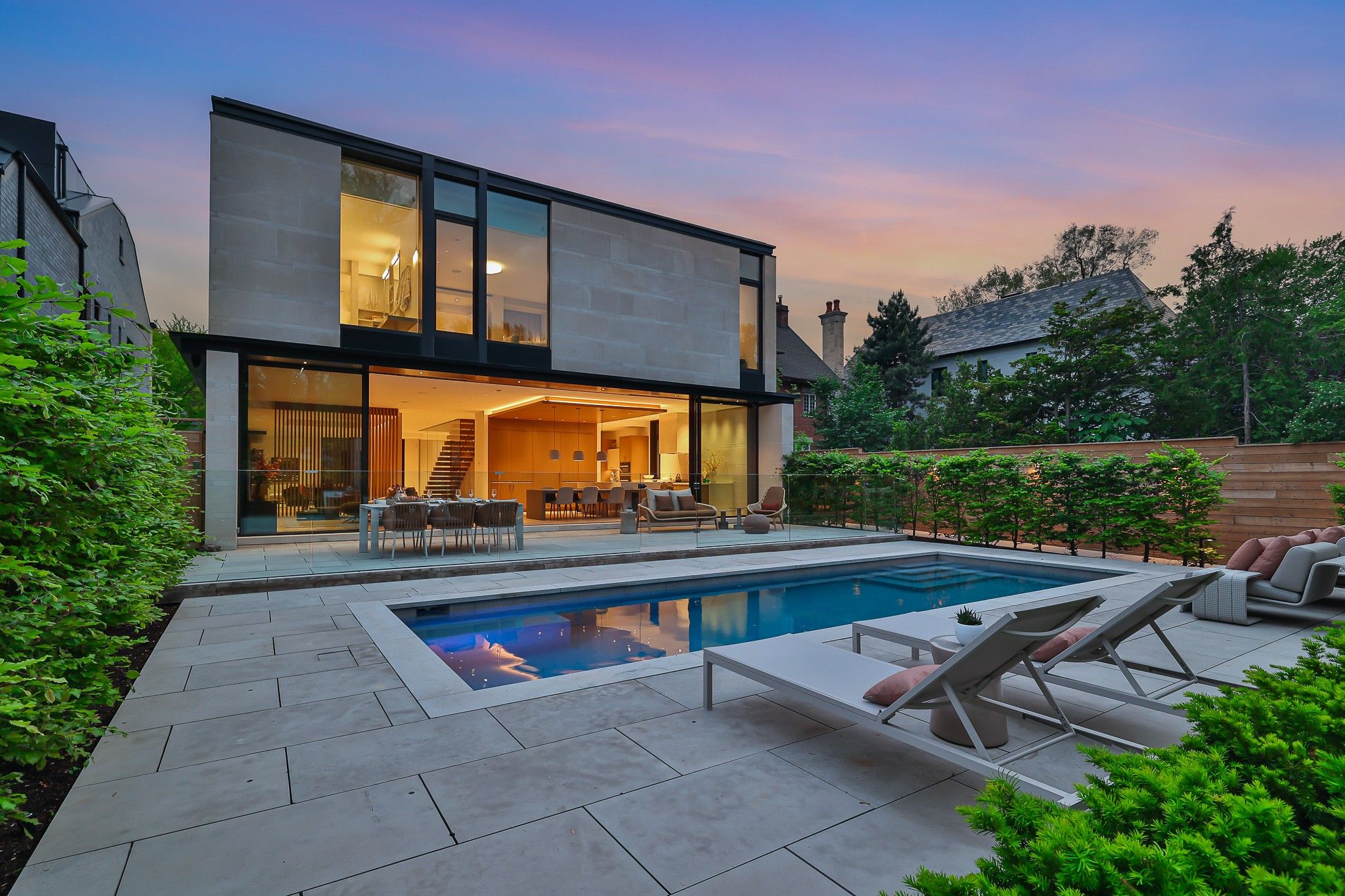 Infinity house is a masterclass in contemporary architecture - custom-built with state-of-the-art construction techniques and details to deliver a true high-performance house. This luxury home, with 4+1 bedrooms & 8 bathrooms (7,655 sf in total), offers the discerning buyer meticulously conceived interiors that harmonize natural materials with modern elements for the utmost in refined living. This coveted north toronto location, with its unique blvd & mature tree canopy, is within walking distance to yonge lawrence village & the greens of rosedale golf club. Handcrafted bronze panels fronting the house signal a sublime presence on the street. The entry gallery captures the eye with a stunning living room fireplace with marble slab surround & stairs floating between soaring glass panels & a limestone wall - a true feat of engineering. Reminiscent of the exterior cladding & projecting toward the sky, this imposing feature wall intentionally serves as a central visual anchor. The optimal interior layout flows effortlessly to the professionally designed exteriors through a one-of-a-kind nanawall of sleek glass panels, welcoming an abundance of natural light. The open concept makes clever use of a floating slat wall to create a sense of division for the dining and living rooms without compromising the bright, airy feel. The family room & adjoining chef's kitchen with pantry & servery is the hub of the home overlooking the backyard oasis with heated pool, terraces & gardens. A study, two powder rooms & a mudroom complete the main level. An elevator opens onto a light-filled 2nd floor, illuminated by custom architectural glazing & leads to 4 bedrooms, including a luxurious primary suite, 4 bathrooms & a well-appointed laundry room. An expansive lower level includes a media/recreation room, custom bar, wine cellar, exercise room with spa steam bath, nanny suite with 3-pc & a 2nd laundry room. Extras: radiant floors, elevator, snowmelt, 2 car heated garage w/lower storage.