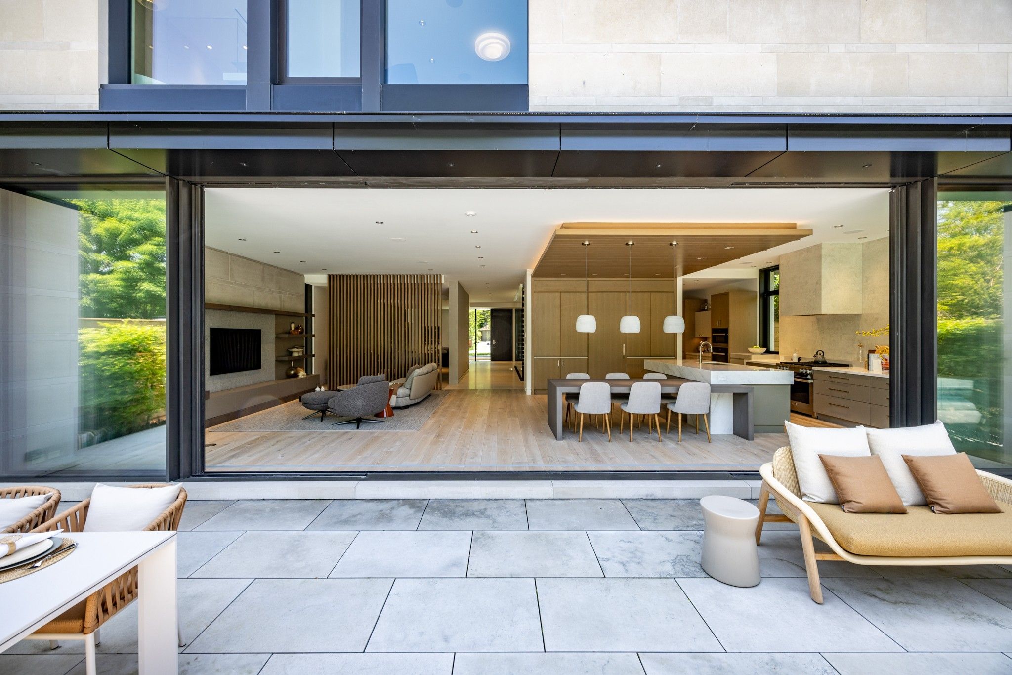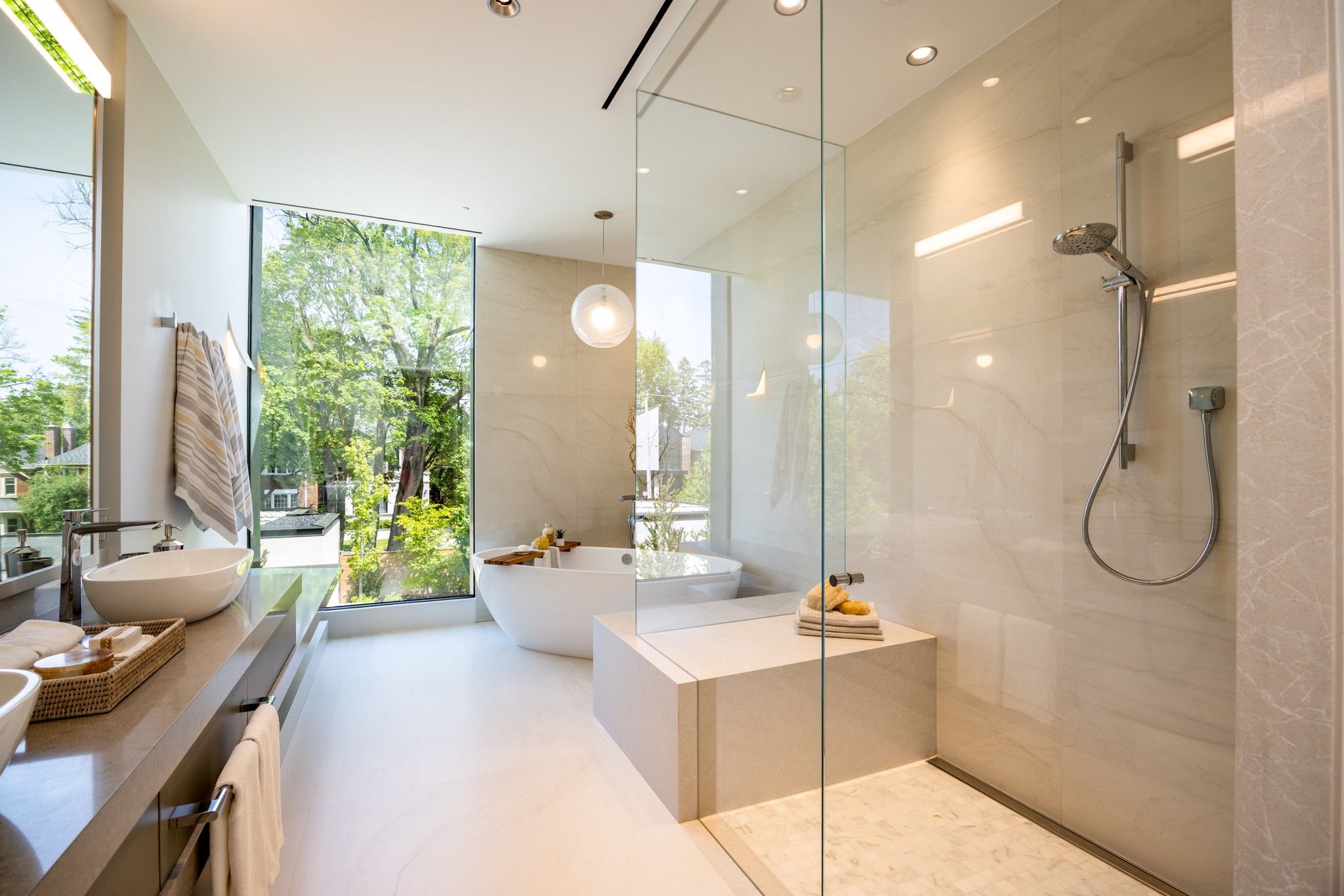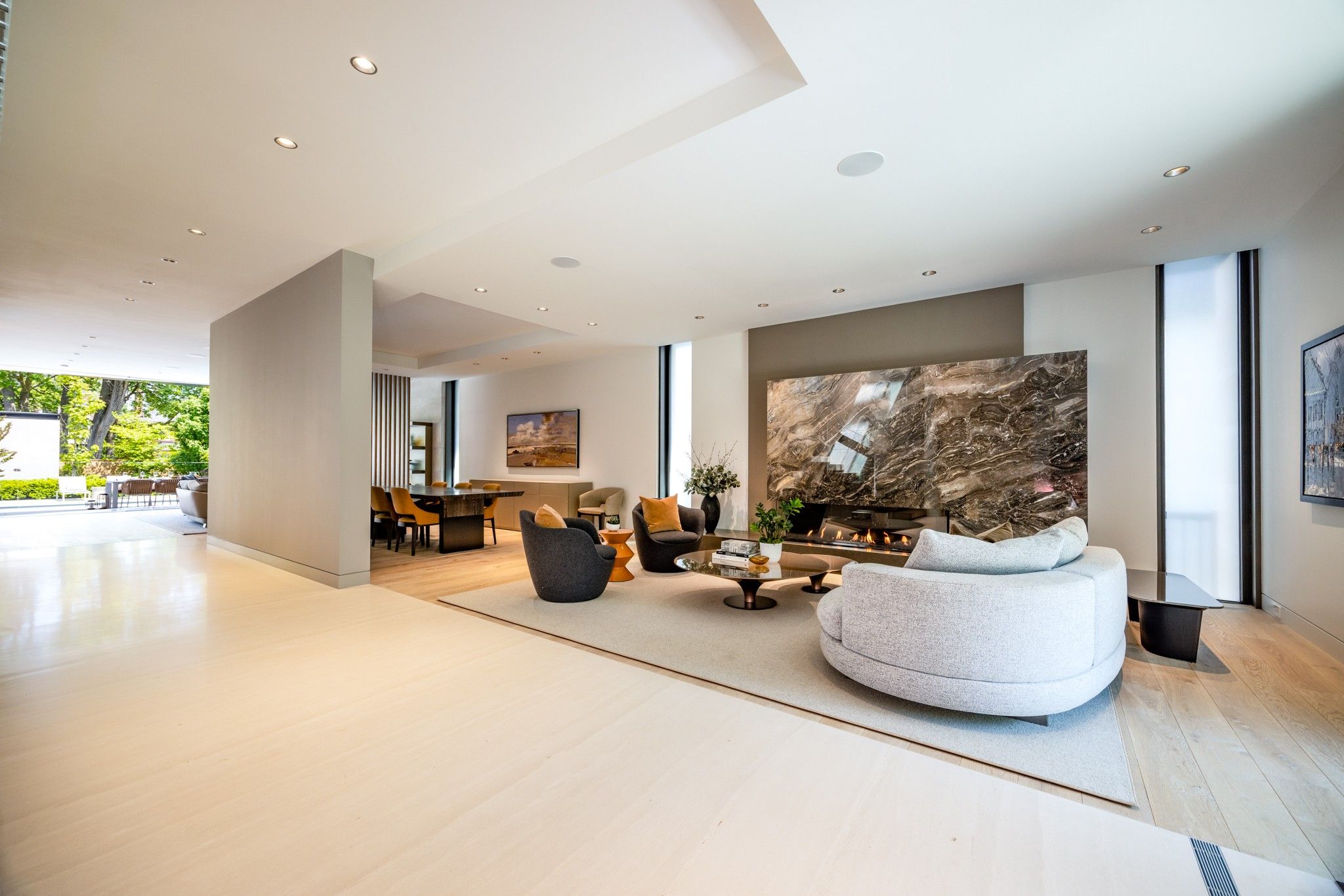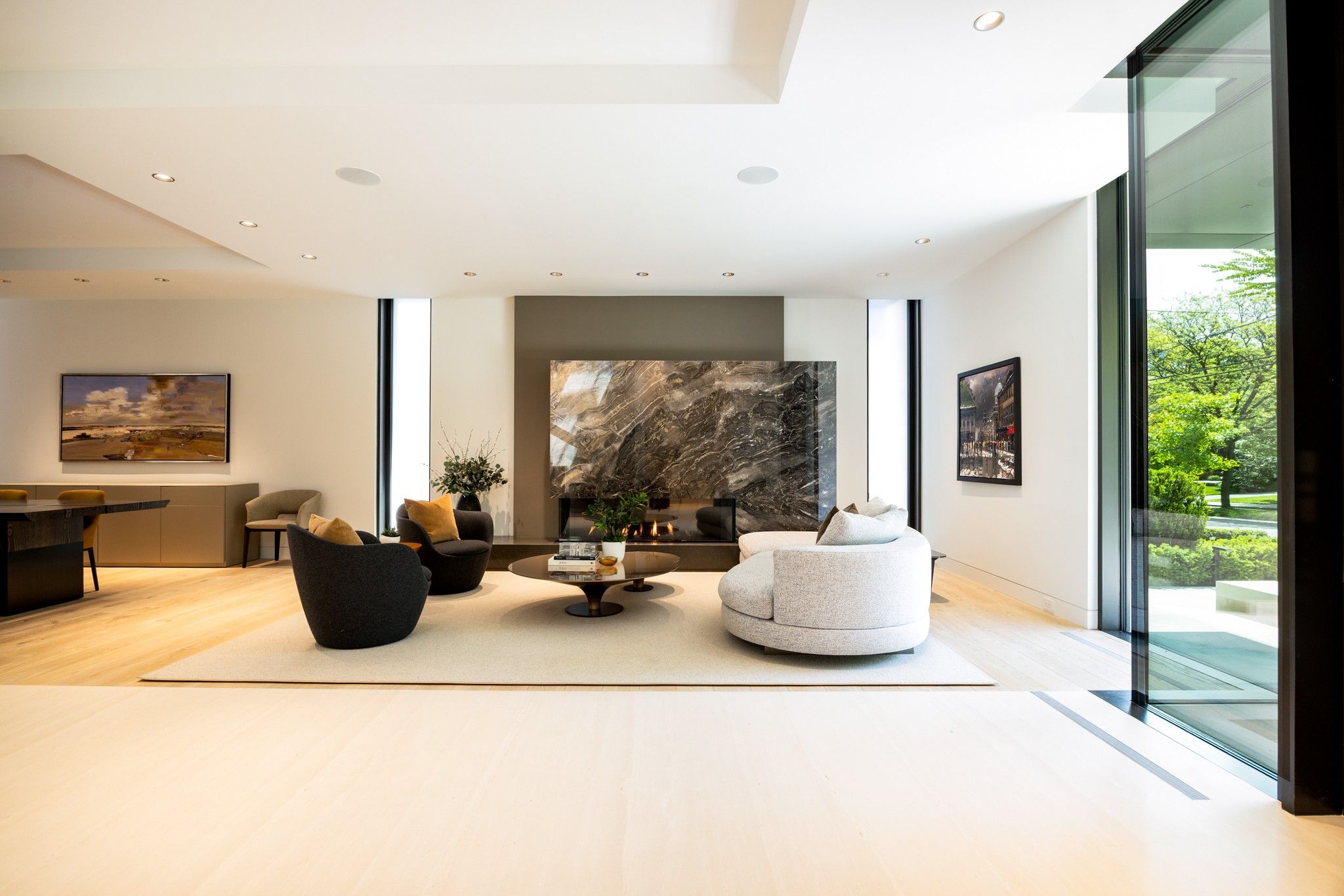 Infinity house is a masterclass in contemporary architecture - custom-built with state-of-the-art construction techniques and details to deliver a true high-performance house. This luxury home, with 4+1 bedrooms & 8 bathrooms (7,655 sf in total), offers the discerning buyer meticulously conceived interiors that harmonize natural materials with modern elements for the utmost in refined living. This coveted north toronto location, with its unique blvd & mature tree canopy, is within walking distance to yonge lawrence village & the greens of rosedale golf club. Handcrafted bronze panels fronting the house signal a sublime presence on the street. The entry gallery captures the eye with a stunning living room fireplace with marble slab surround & stairs floating between soaring glass panels & a limestone wall - a true feat of engineering. Reminiscent of the exterior cladding & projecting toward the sky, this imposing feature wall intentionally serves as a central visual anchor. The optimal interior layout flows effortlessly to the professionally designed exteriors through a one-of-a-kind nanawall of sleek glass panels, welcoming an abundance of natural light. The open concept makes clever use of a floating slat wall to create a sense of division for the dining and living rooms without compromising the bright, airy feel. The family room & adjoining chef's kitchen with pantry & servery is the hub of the home overlooking the backyard oasis with heated pool, terraces & gardens. A study, two powder rooms & a mudroom complete the main level. An elevator opens onto a light-filled 2nd floor, illuminated by custom architectural glazing & leads to 4 bedrooms, including a luxurious primary suite, 4 bathrooms & a well-appointed laundry room. An expansive lower level includes a media/recreation room, custom bar, wine cellar, exercise room with spa steam bath, nanny suite with 3-pc & a 2nd laundry room. Extras: radiant floors, elevator, snowmelt, 2 car heated garage w/lower storage.