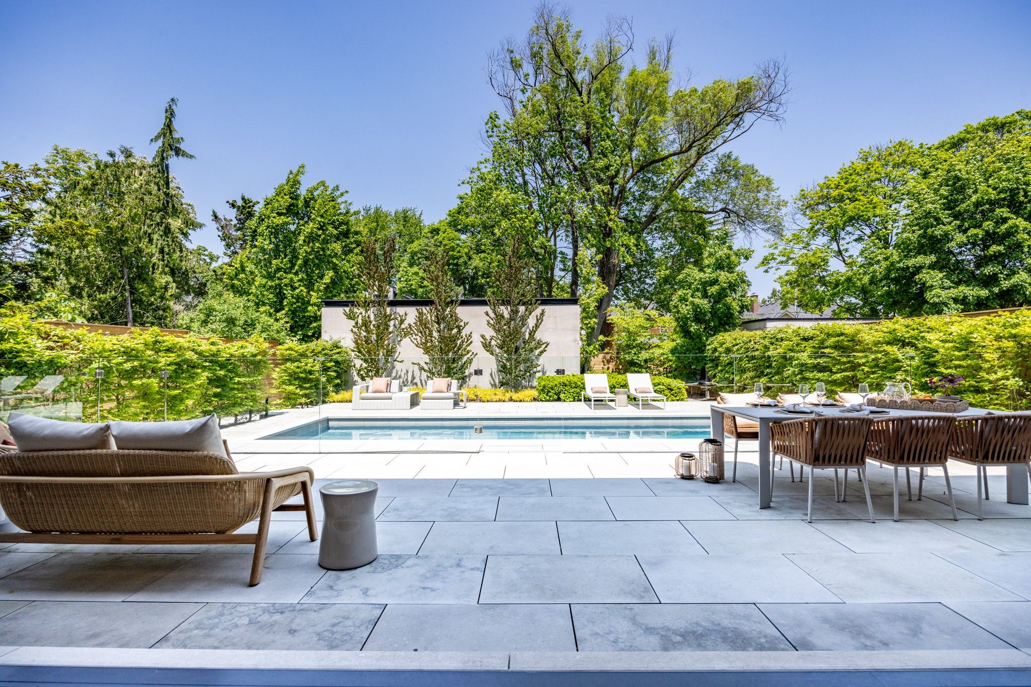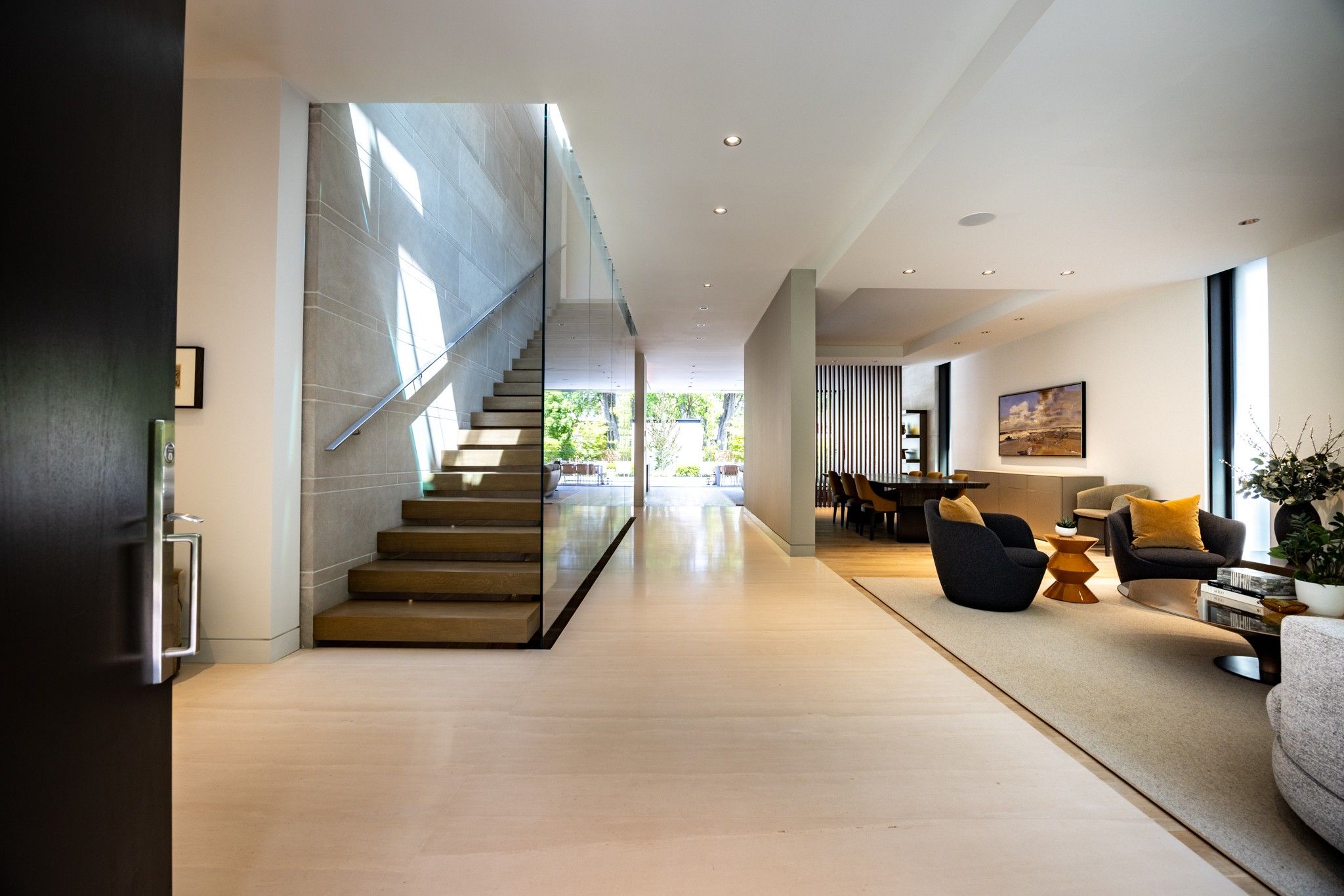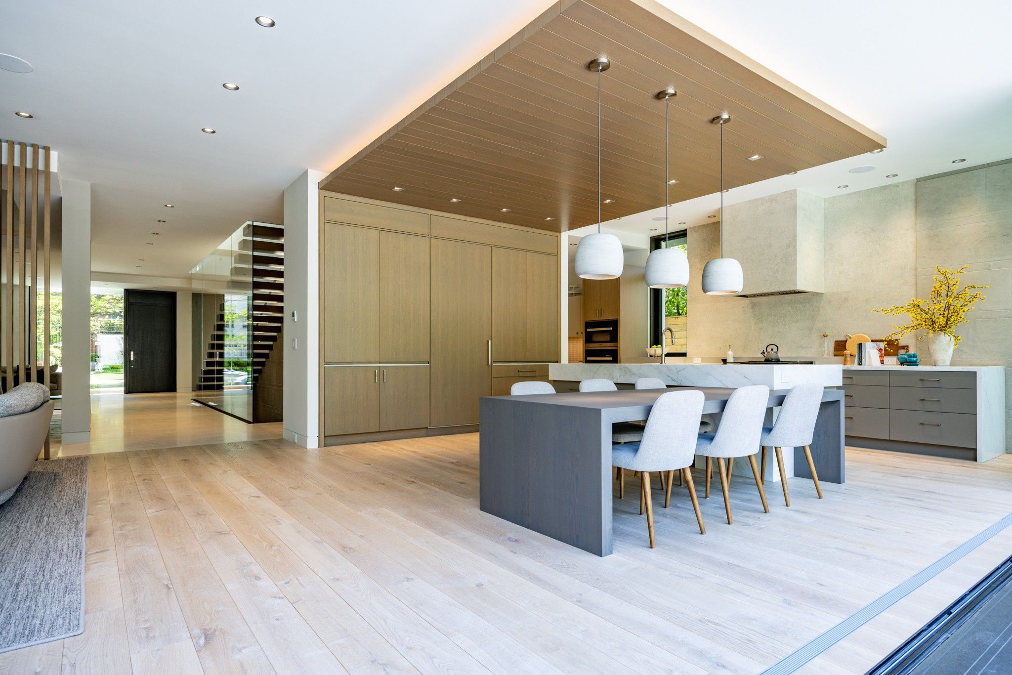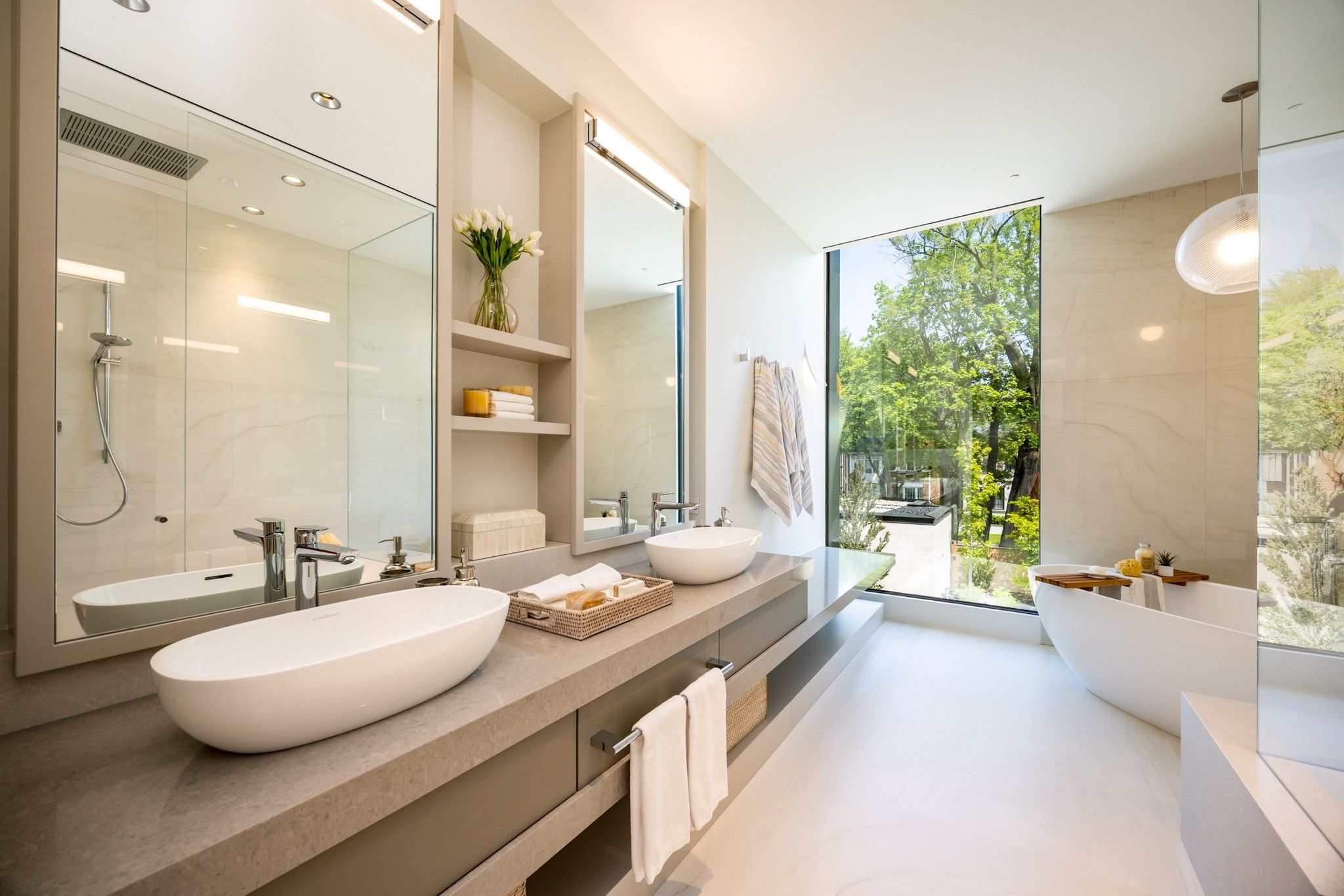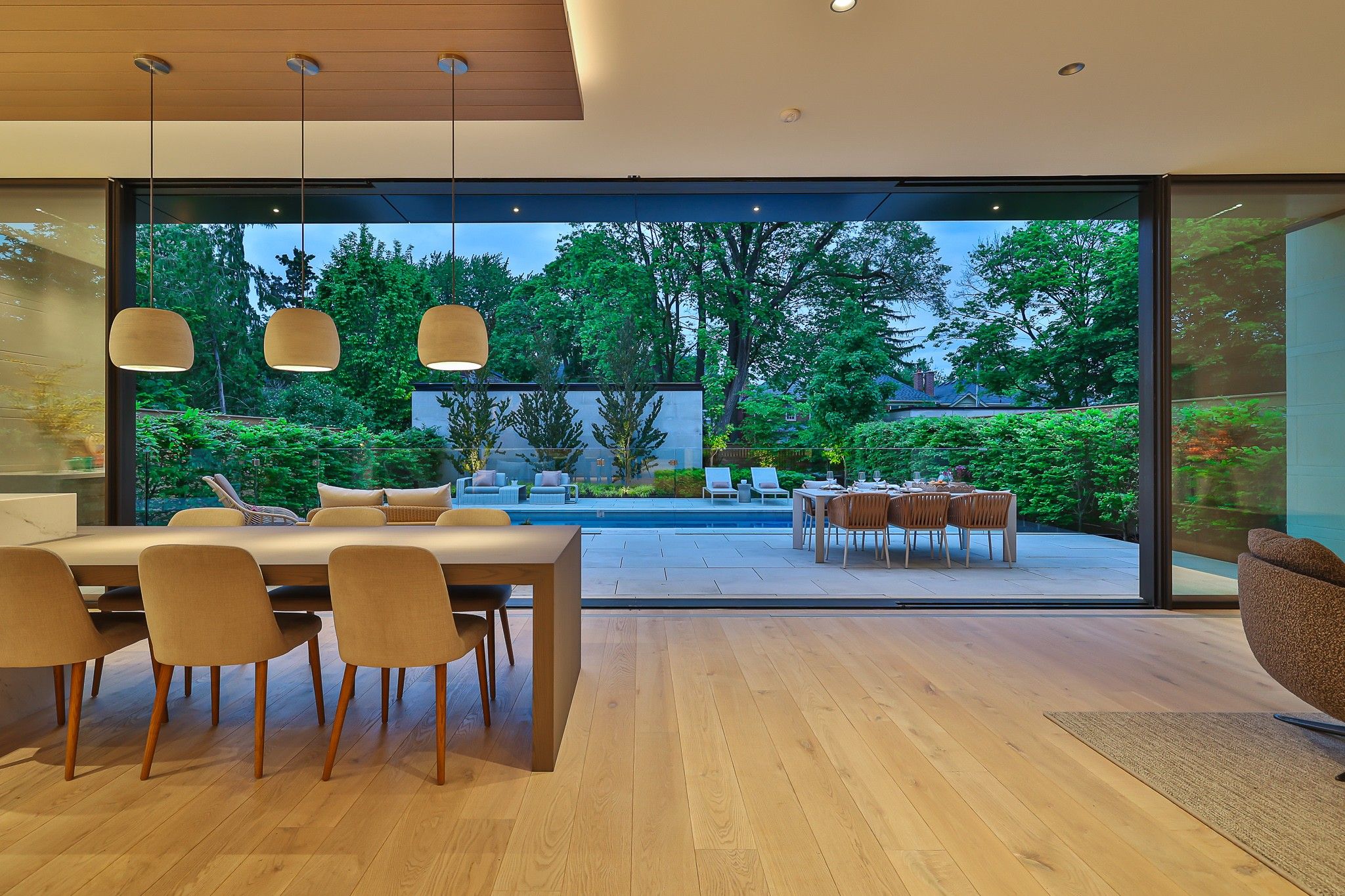 Infinity house is a masterclass in contemporary architecture - custom-built with state-of-the-art construction techniques and details to deliver a true high-performance house. This luxury home, with 4+1 bedrooms & 8 bathrooms (7,655 sf in total), offers the discerning buyer meticulously conceived interiors that harmonize natural materials with modern elements for the utmost in refined living. This coveted north toronto location, with its unique blvd & mature tree canopy, is within walking distance to yonge lawrence village & the greens of rosedale golf club. Handcrafted bronze panels fronting the house signal a sublime presence on the street. The entry gallery captures the eye with a stunning living room fireplace with marble slab surround & stairs floating between soaring glass panels & a limestone wall - a true feat of engineering. Reminiscent of the exterior cladding & projecting toward the sky, this imposing feature wall intentionally serves as a central visual anchor. The optimal interior layout flows effortlessly to the professionally designed exteriors through a one-of-a-kind nanawall of sleek glass panels, welcoming an abundance of natural light. The open concept makes clever use of a floating slat wall to create a sense of division for the dining and living rooms without compromising the bright, airy feel. The family room & adjoining chef's kitchen with pantry & servery is the hub of the home overlooking the backyard oasis with heated pool, terraces & gardens. A study, two powder rooms & a mudroom complete the main level. An elevator opens onto a light-filled 2nd floor, illuminated by custom architectural glazing & leads to 4 bedrooms, including a luxurious primary suite, 4 bathrooms & a well-appointed laundry room. An expansive lower level includes a media/recreation room, custom bar, wine cellar, exercise room with spa steam bath, nanny suite with 3-pc & a 2nd laundry room. Extras: radiant floors, elevator, snowmelt, 2 car heated garage w/lower storage.
