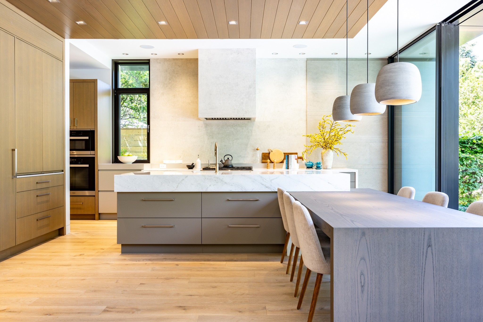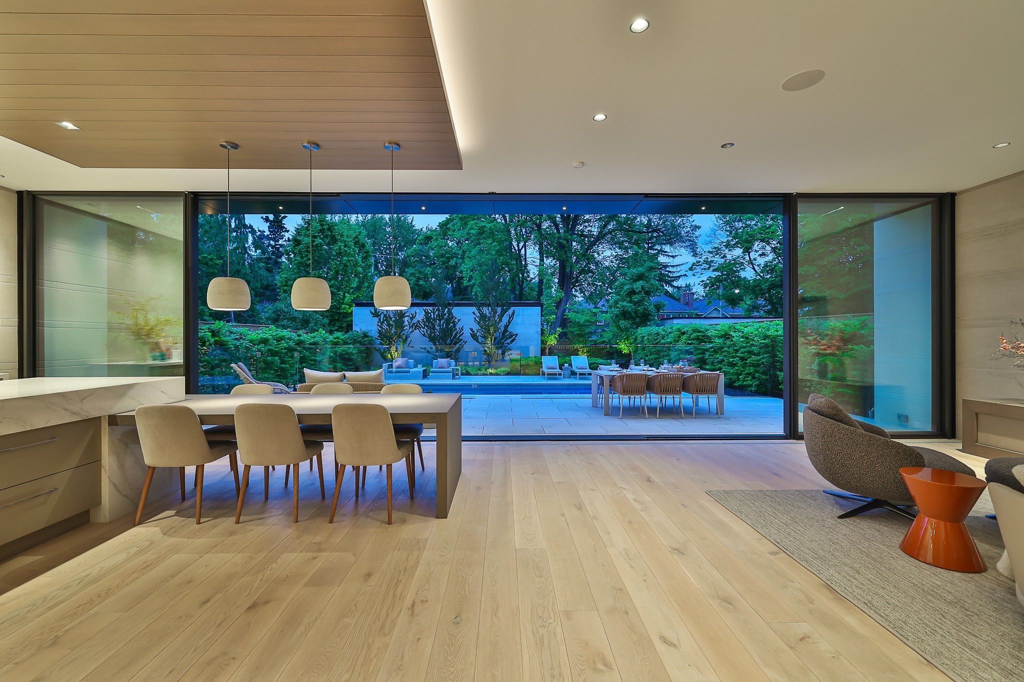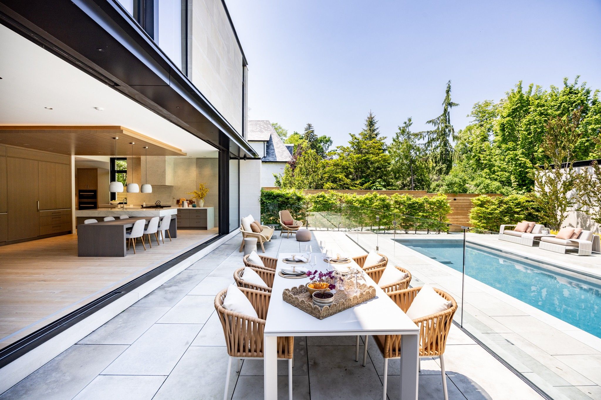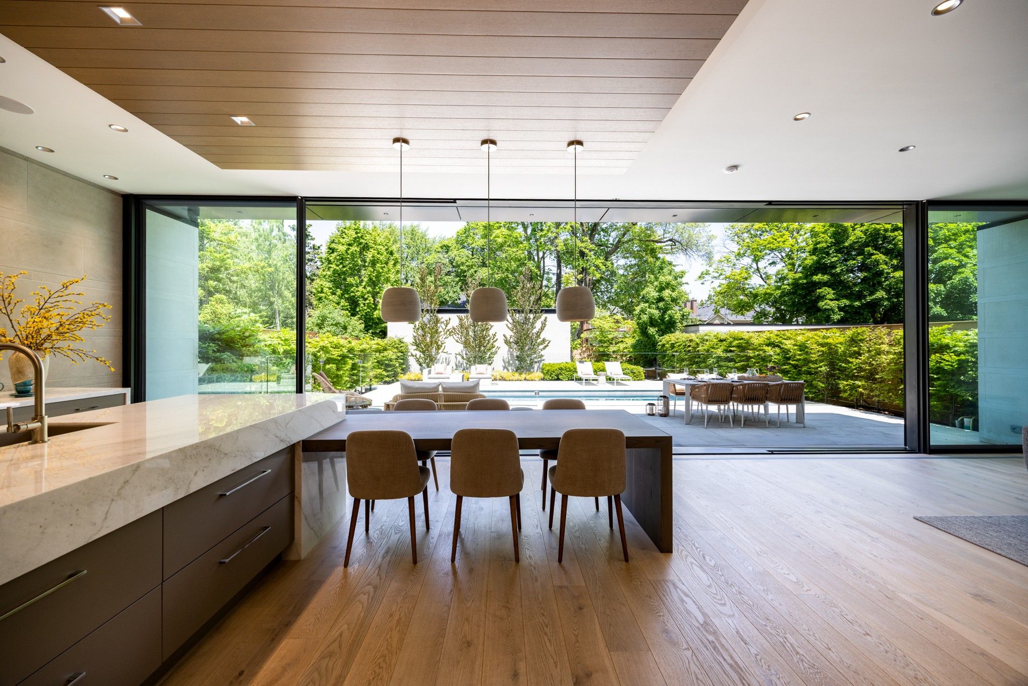 • Sunny family room and chef's kitchen overlook a backyard oasis with a heated pool.