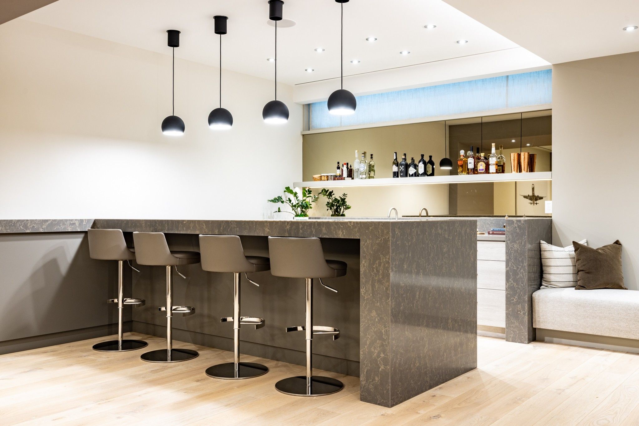 • Expansive lower level includes media room, custom bar, gym, and nanny suite.