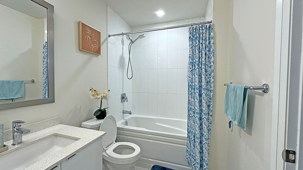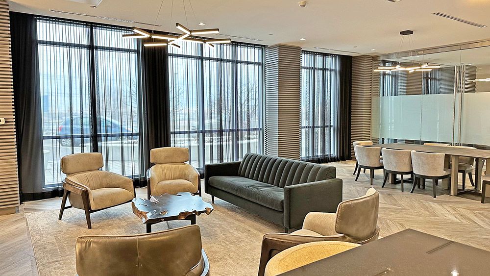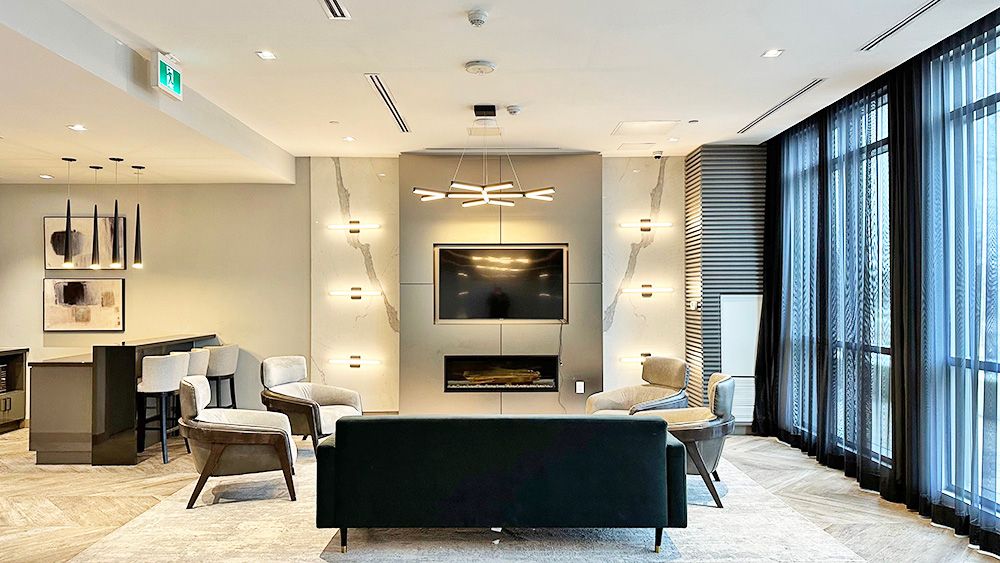 • Bright one-bedroom suite with 9-foot floor-to-ceiling windows for natural light.