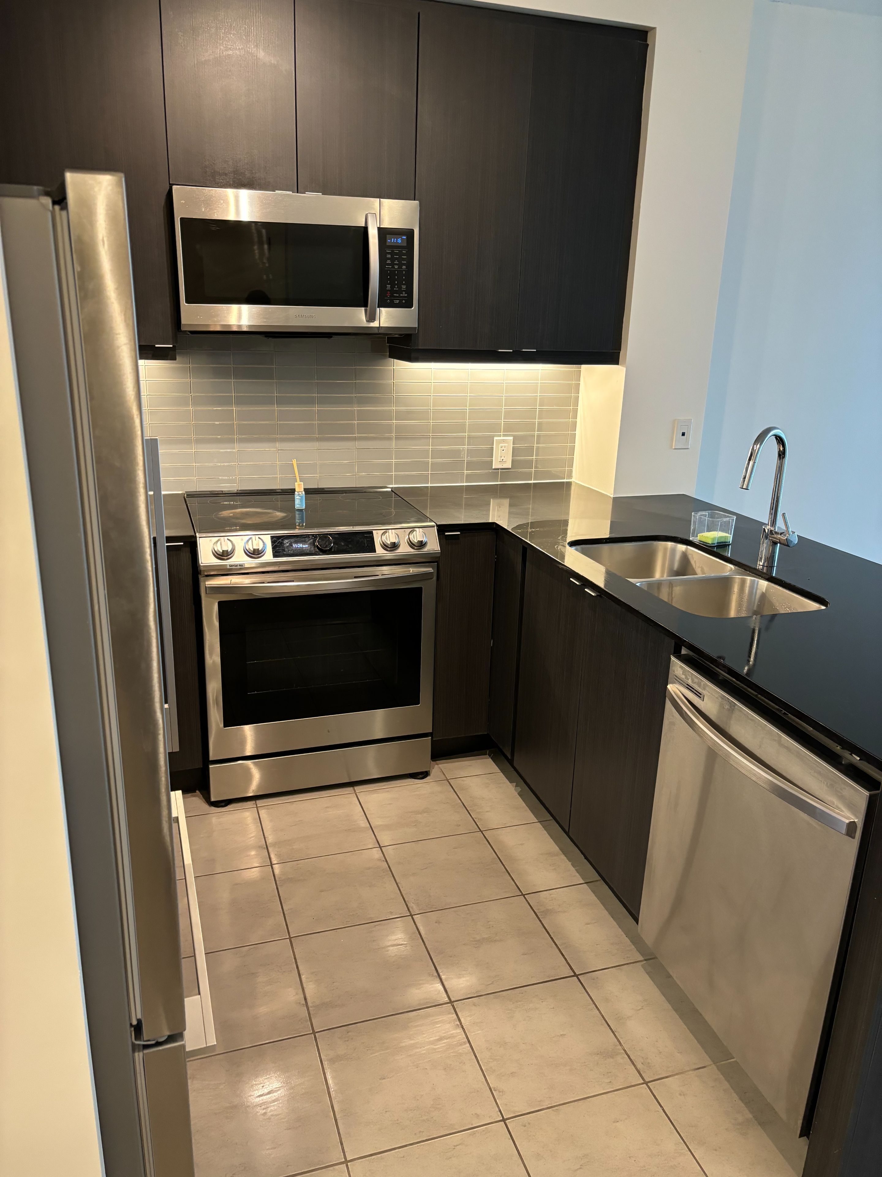 • Modern kitchen featuring stainless steel appliances and granite countertops.