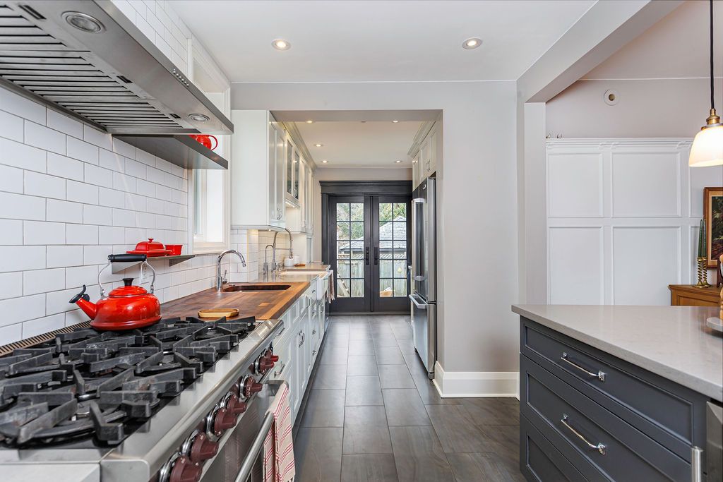 • Upgraded kitchen with a 6 burner Wolf gas range and ample space.