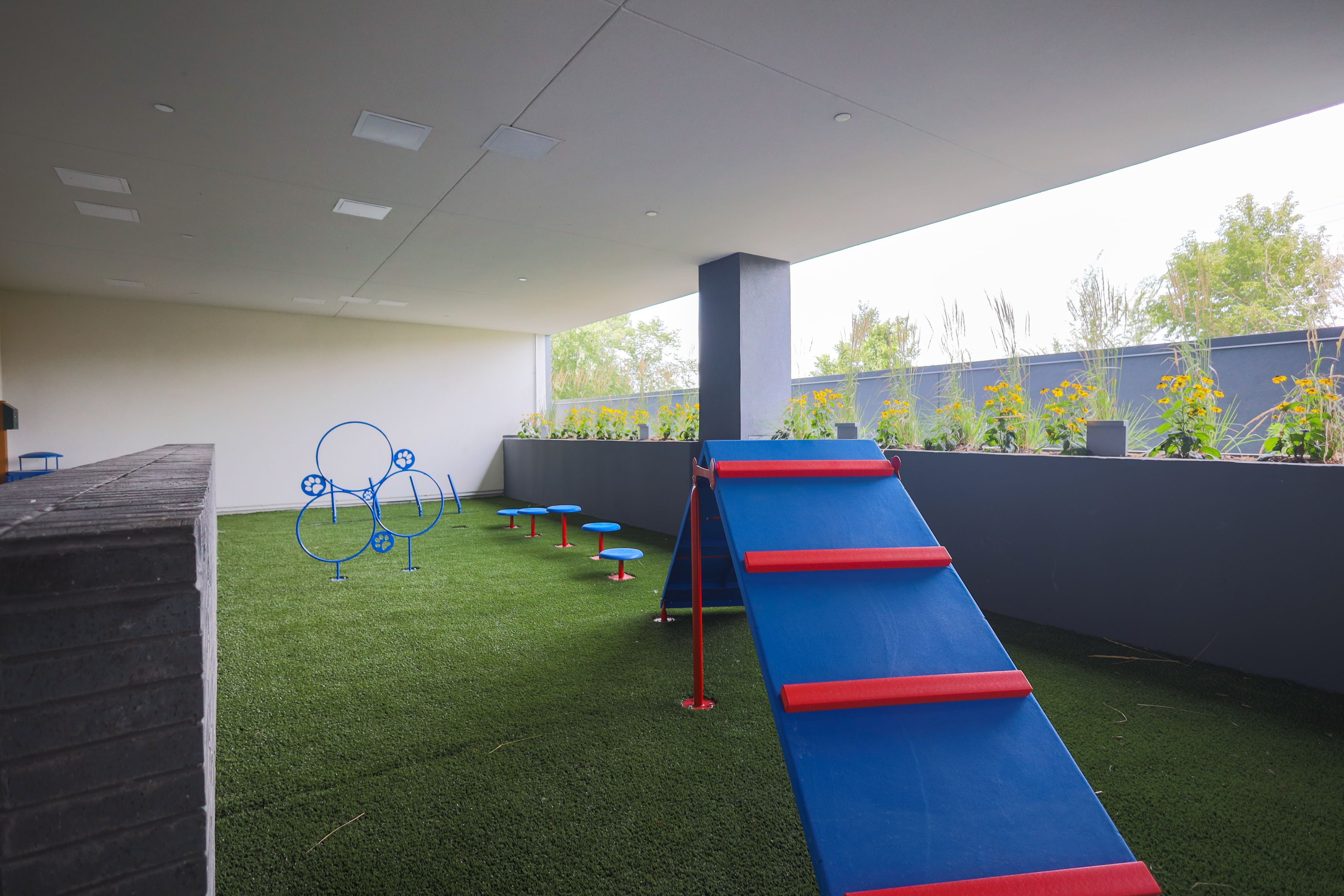 • European-inspired courtyard with BBQ terrace and pet lounge.