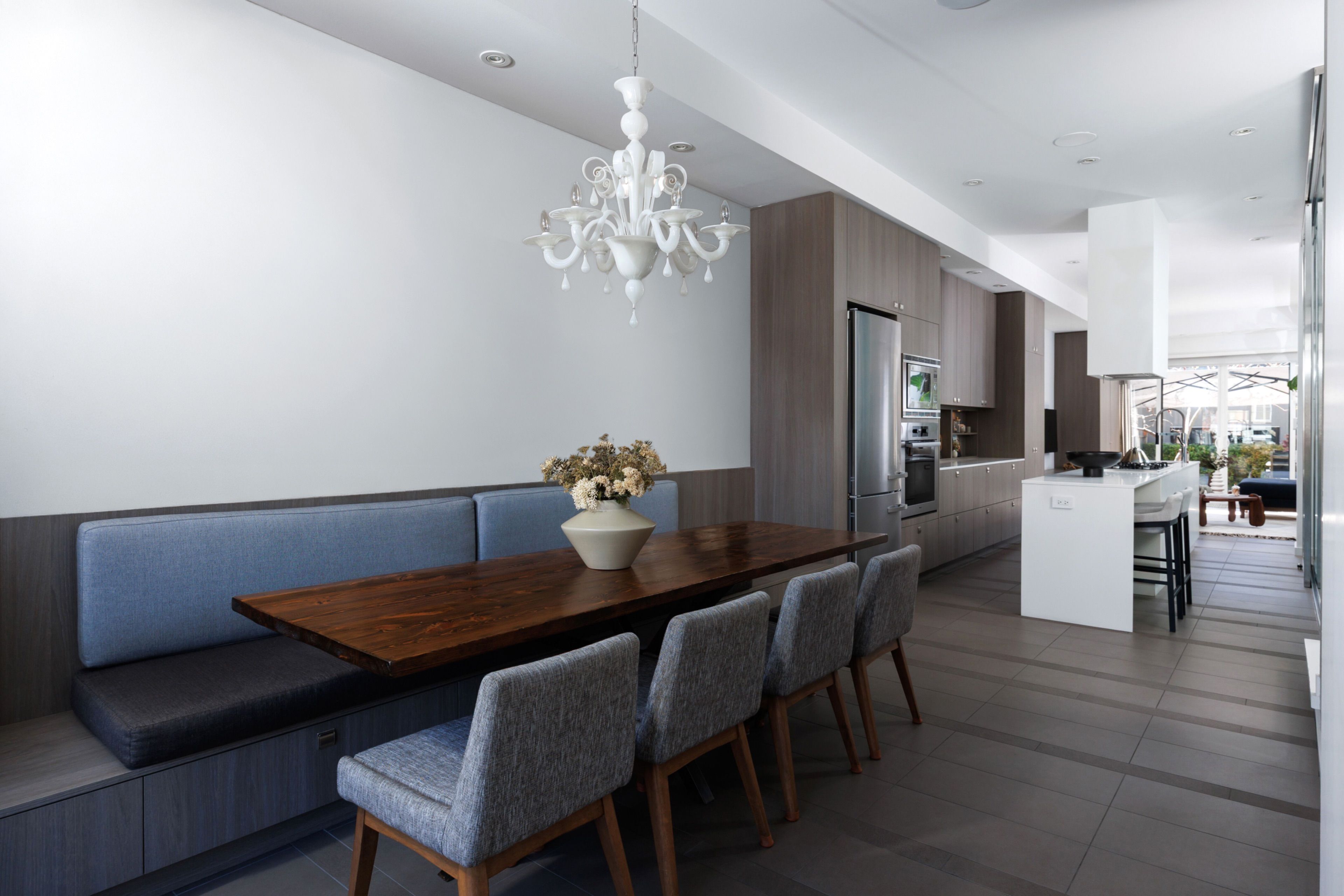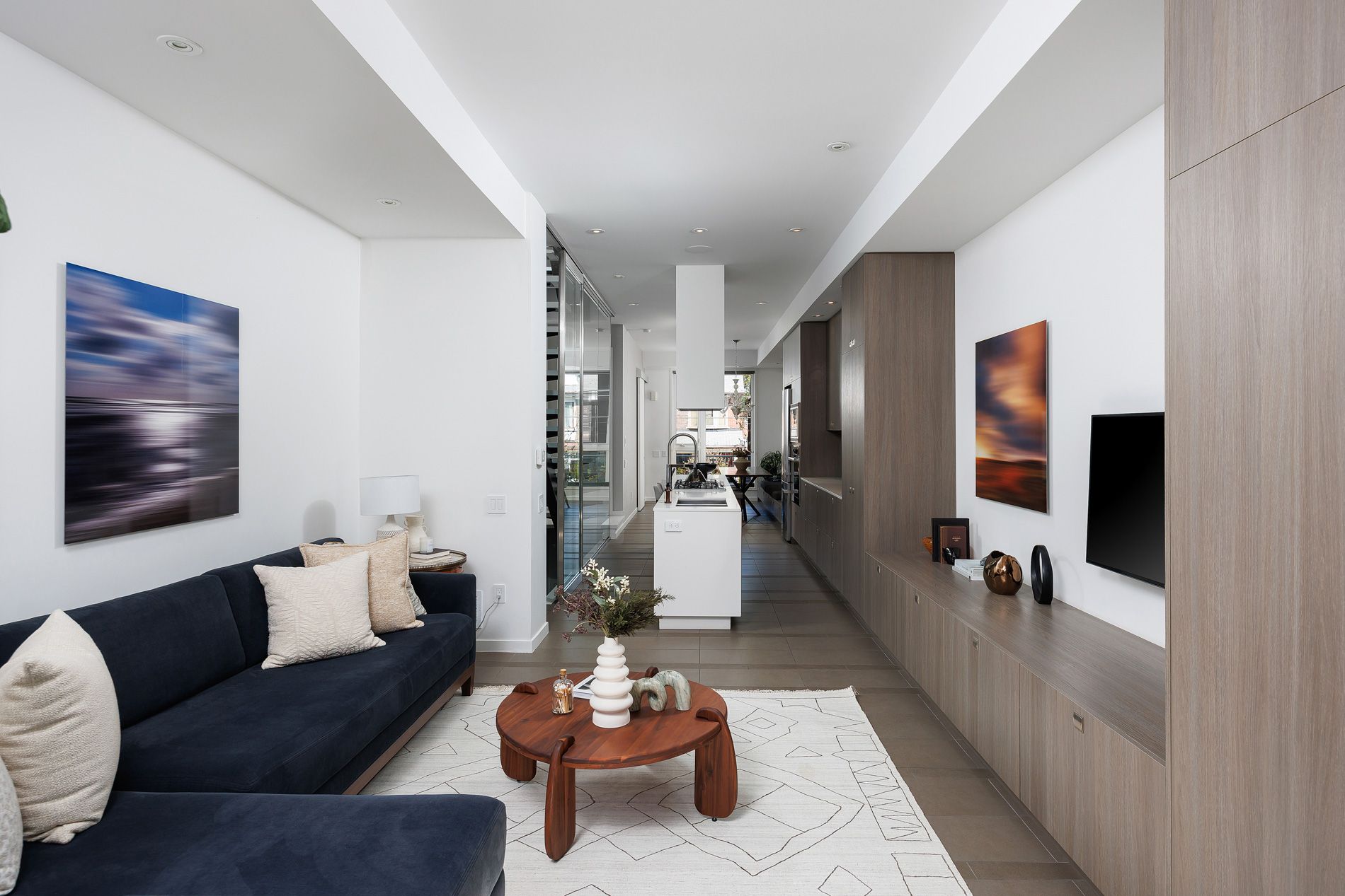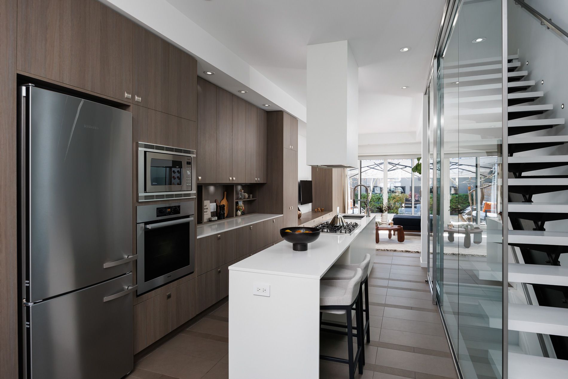 • Refined chef's kitchen with quartz surfaces and integrated appliances.