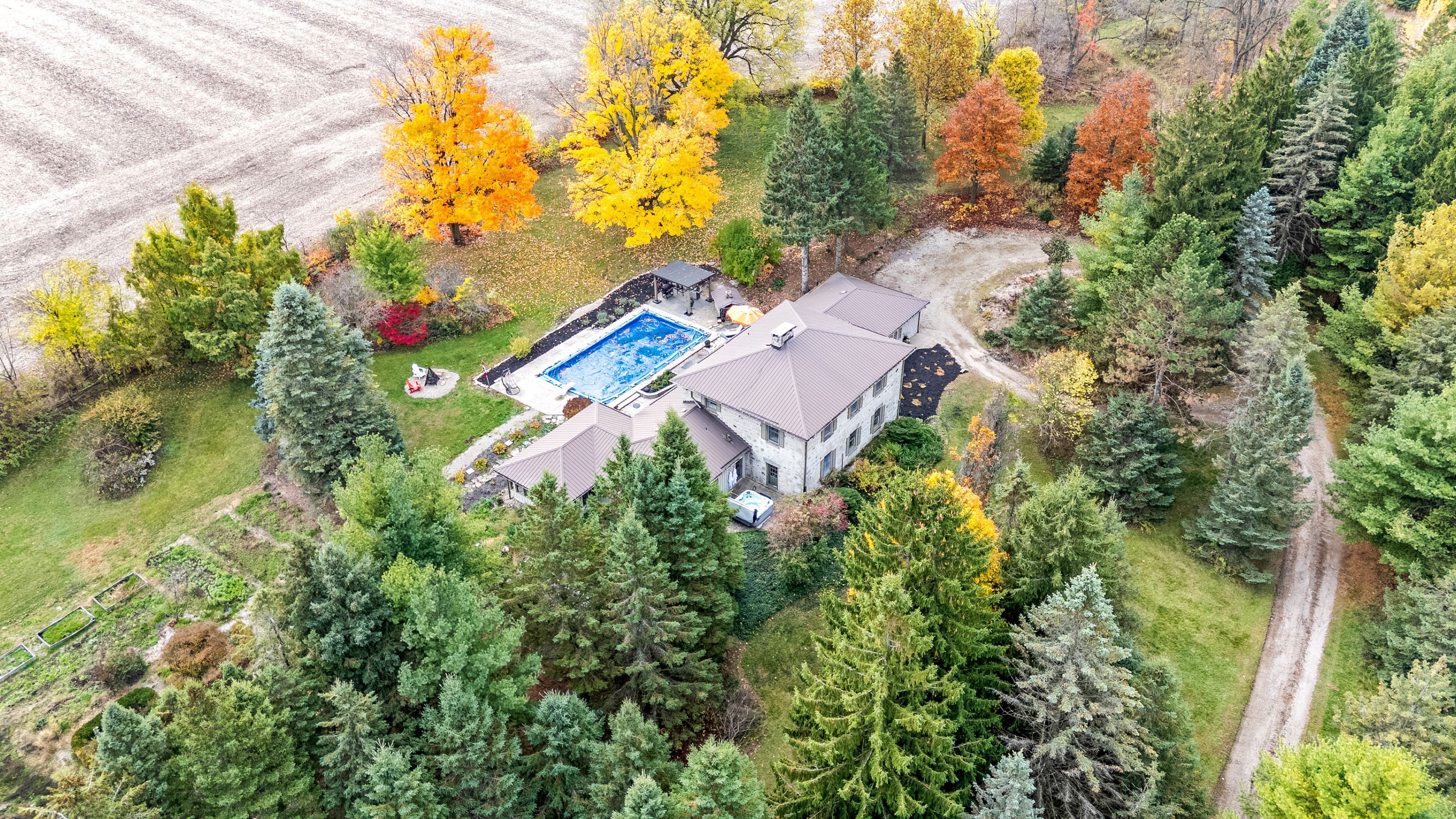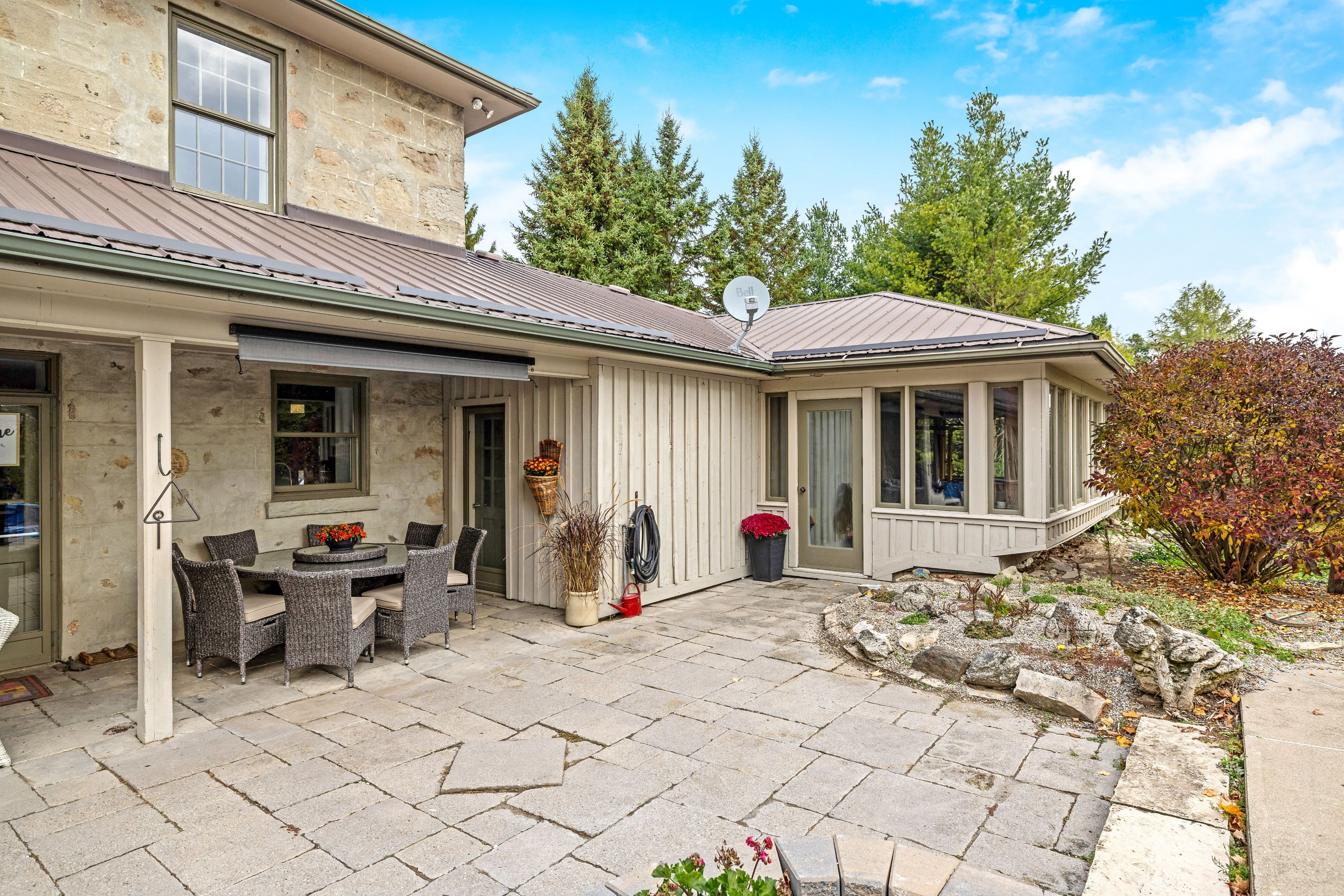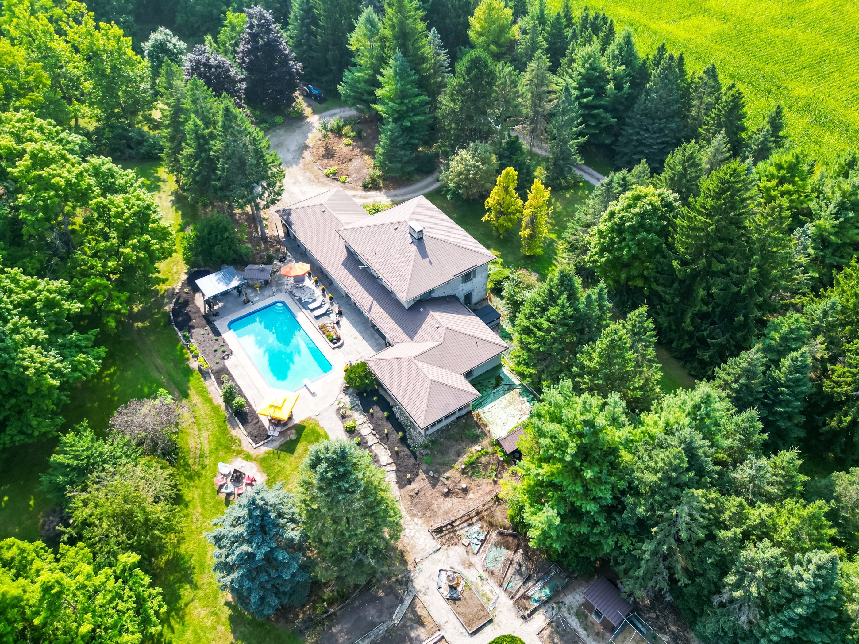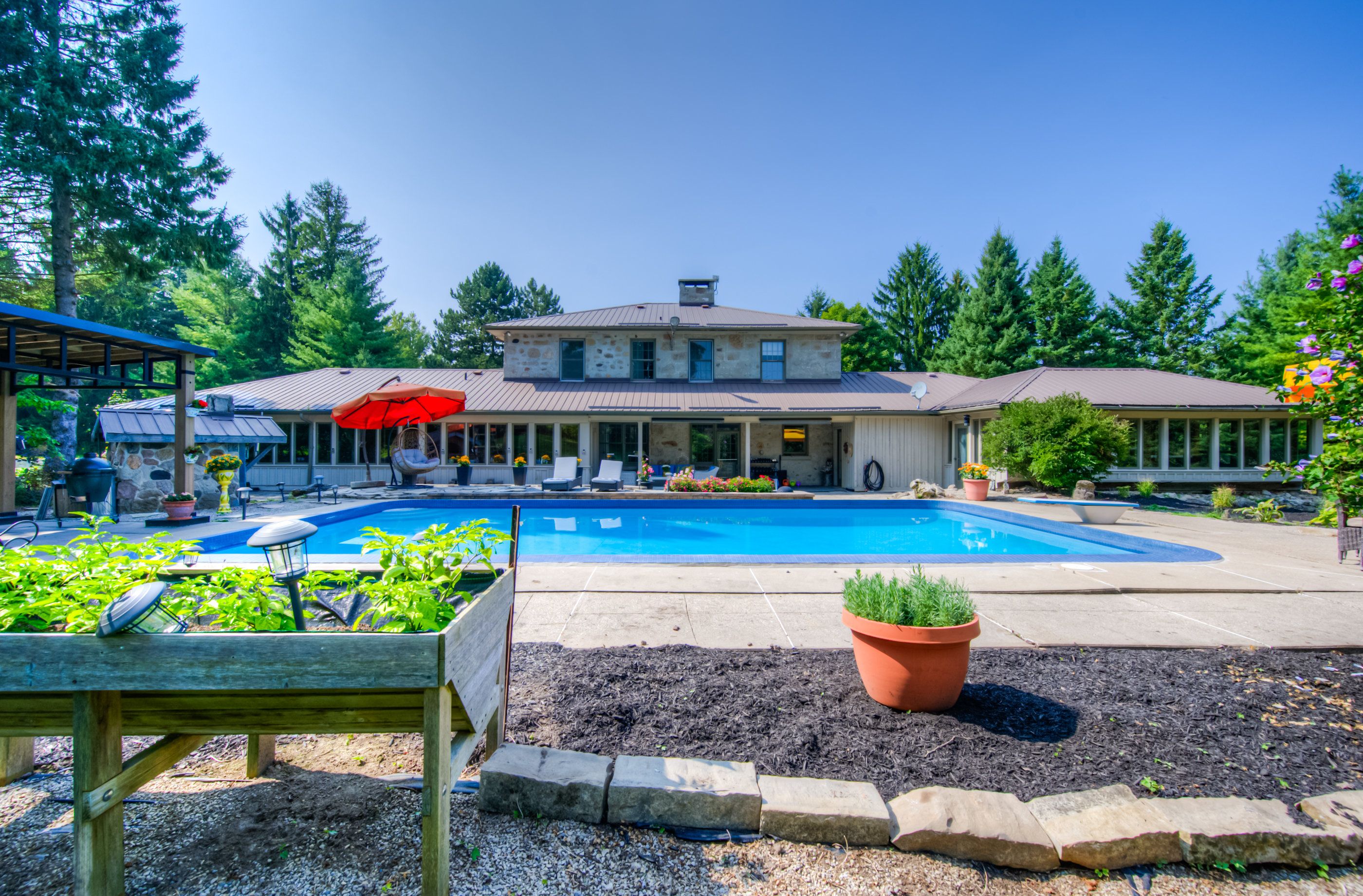 This circa 1875 fieldstone farmhouse has been thoughtfully redesigned by architect grant a. Whatmough and is set on approximately 99 acres behind a gated entry. Maintaining classic charm and modern convenience, this property is ready for a new family to carry on the tradition. The main floor welcomes you with a double door entry leading into a spacious open concept kitchen and large living area highlighted by a stone fireplace and deep windowsills. The kitchen features corian counters, stainless steel appliances, a center island, and walkout access to a covered stone patio and in ground pool. Enjoy cozy breakfasts by the wood burning fireplace or host larger gatherings in the formal dining room. A rare main floor primary suite offers hardwood floors and a walkout through double french doors to a sunroom with heated floors overlooking the perennial filled backyard and pool. The spa style ensuite includes heated tile floors, a double glass shower, and a soaker tub. Upstairs, you will find four bright and spacious bedrooms, each with closets and windows overlooking the private property. Along with the added ceiling height, this level features two updated baths, upper level laundry, and generous closet space. Outdoor living is highlighted by a 20 x 40 geothermal heated marbelite pool with diving board, a flagstone patio, and a covered entertainment area complete with a pizza oven and cooking space. A heritage post and beam barn with hayloft, a secondary garage or shed, and a silo enhance the property's charm. Mechanically, the home offers dual geothermal systems for the house and pool, radiant in floor heating, two drilled wells, and an active lease on approximately 52 workable acres. Trails and a 21 acre woodlot provide endless opportunities for exploration. This one of a kind rural retreat is just minutes from town amenities and ready for its next family to enjoy.