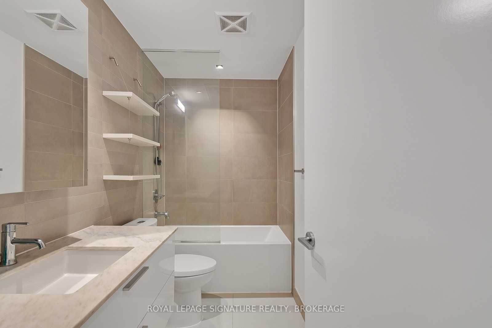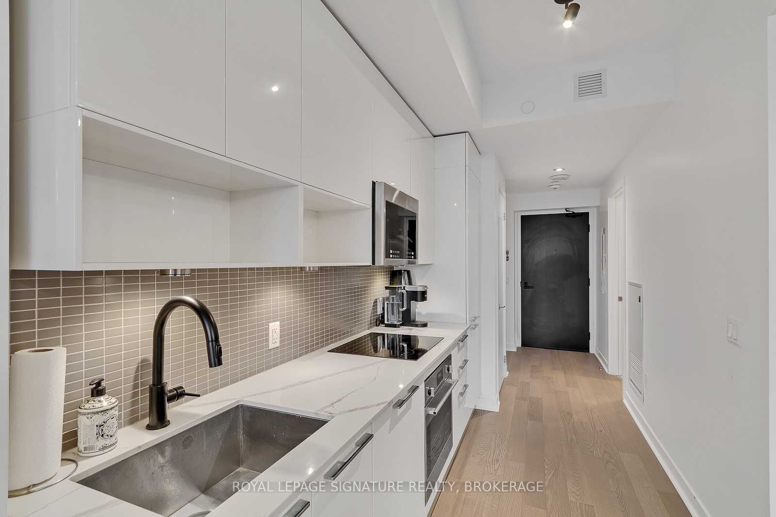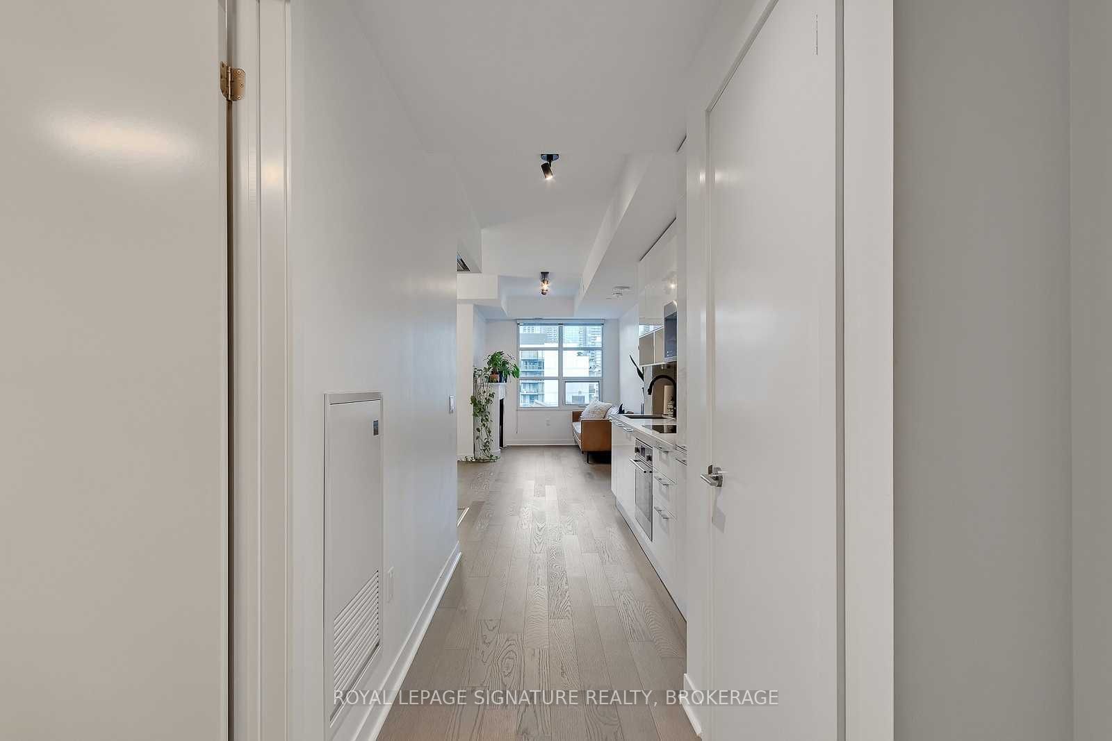 Experience the best of king west living at the highly coveted kingly condos at king & portland. This exceptional 1-bedroom suite offers incredible value with thoughtful upgrades and a spacious open-concept layout designed for modern city living. The suite features expansive new york-style warehouse windows, 9-ft smooth ceilings, and wide plank flooring throughout, creating a bright and stylish atmosphere. The custom scavolini kitchen is a standout, complete with full-sized integrated/panelled stainless steel appliances, natural stone counters, subway tile backsplash, and an additional custom pantry for extra storage. The lengthy open-concept living and dining area is perfect for entertaining, enhanced by floor-to-ceiling windows that bring in abundant natural light and offer versatile layout options. The primary bedroom is smartly enclosed with frosted glass sliding doors and features a double closet. Relax in the spa-inspired 4-piece bathroom finished with modern tile, a stone vanity, mirrored medicine cabinet, extra shelving, and a luxury 2-in-1 shower/tub. Step out onto your private balcony to enjoy sensational sunrise views, and take advantage of the included locker for added convenience. Residents enjoy state-of-the-art amenities, including a fitness centre and gym, rooftop deck, party and meeting rooms, and 24-hour concierge. Located just steps from toronto's hottest restaurants, cafes, nightlife, and shopping, this is king west living at its finest. Live like royalty at the kingly.