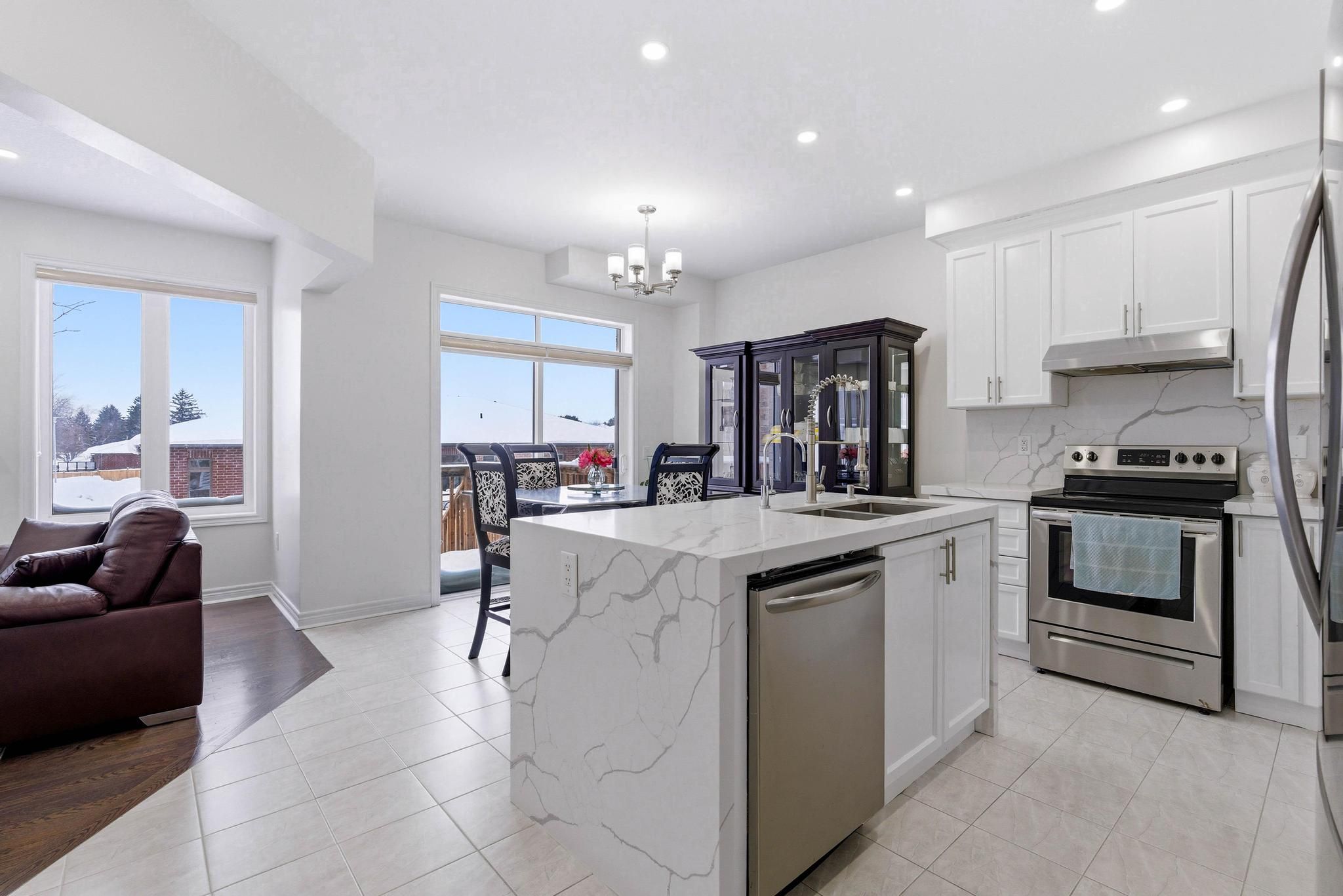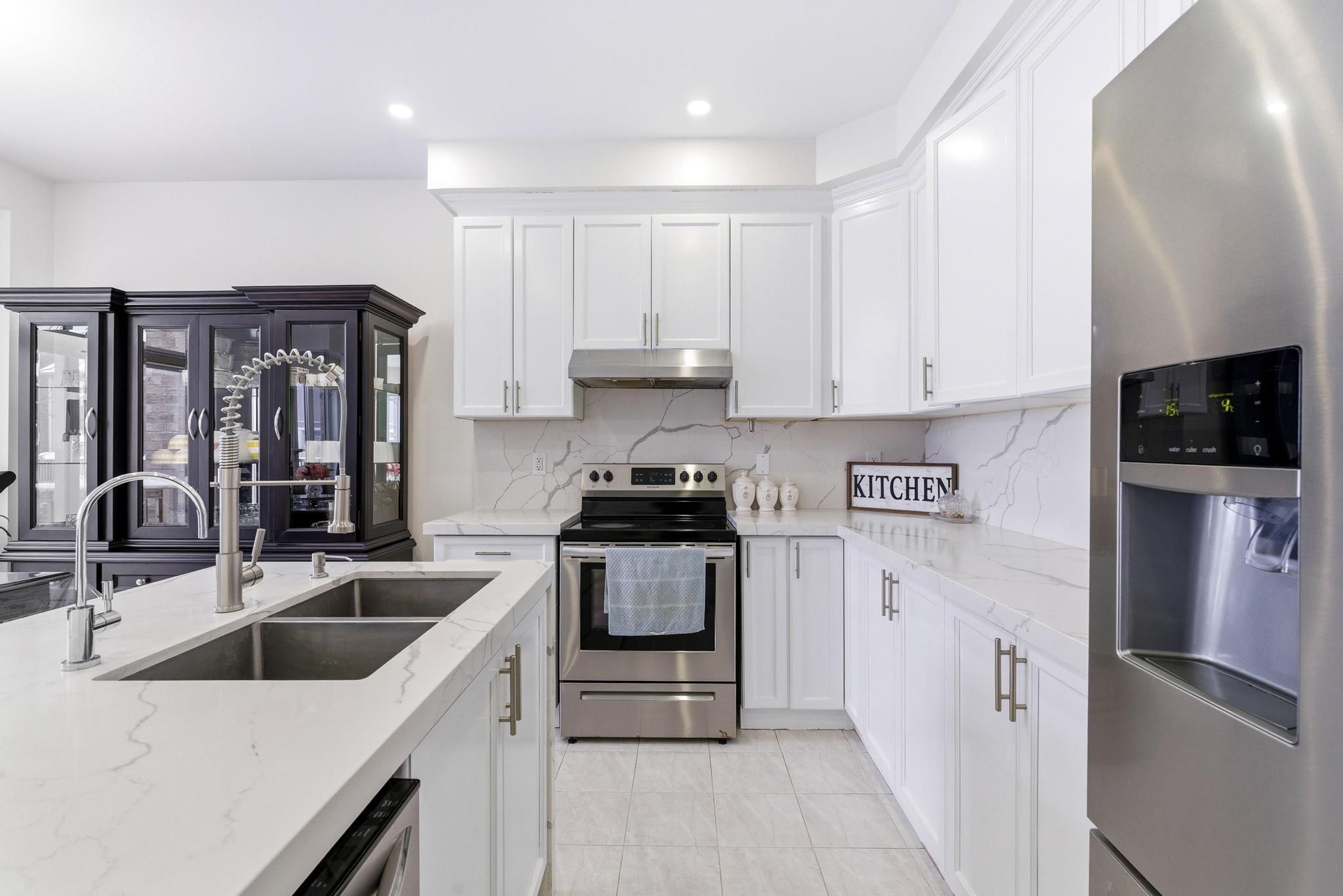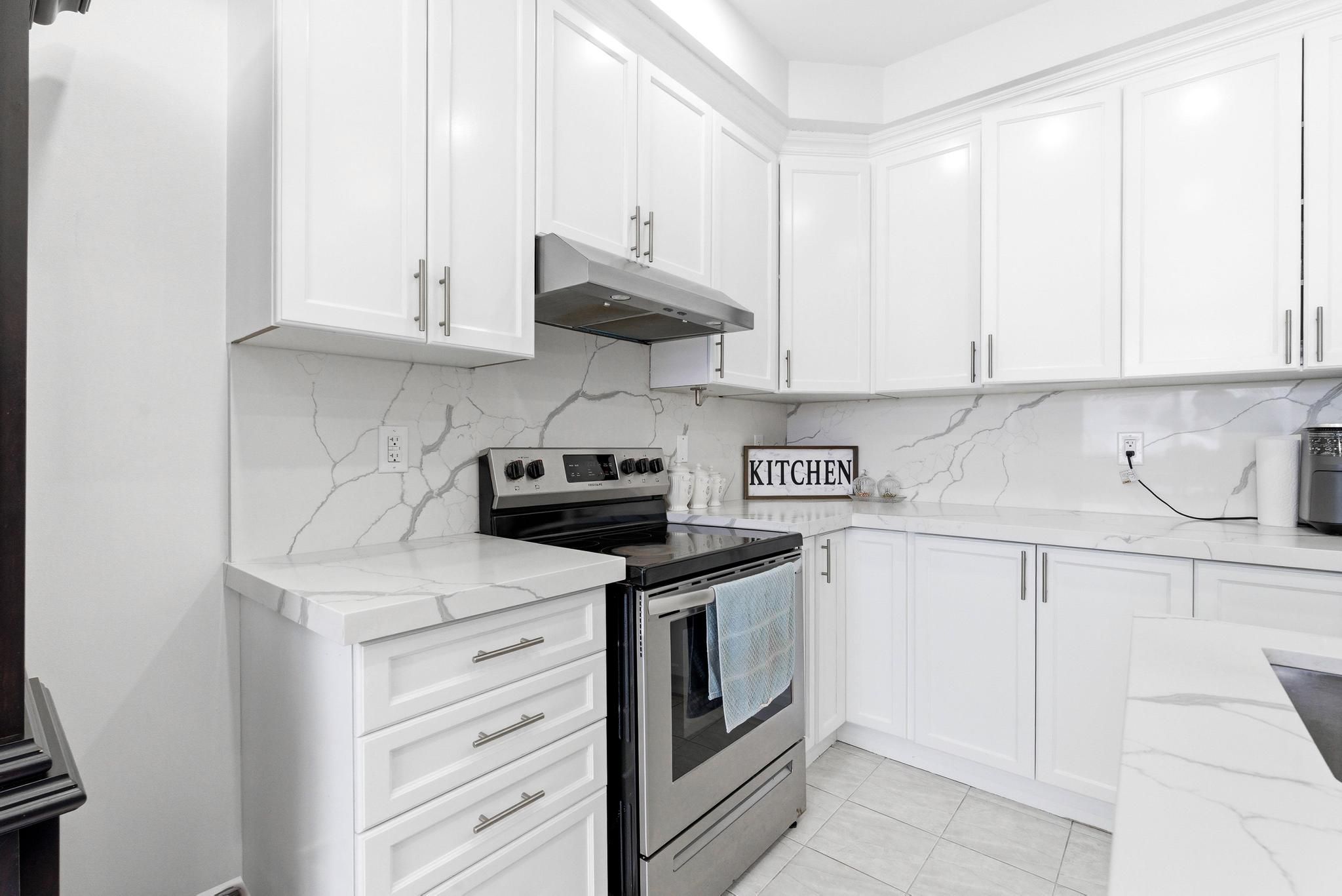 • Modern kitchen with custom backsplash and quartz countertops.