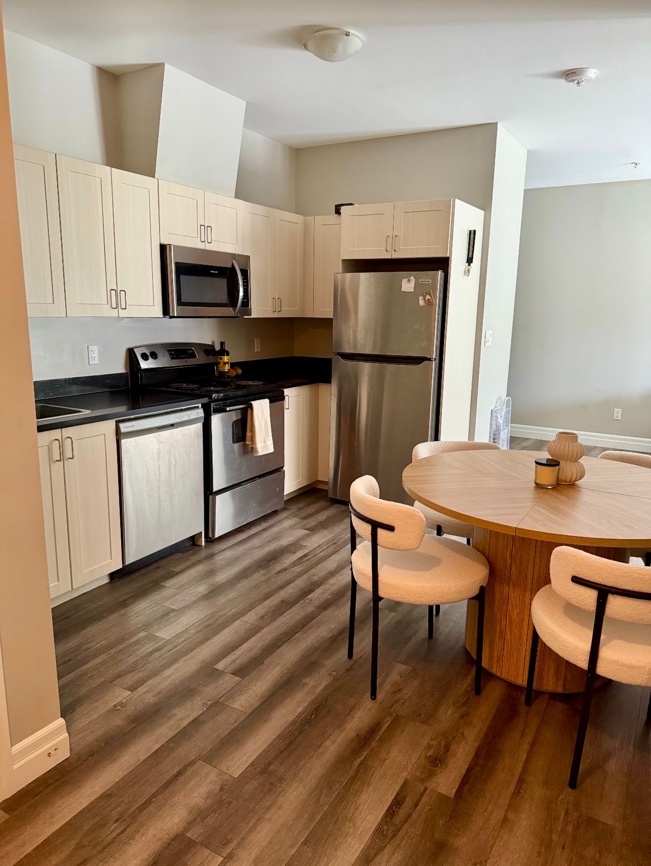 • Kitchen features stainless steel appliances and quartz countertops for functionality.