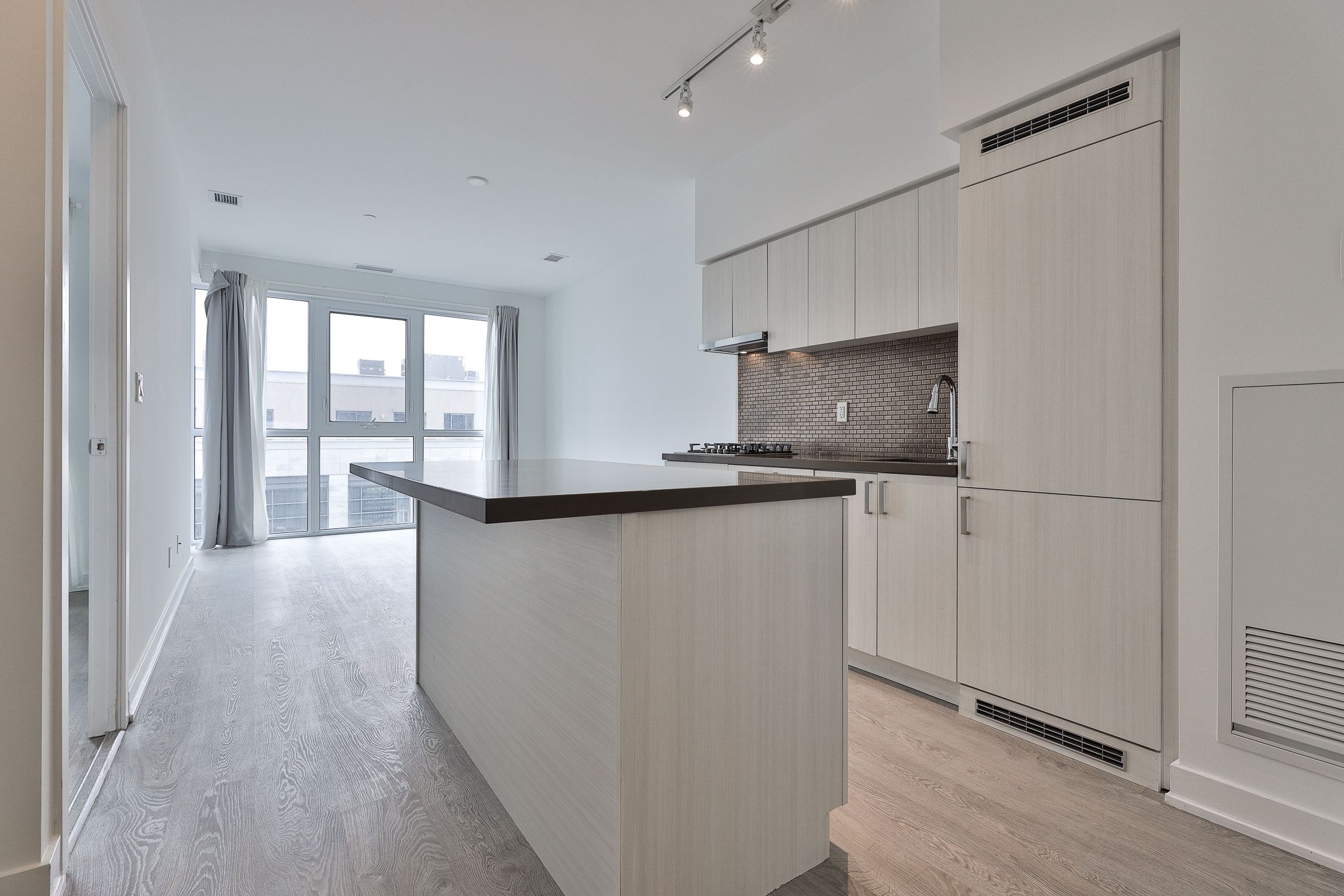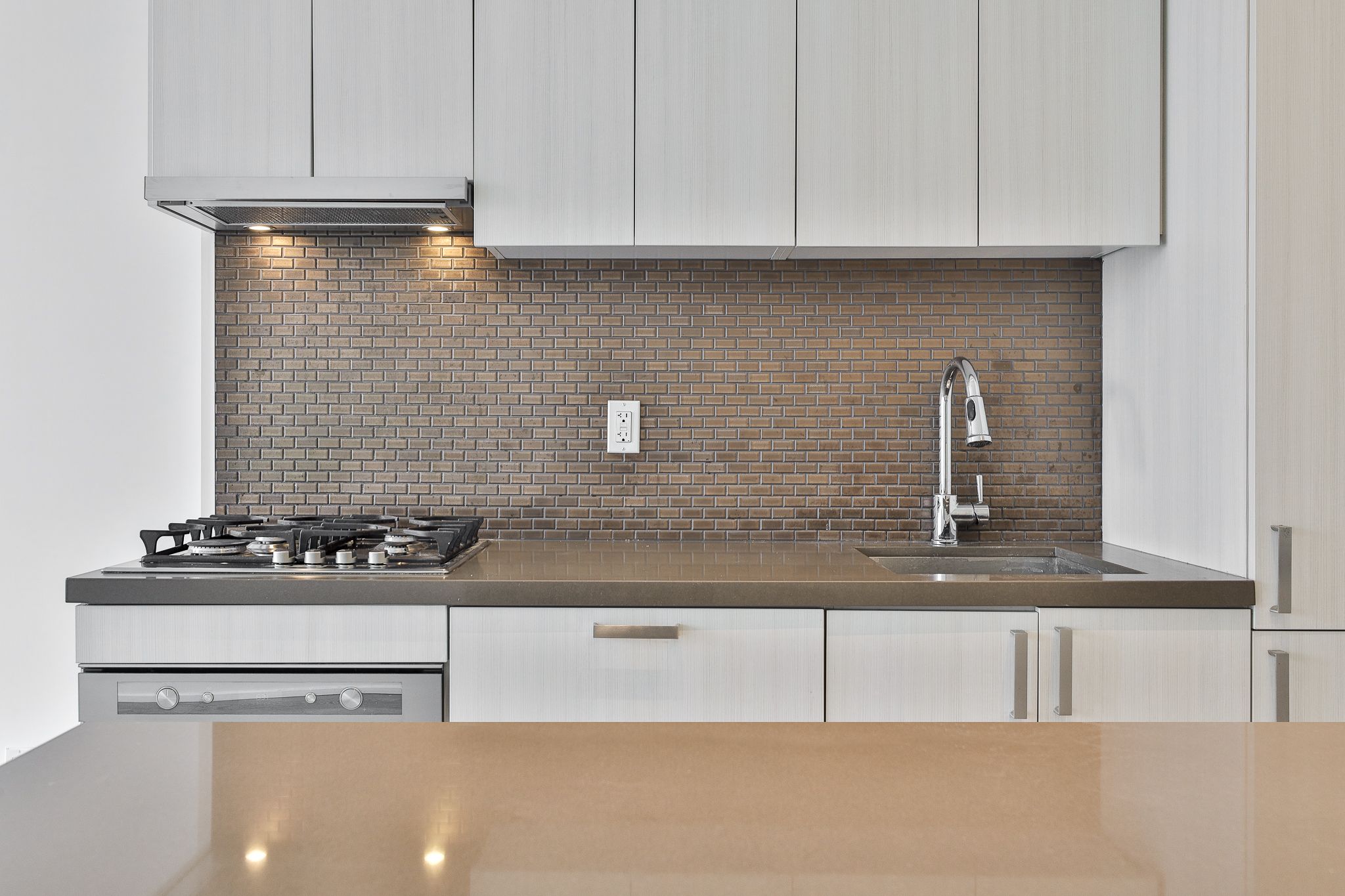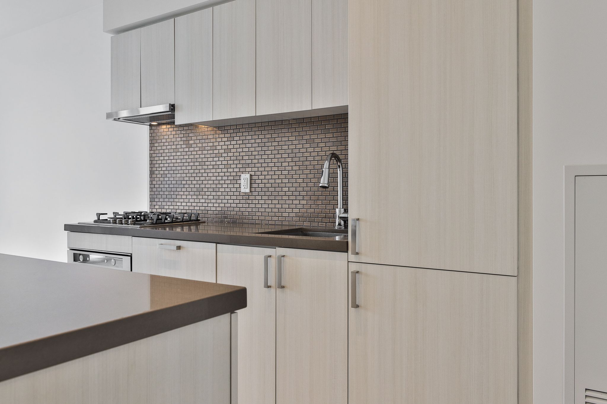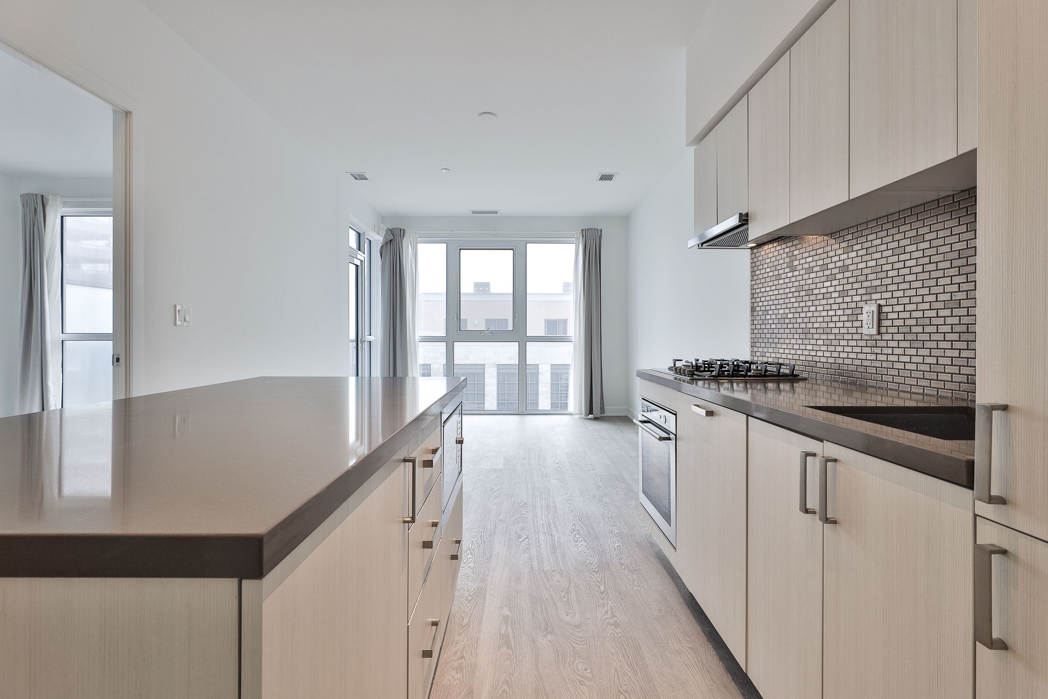 • Modern kitchen with quartz countertops and integrated appliances.