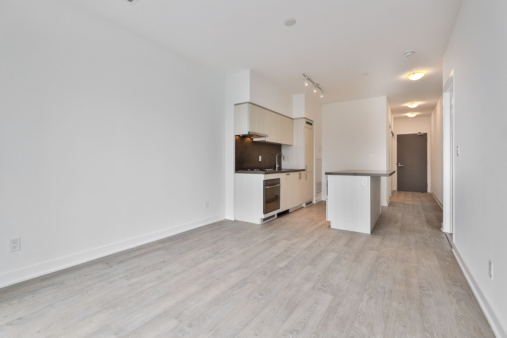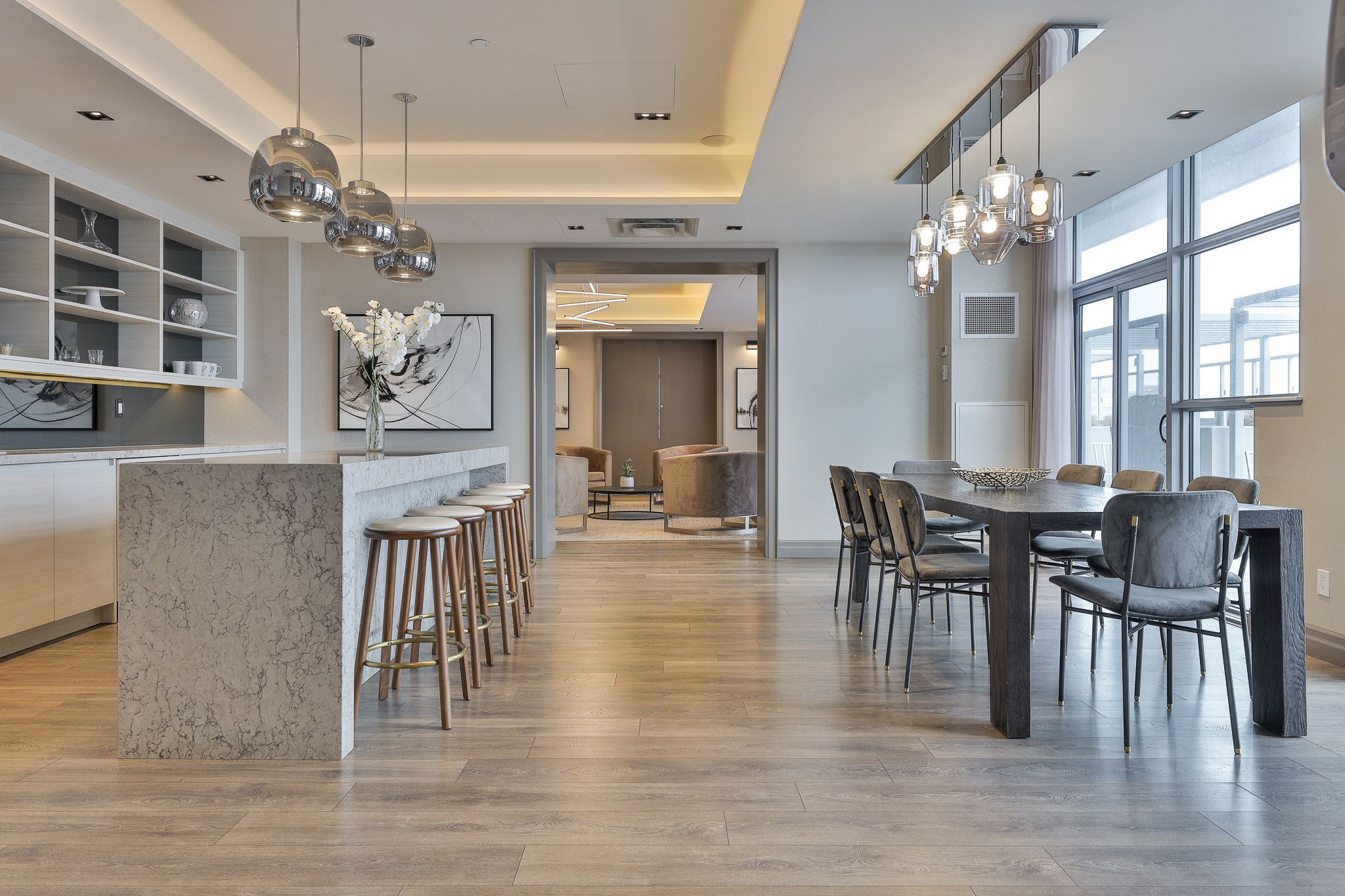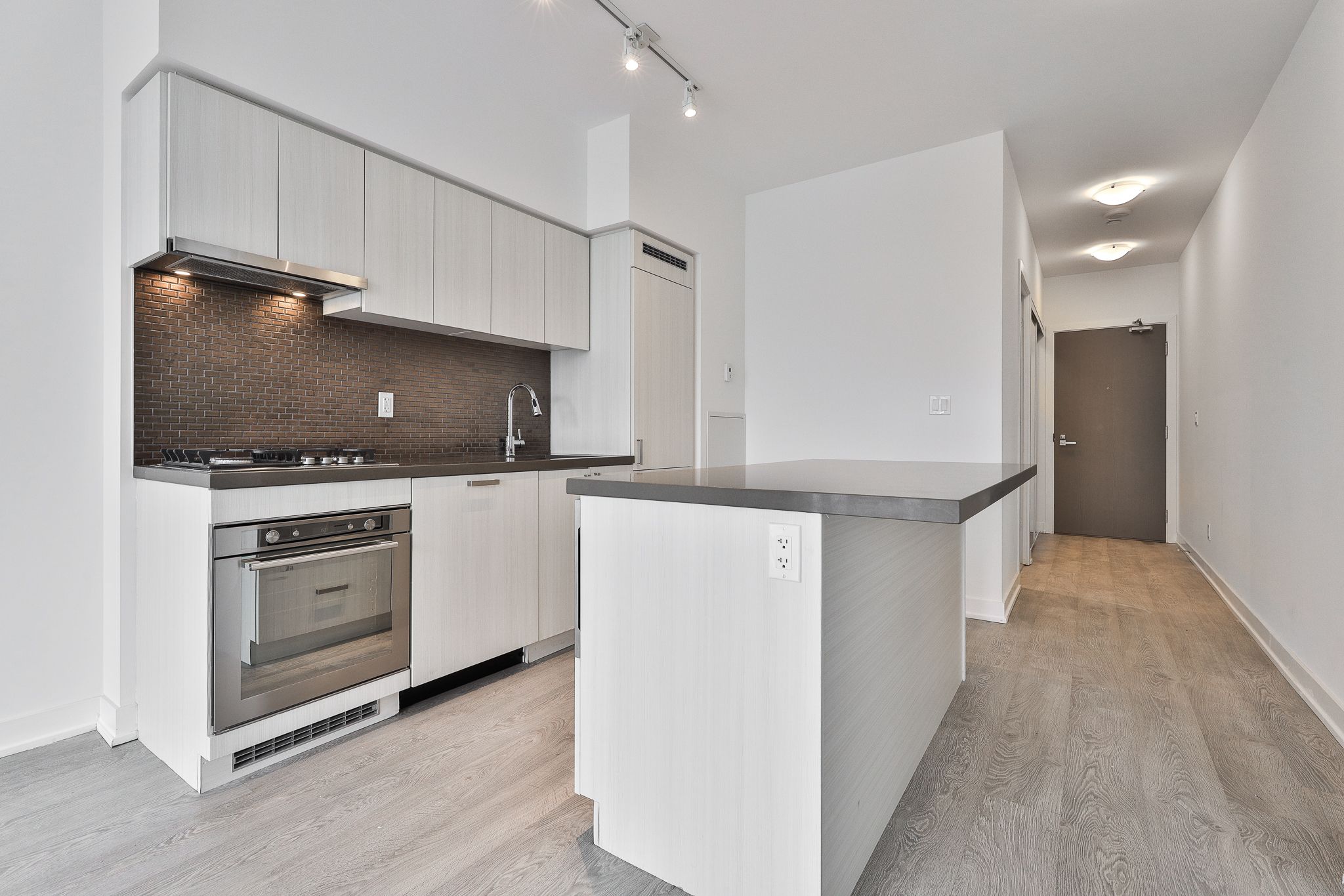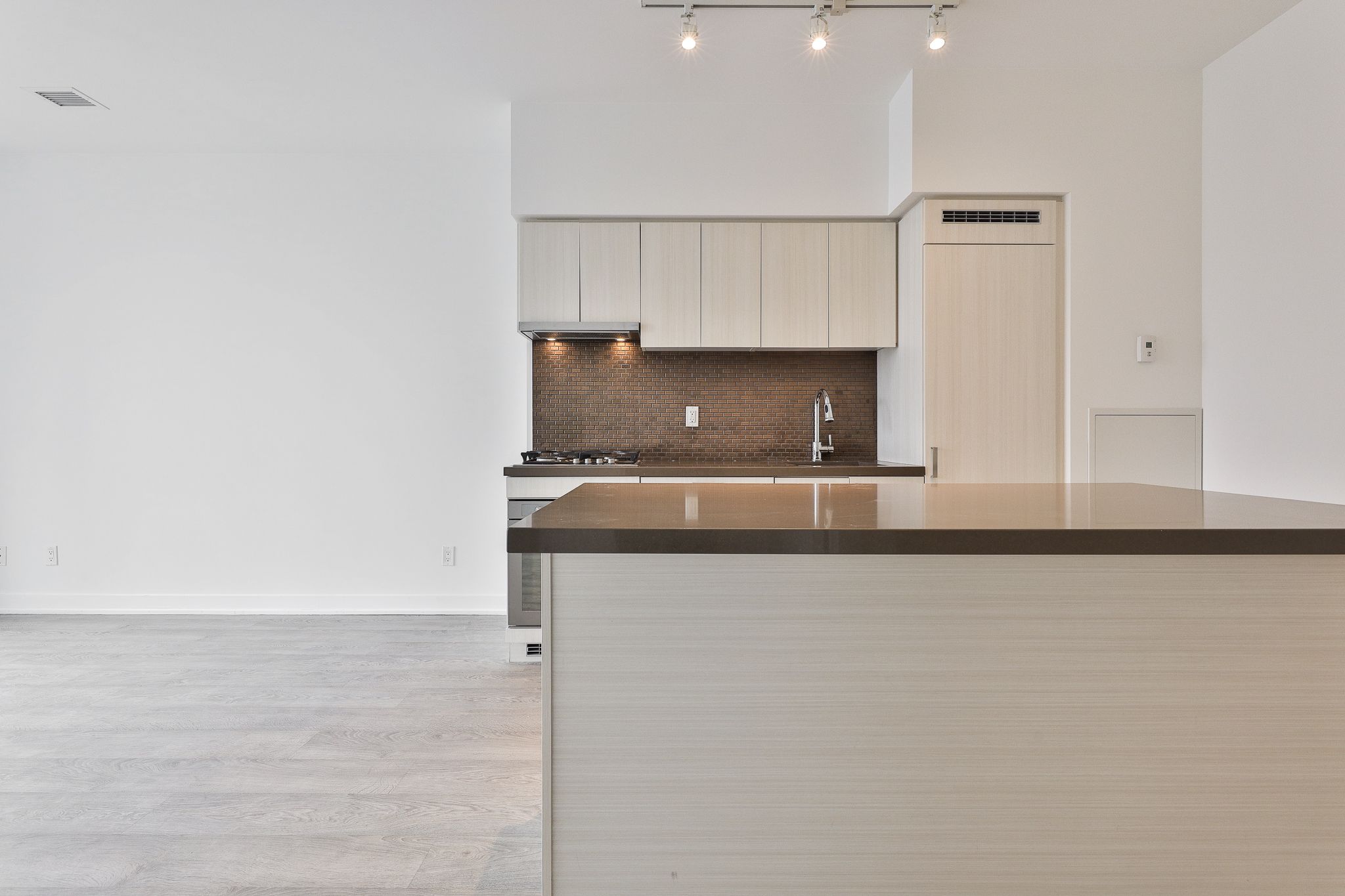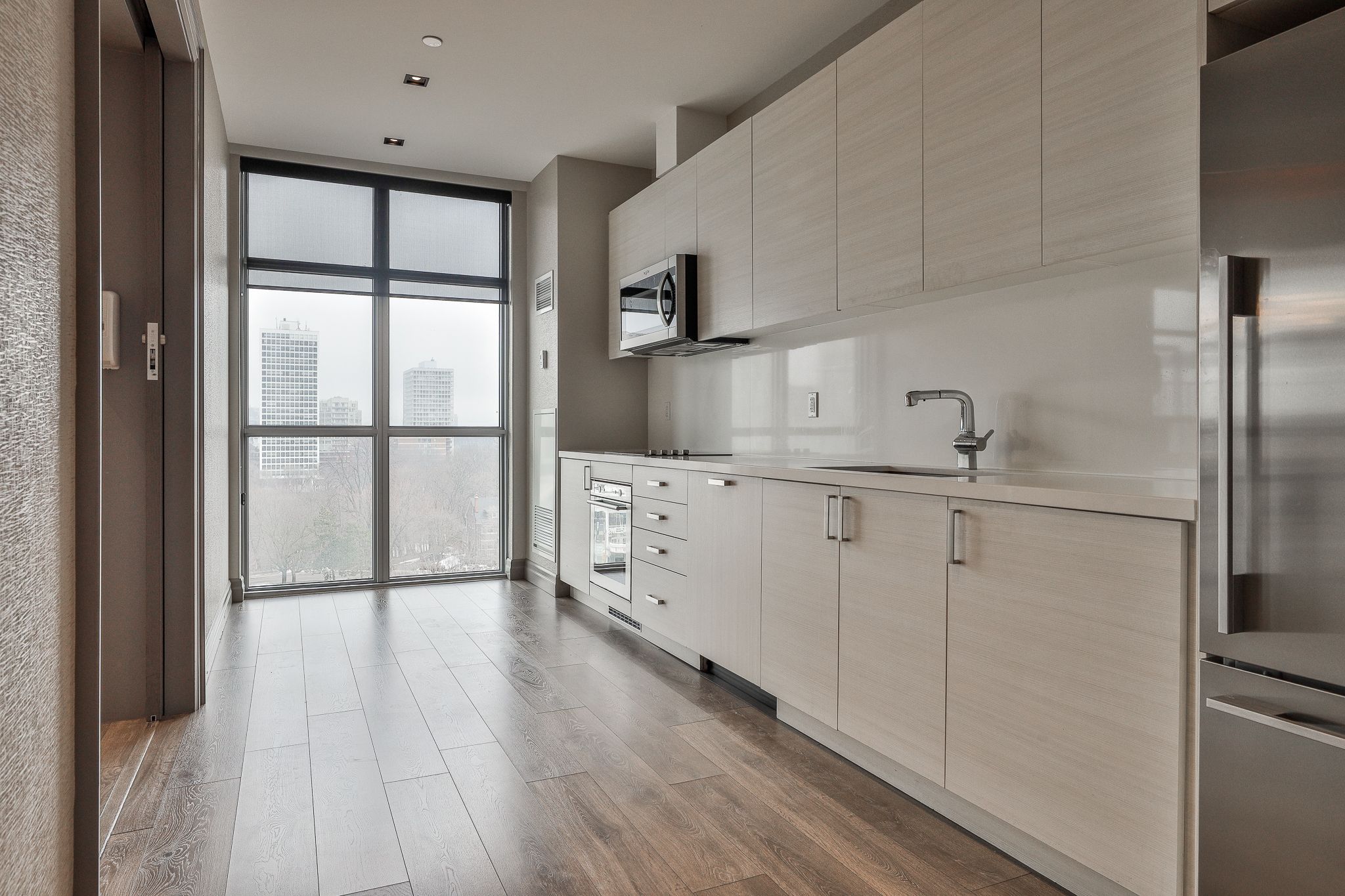 • Modern kitchen with quartz countertops and integrated appliances.