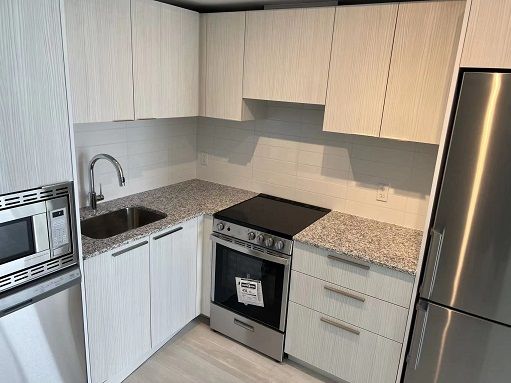 • Modern kitchen featuring stainless steel appliances for easy cooking.