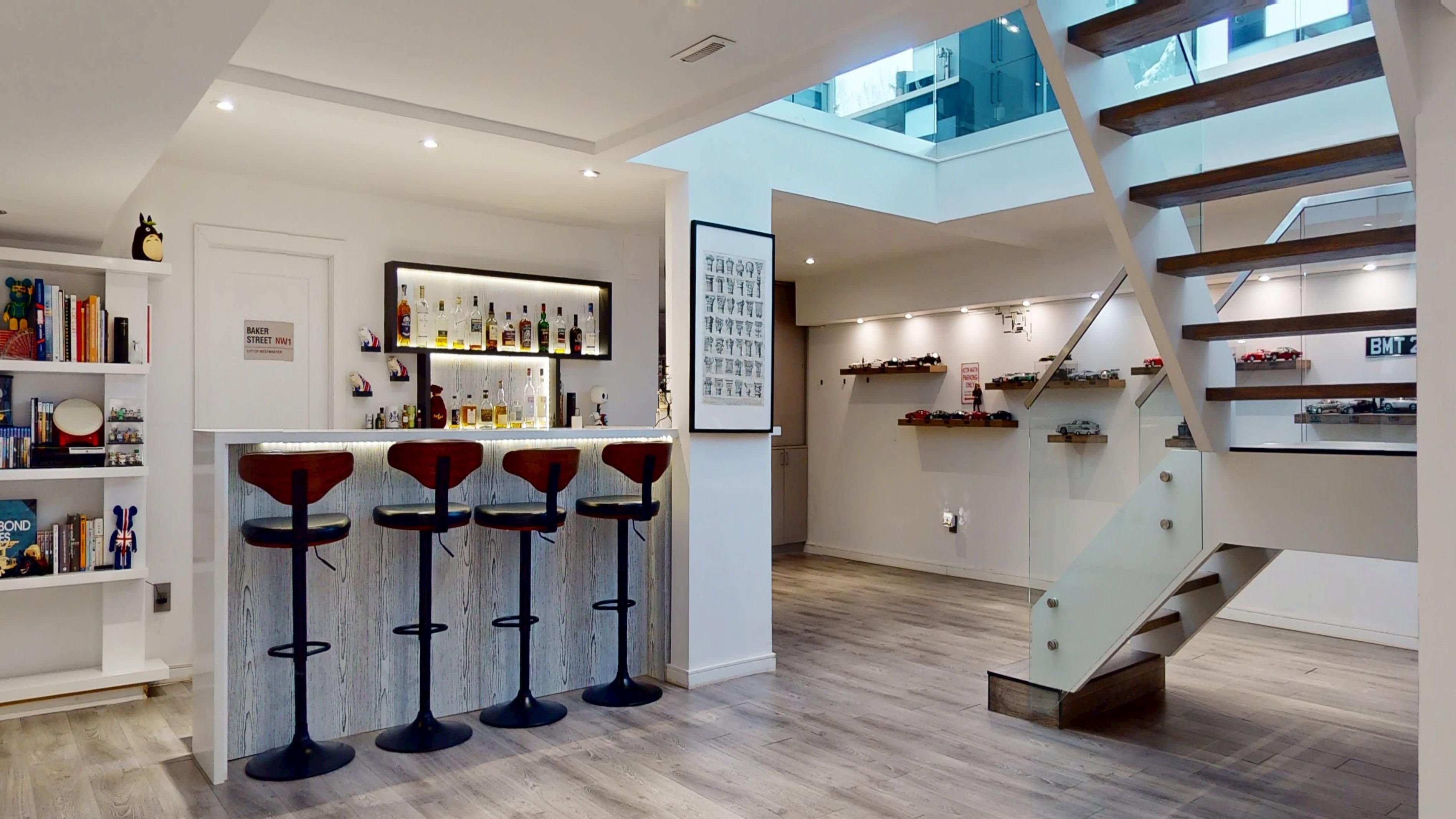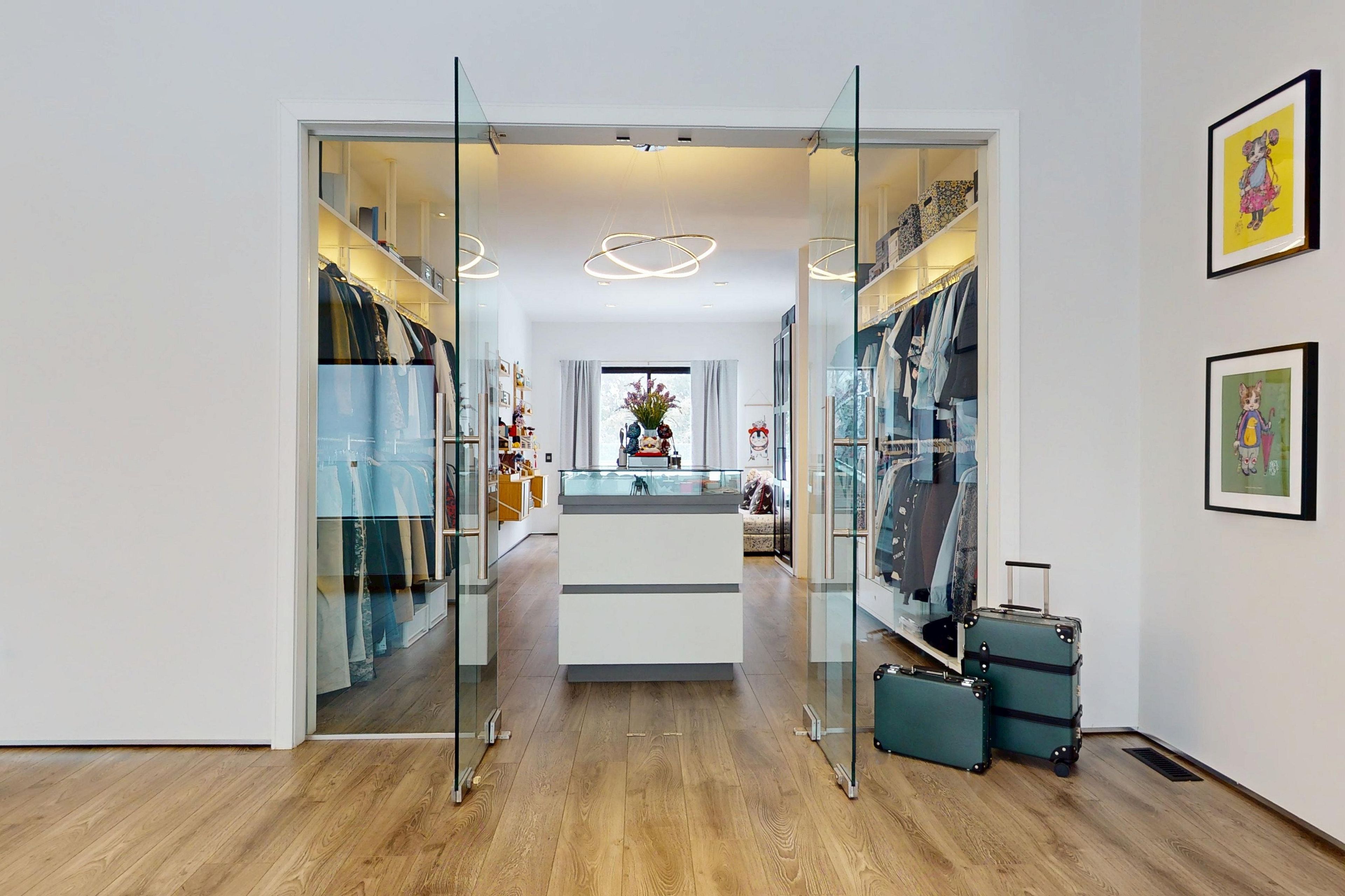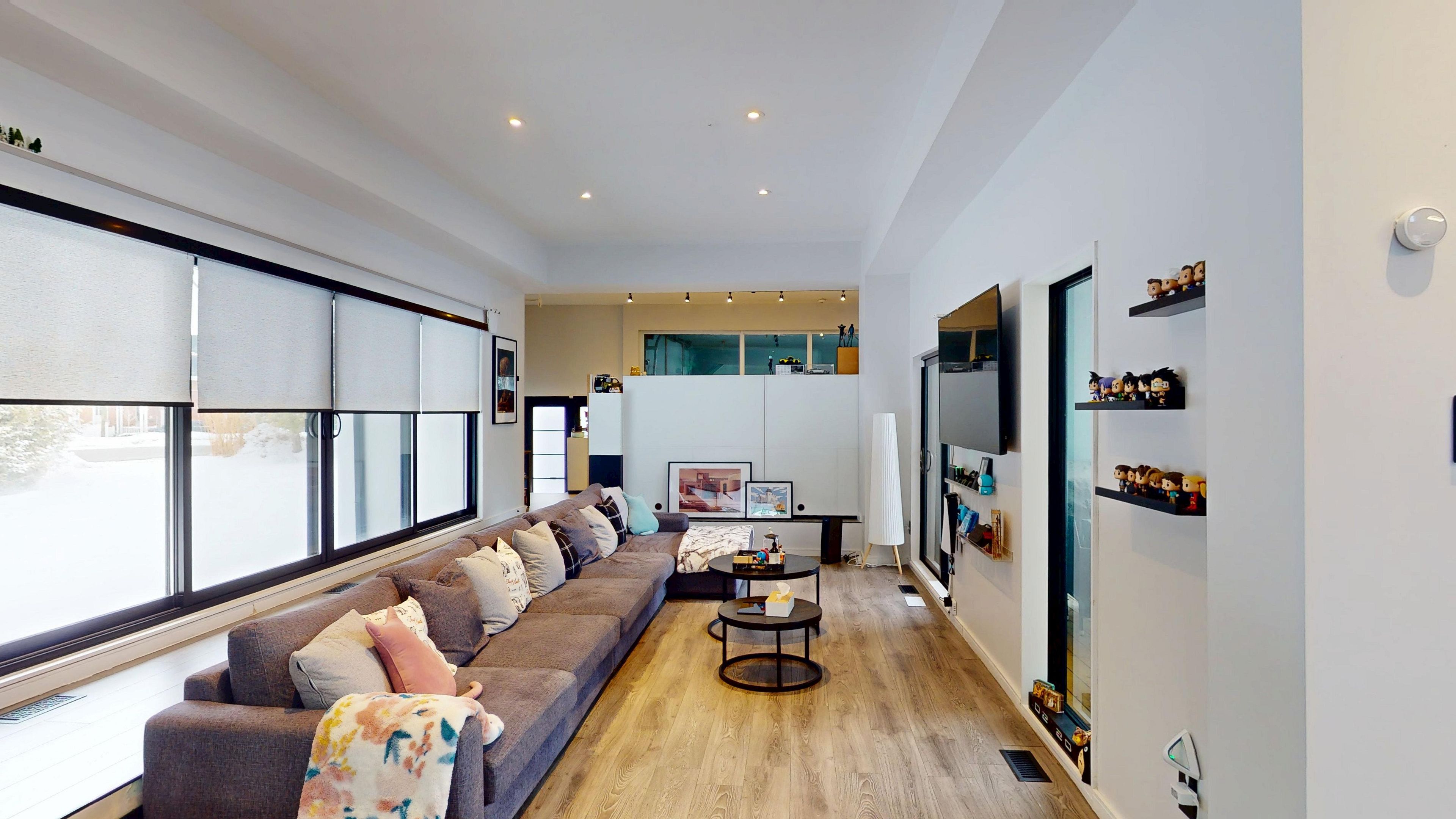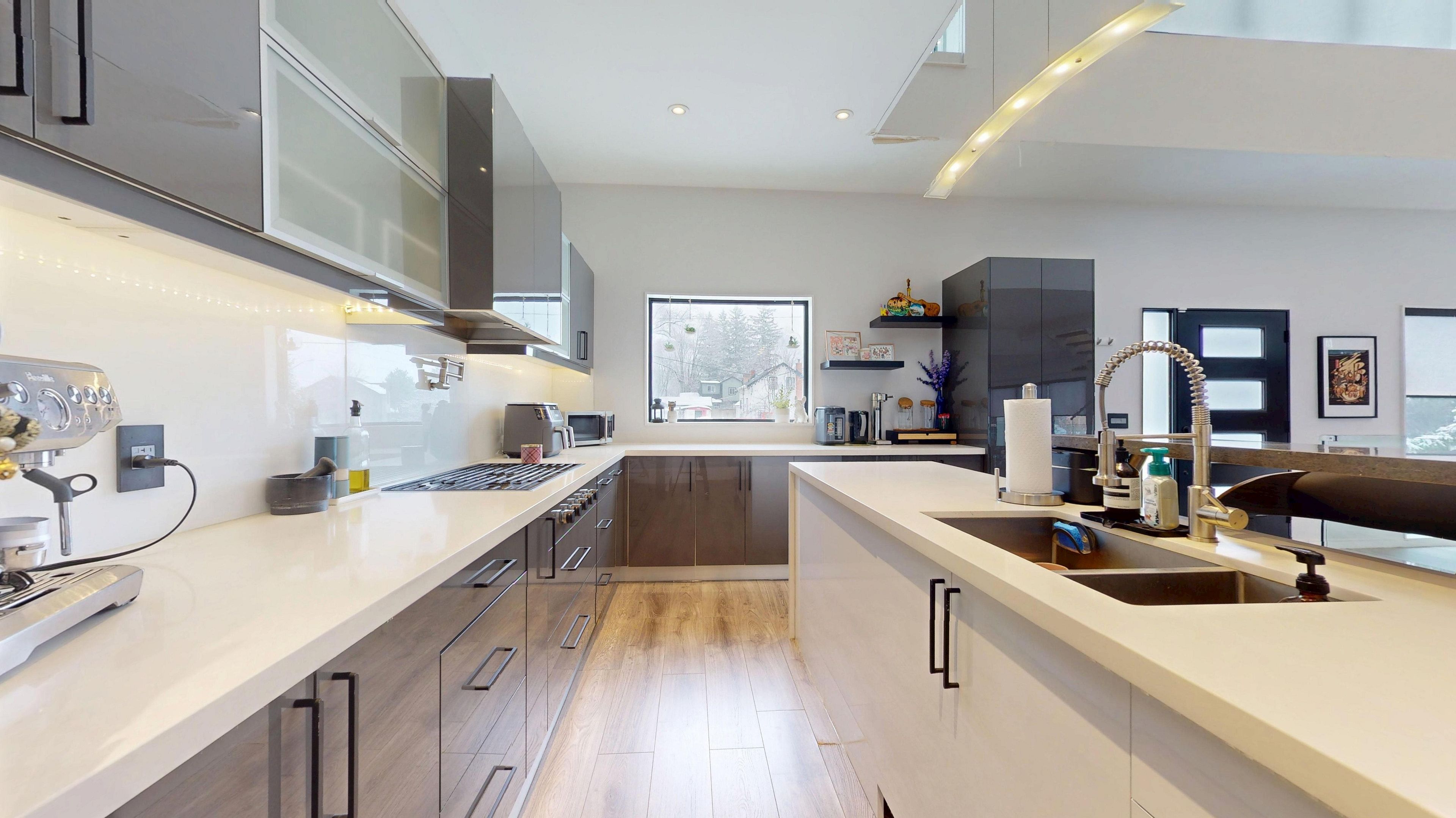Bold architecture meets refined functionality in this striking custom-built contemporary residence. Designed across three finished levels, this home seamlessly blends luxury, productivity, and entertainment. The main level makes an unforgettable first impression with soaring open-to-above ceilings, a floating wood staircase with glass railings, and expansive walls of glass that flood the space with natural light. The chef-inspired kitchen is a true showpiece, featuring a dramatic dual-waterfall island, built-in wall ovens, gas cooktop with pot filler, wine storage, beverage fridge, and sleek high-gloss cabinetry - all flowing effortlessly into the dining and living areas anchored by a designer feature wall. A dedicated professional office wing offers glass-partitioned workspace and conference flexibility - ideal for entrepreneurs, creatives, consultants and more. Upstairs, a dramatic gallery overlooks the main level and leads to a boutique-style primary retreat complete with a glass-enclosed walk-in closet and spa-inspired ensuite featuring a freestanding soaker tub, frameless glass shower, floating vanity, and modern tile finishes. Spacious secondary bedrooms and beautifully appointed bathrooms complete the upper level. The fully finished lower level elevates the home's entertainment factor with a custom built-in bar, open recreation space, designer lighting, and architectural sight-lines connecting all levels. A full bathroom adds flexibility for guests. This is more than a home - it is a modern lifestyle property built for those who value design, functionality, and elevated living.