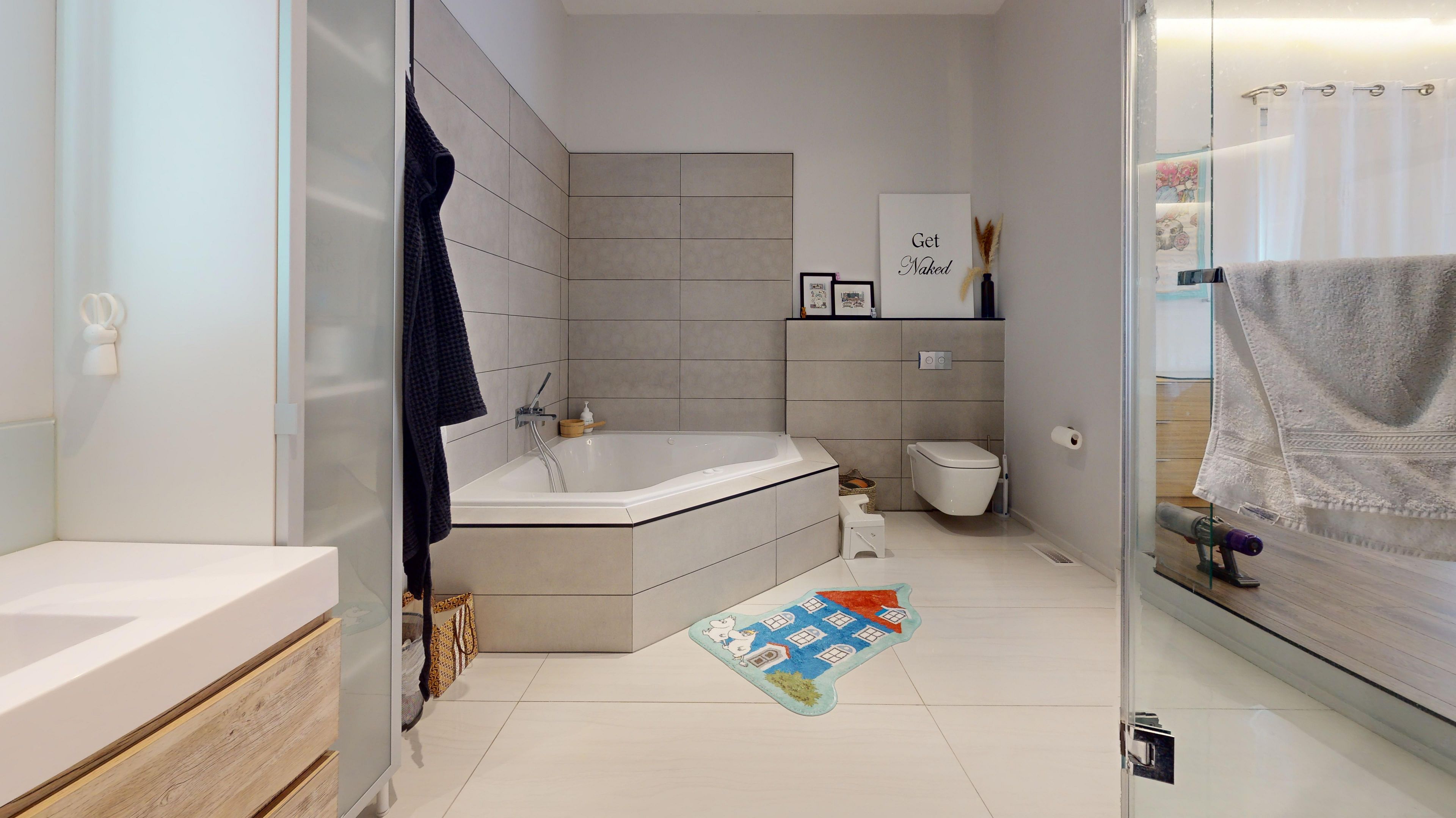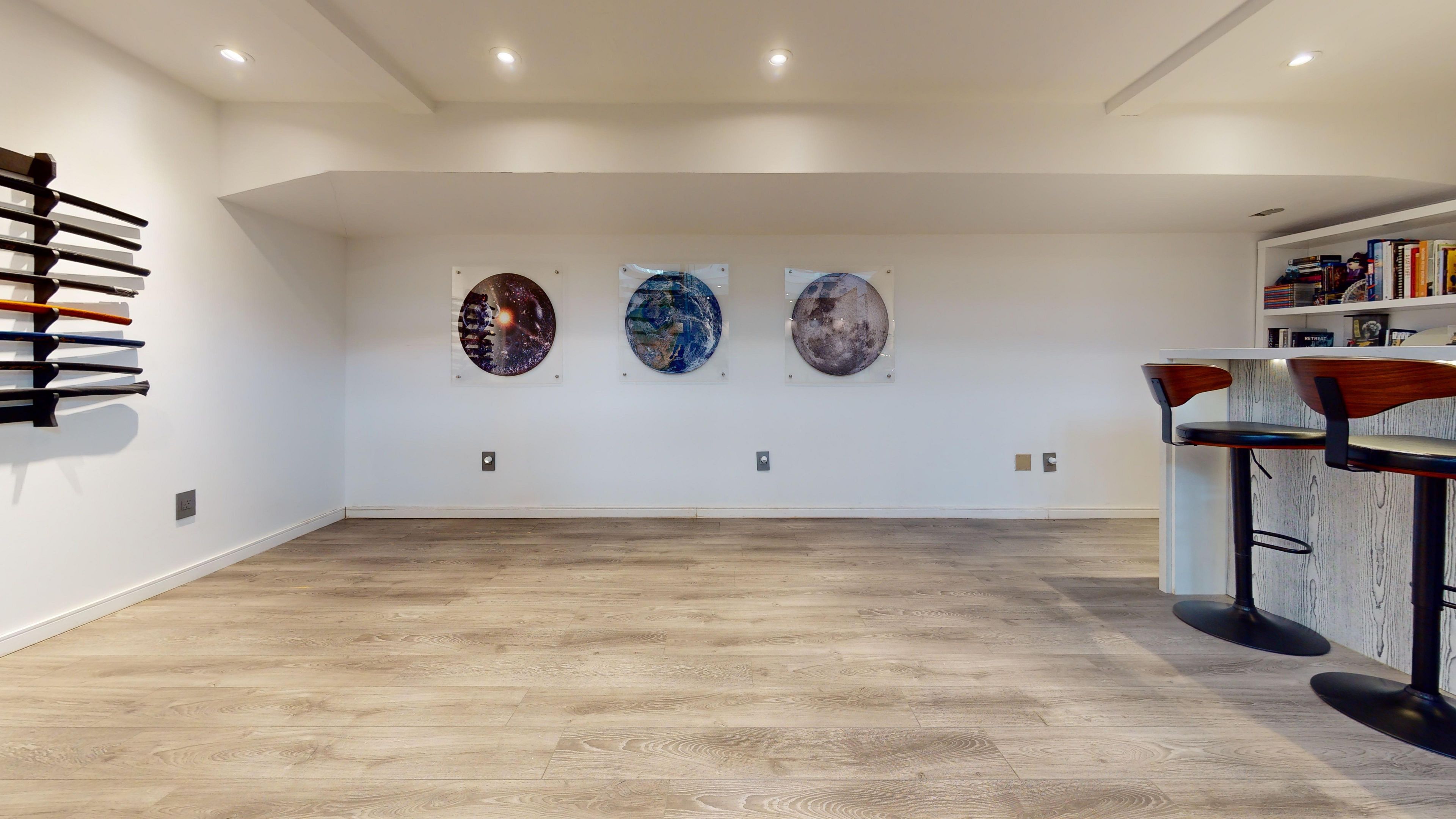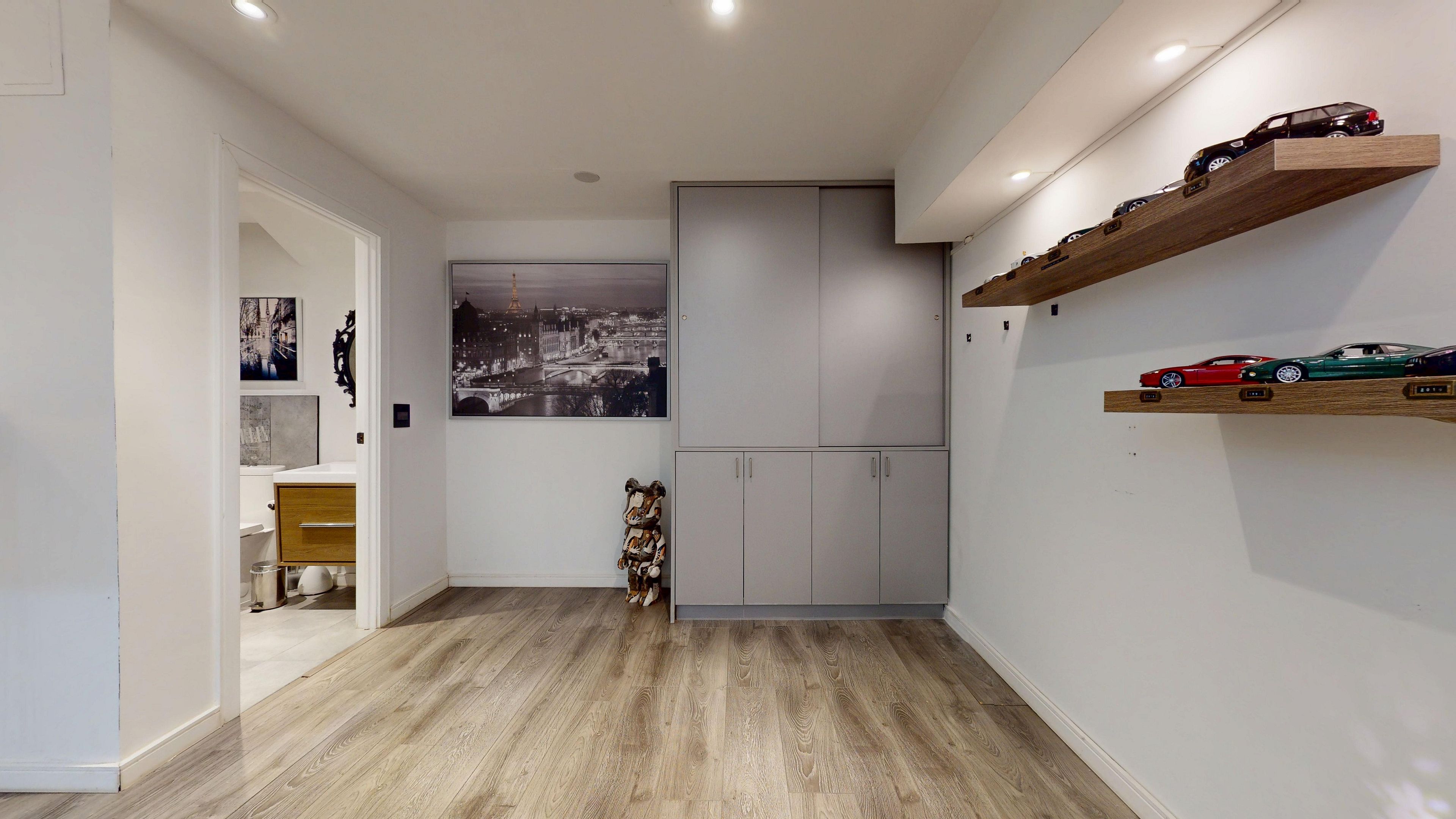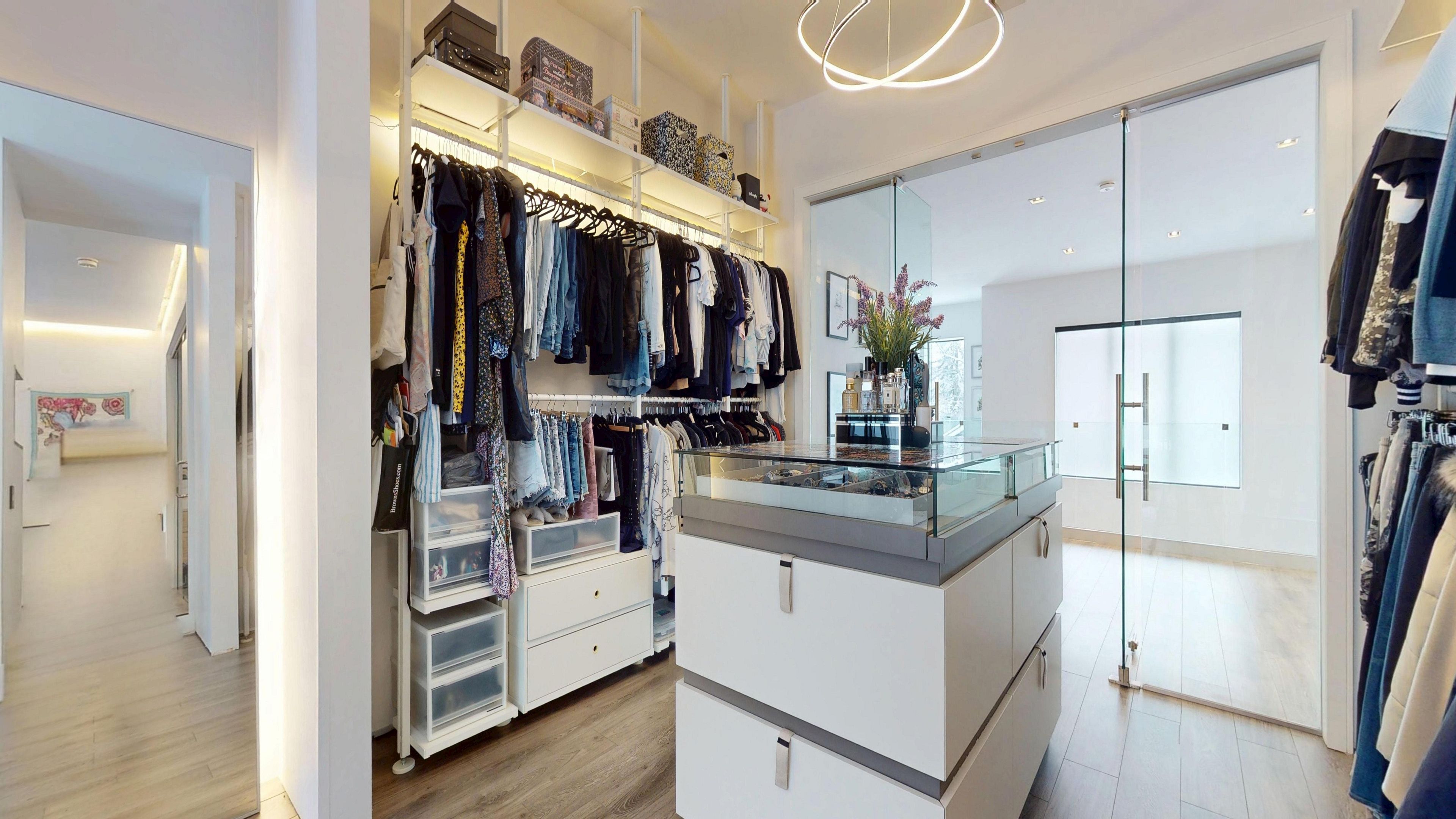 Bold architecture meets refined functionality in this striking custom-built contemporary residence. Designed across three finished levels, this home seamlessly blends luxury, productivity, and entertainment. The main level makes an unforgettable first impression with soaring open-to-above ceilings, a floating wood staircase with glass railings, and expansive walls of glass that flood the space with natural light. The chef-inspired kitchen is a true showpiece, featuring a dramatic dual-waterfall island, built-in wall ovens, gas cooktop with pot filler, wine storage, beverage fridge, and sleek high-gloss cabinetry - all flowing effortlessly into the dining and living areas anchored by a designer feature wall. A dedicated professional office wing offers glass-partitioned workspace and conference flexibility - ideal for entrepreneurs, creatives, consultants and more. Upstairs, a dramatic gallery overlooks the main level and leads to a boutique-style primary retreat complete with a glass-enclosed walk-in closet and spa-inspired ensuite featuring a freestanding soaker tub, frameless glass shower, floating vanity, and modern tile finishes. Spacious secondary bedrooms and beautifully appointed bathrooms complete the upper level. The fully finished lower level elevates the home's entertainment factor with a custom built-in bar, open recreation space, designer lighting, and architectural sight-lines connecting all levels. A full bathroom adds flexibility for guests. This is more than a home - it is a modern lifestyle property built for those who value design, functionality, and elevated living.
