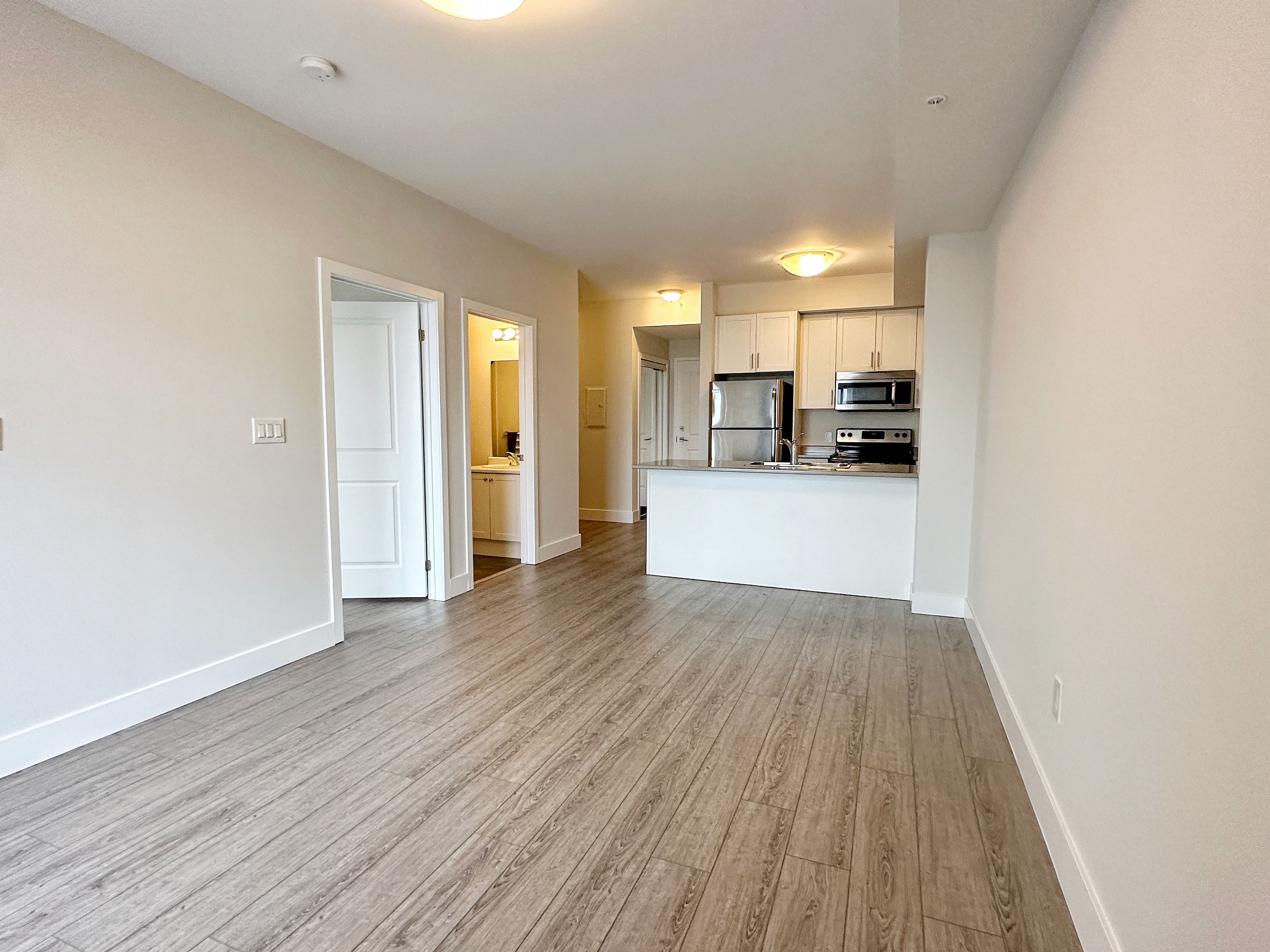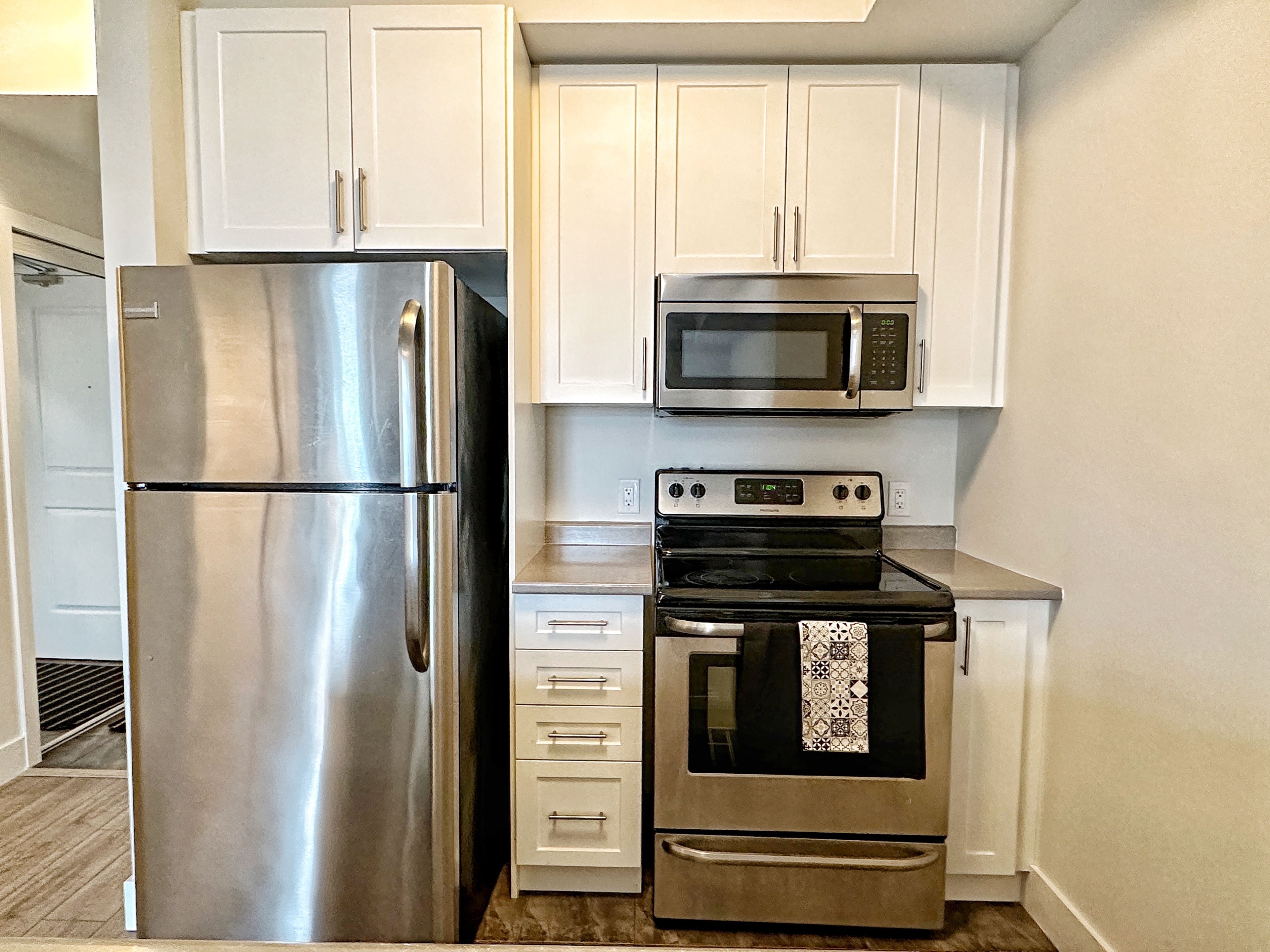 • Modern amenities include stainless steel appliances and laminate flooring.