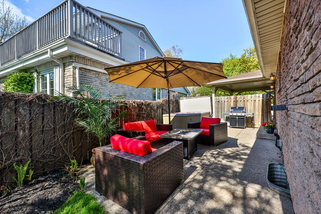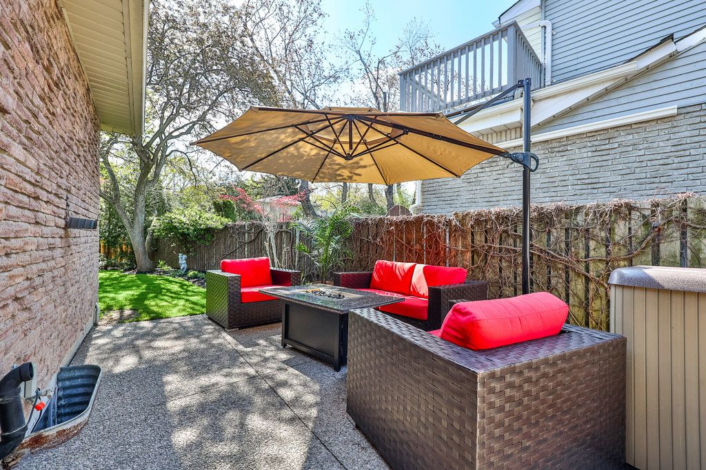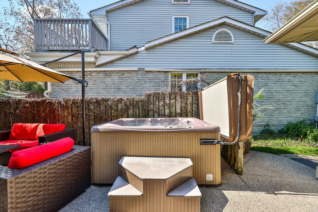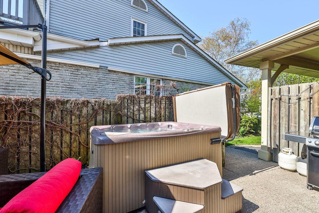 • Private landscaped backyard oasis with a hot tub and lounge area.