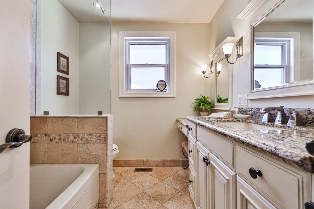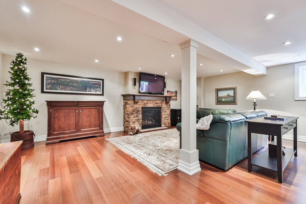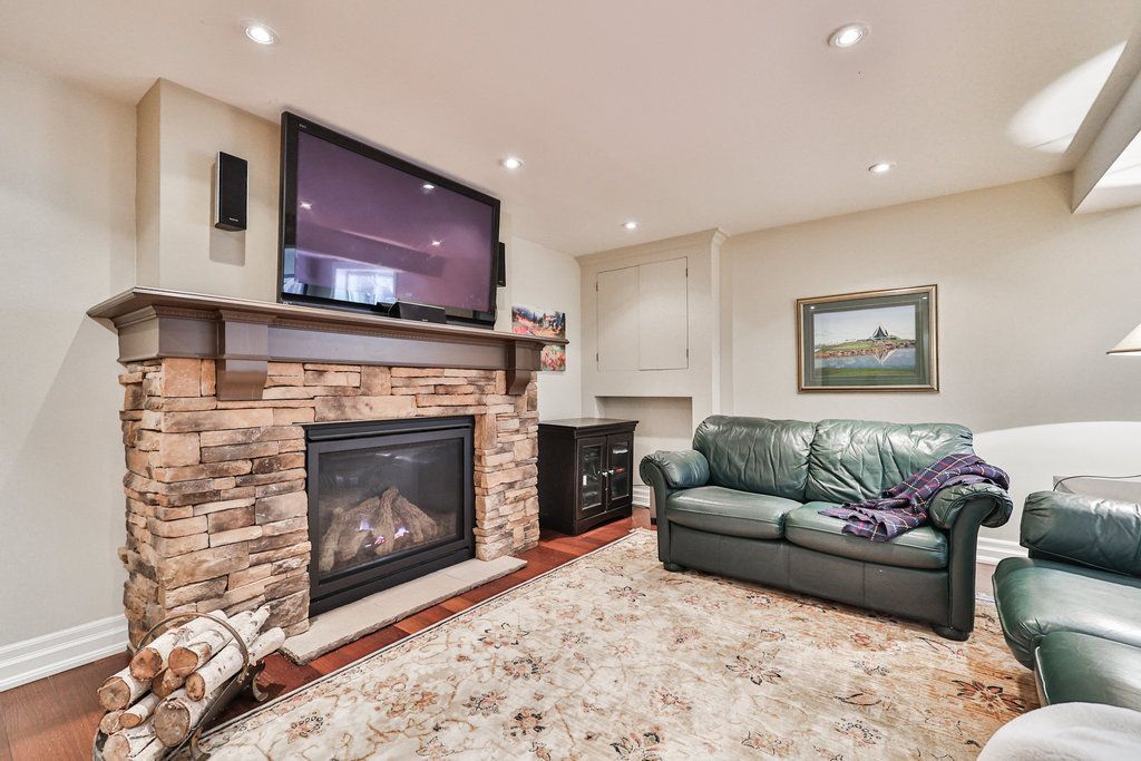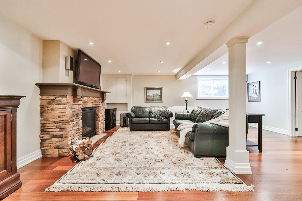 • Bright lower level has a spacious recreation room and stone fireplace.