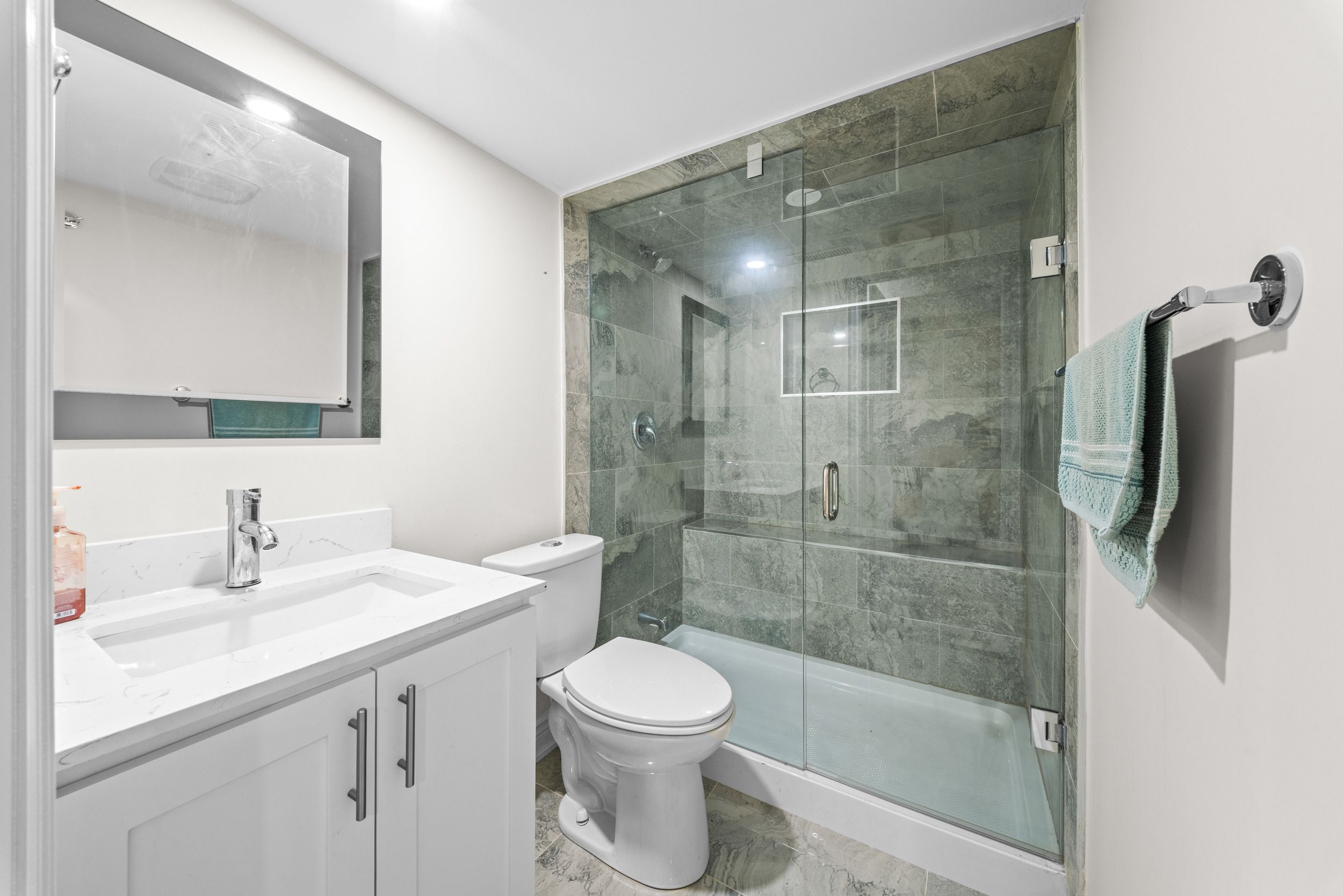 • Modern kitchen featuring quartz countertops and stainless steel appliances.