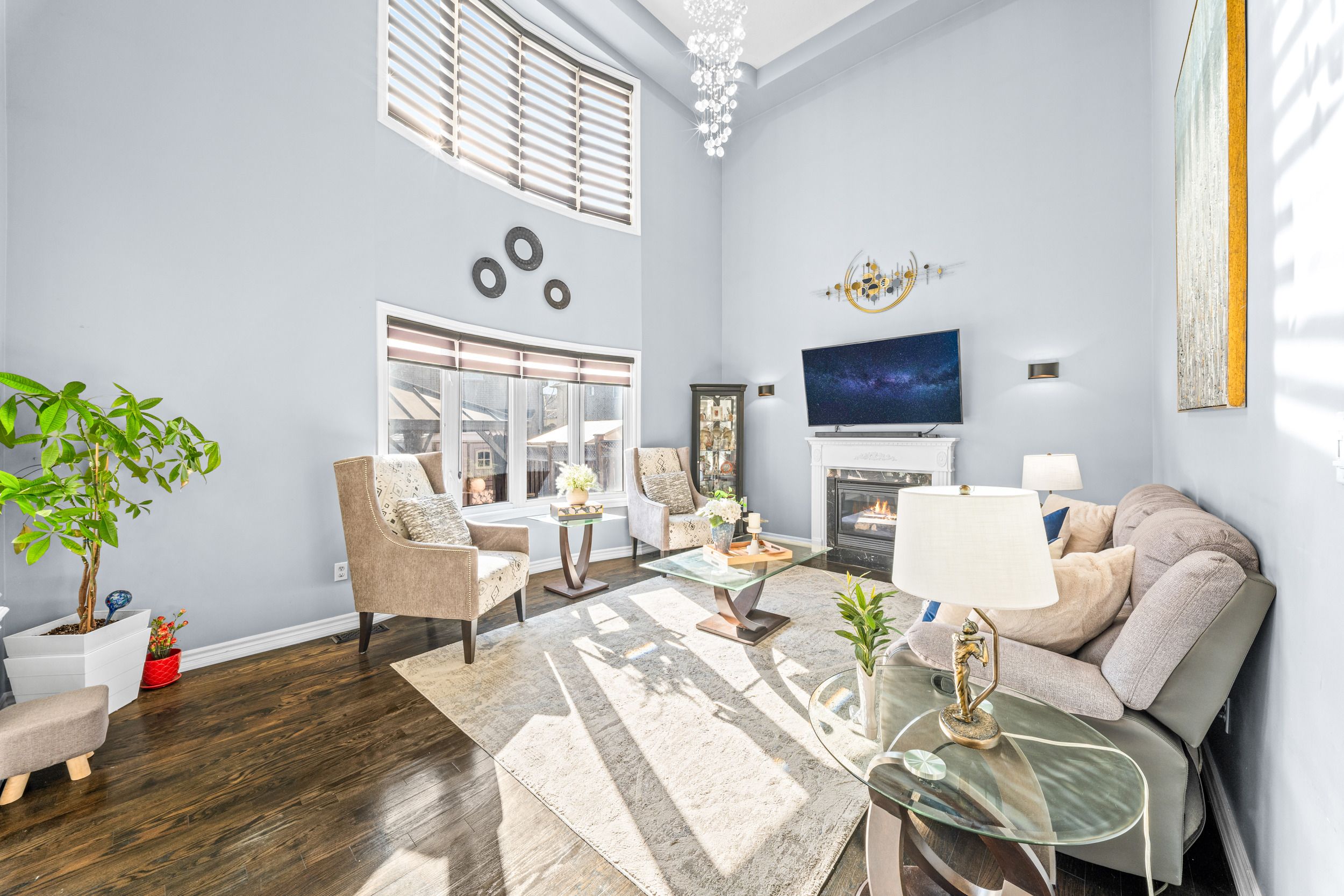 • Bright family room with grand open-to-above design and elegant chandelier.