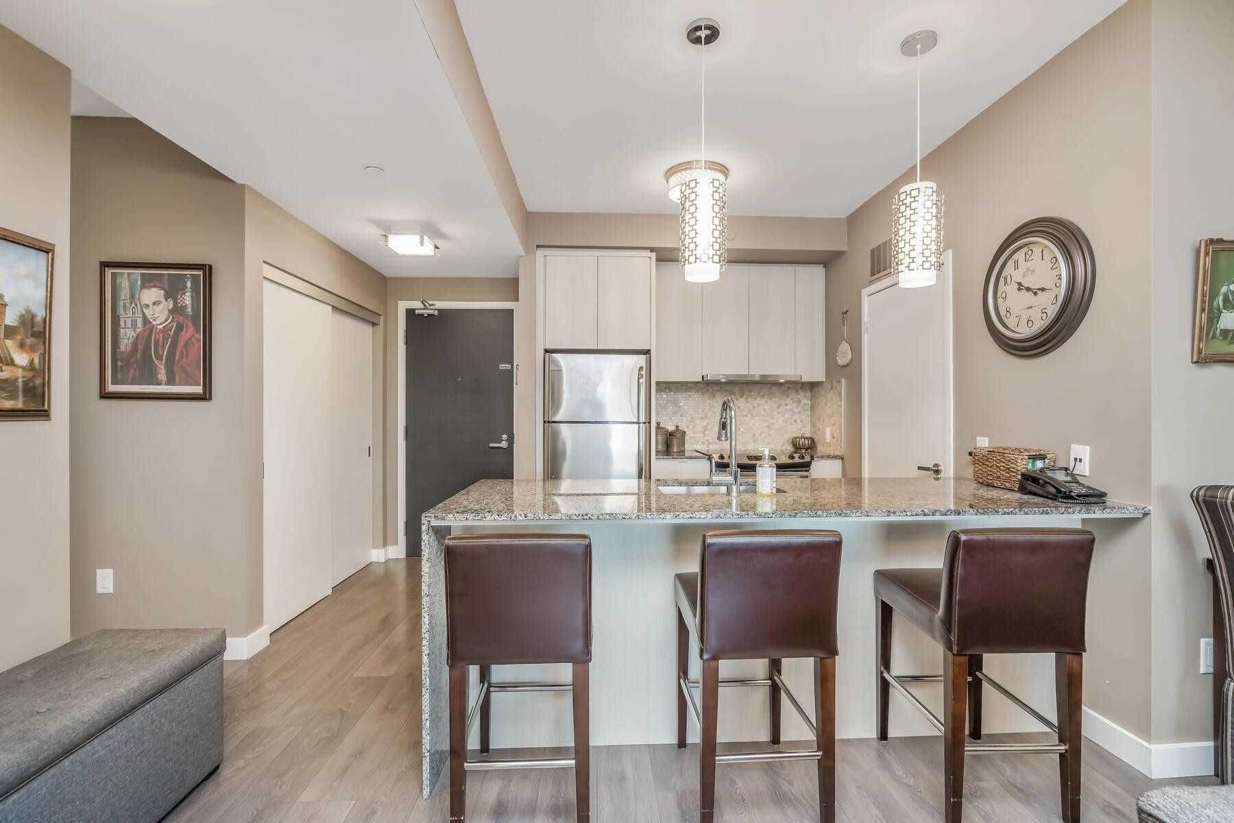 Stunning & beautifully upgraded condo - 1 bedroom + den. This quiet & sun-filled unit is facing the inner courtyard w/balcony. Incl -1 underground parking. Property features: laminate floors throughout, modern upgraded kitchenw/granite countertops, backsplash, s/s appliances, breakfast bar, spacious master bedroom. Fitness facilities& private partyroom. Close to all amenities, hwy 403/407/qew, shopping, schools, public transit, & more.. Perfect for young family &professionals.