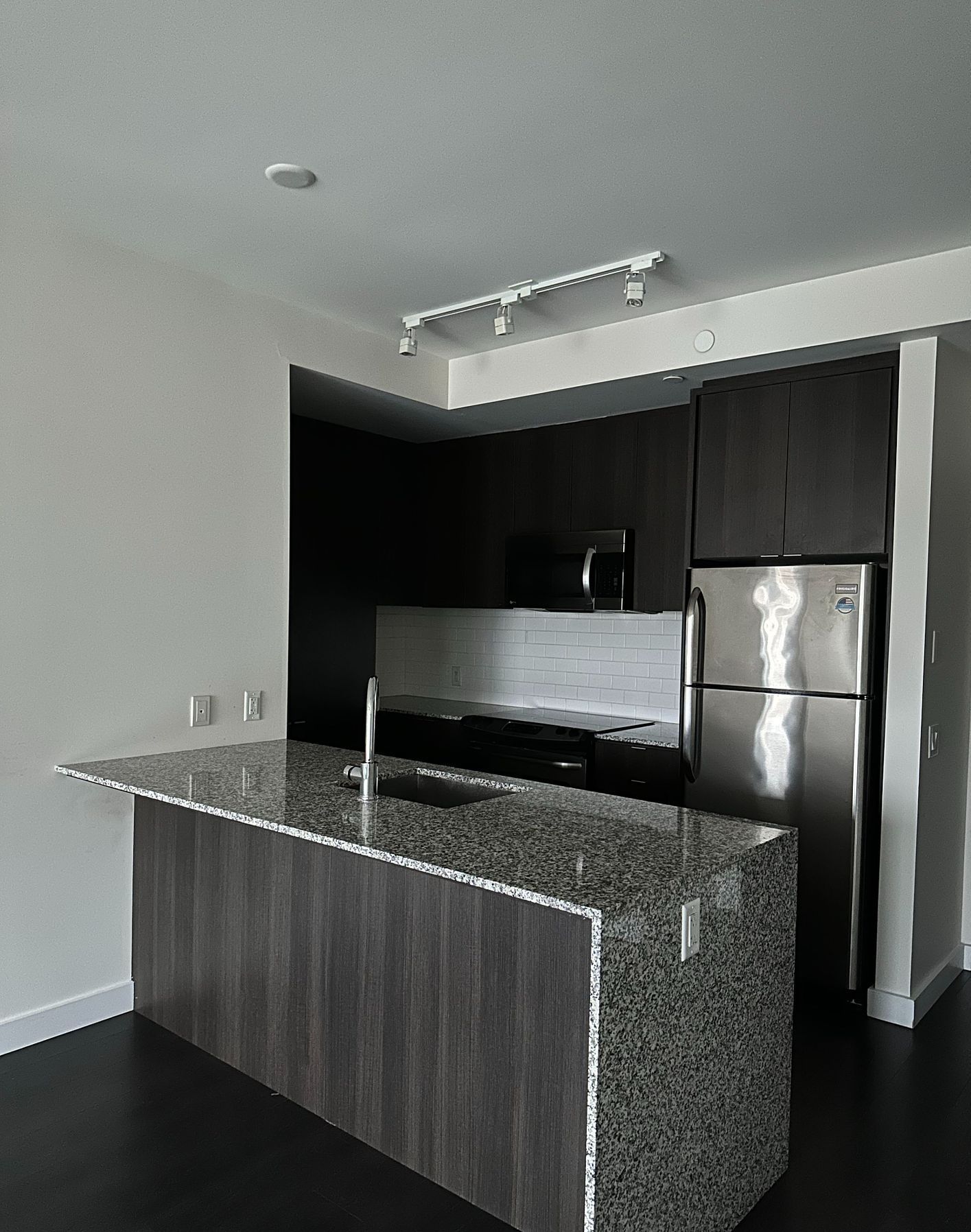 • Modern kitchen with granite countertops and stainless steel appliances.