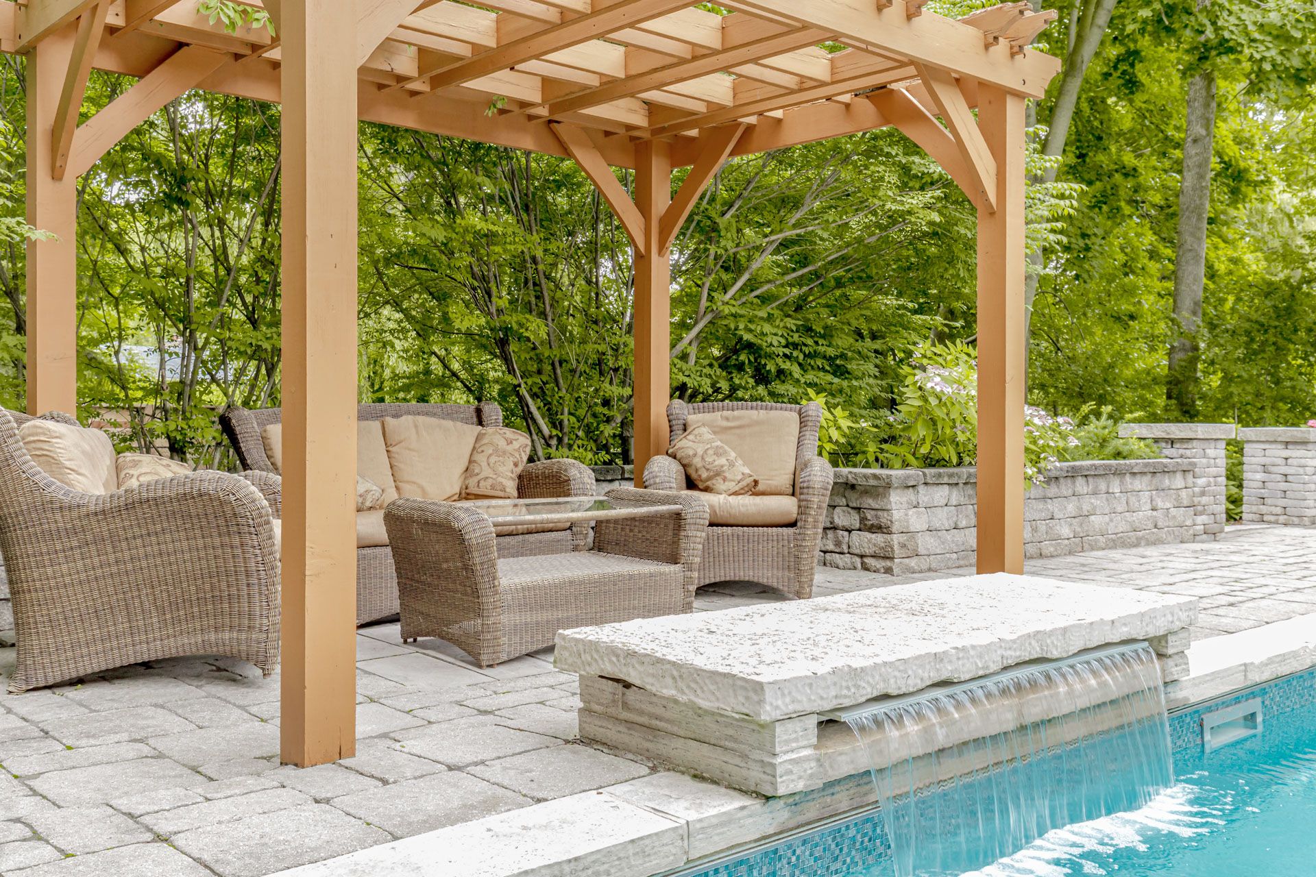 • Breathtaking backyard oasis features a pool, waterfall, and outdoor kitchen.