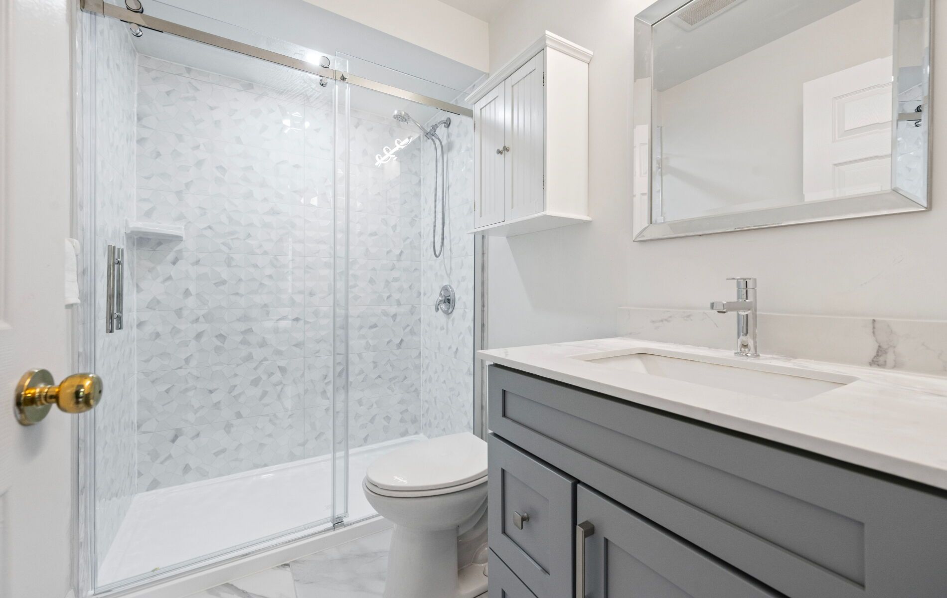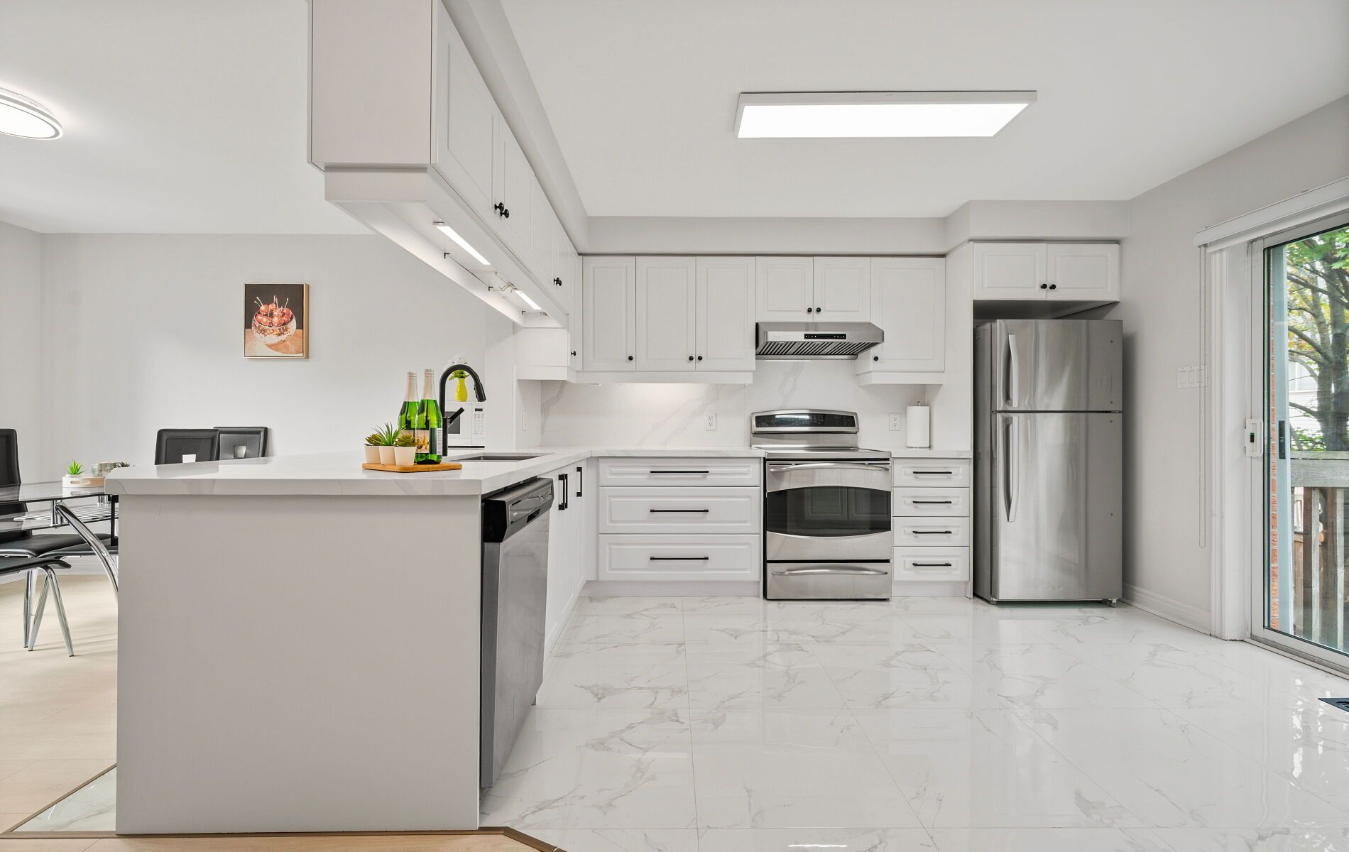 • Renovated kitchen features stainless steel appliances and quartz countertops.