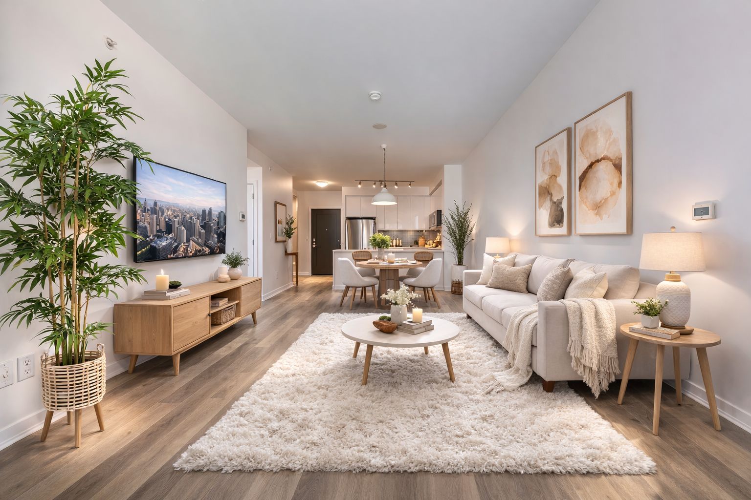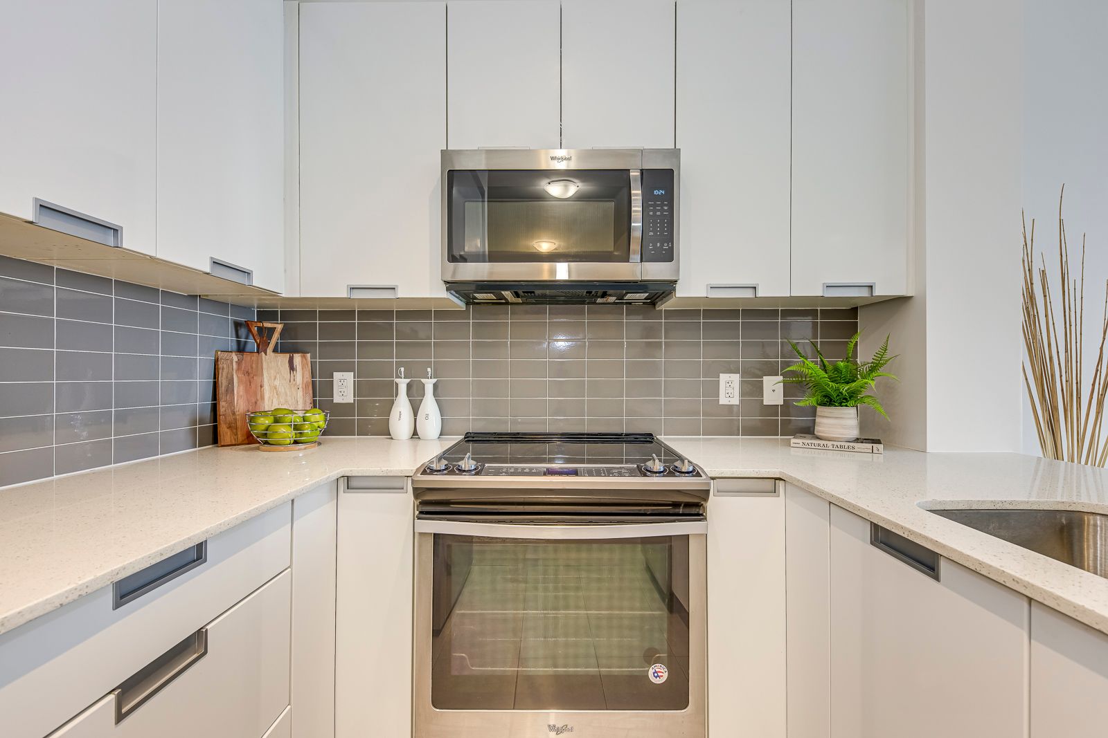 • Contemporary kitchen with quartz countertops and premium stainless steel appliances.