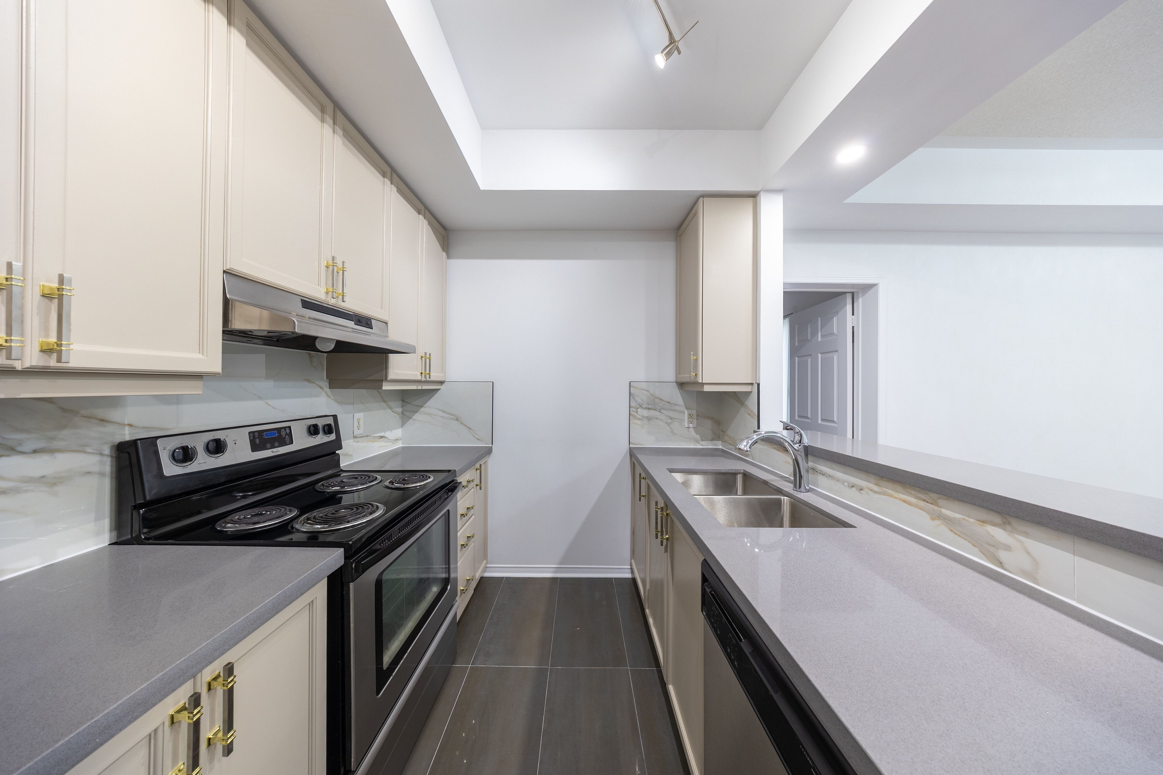 Welcome to effortless, modern living in the heart of churchill meadows! This beautifully updated ground-floor condo townhouse offers true convenience with no stairs, a smart split 2-bedroom layout, and stylish interior upgrades throughout. Enjoy 9 ft ceilings, new lighting, refreshed vanities, and a partially renovated kitchen with stainless steel appliances and a functional breakfast bar. The open-concept living and dining space walks out to a private front patio, perfect for outdoor relaxation and warm-weather enjoyment. Parking is conveniently located close to the unit for easy day-to-day living. Set in a quiet, family-friendly complex, you're just steps from parks, top-rated schools, the community centre, library, erin mills town centre, big-box shopping, restaurants, public transit, and hwy 403. Credit valley hospital is only minutes away-ideal for healthcare professionals. A perfect blend of lifestyle, comfort, and location. Move in and enjoy!