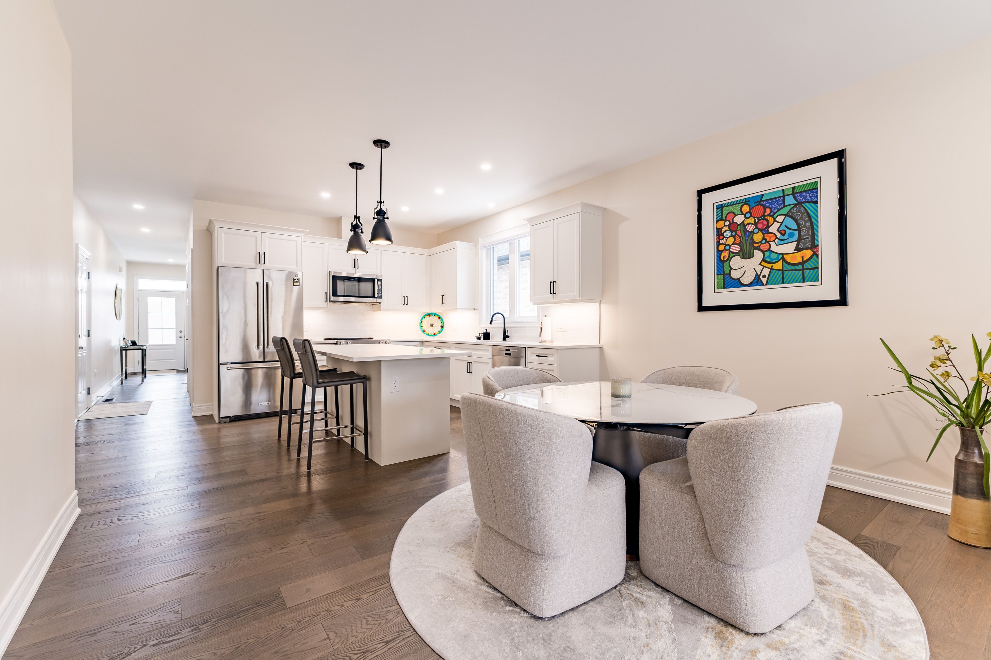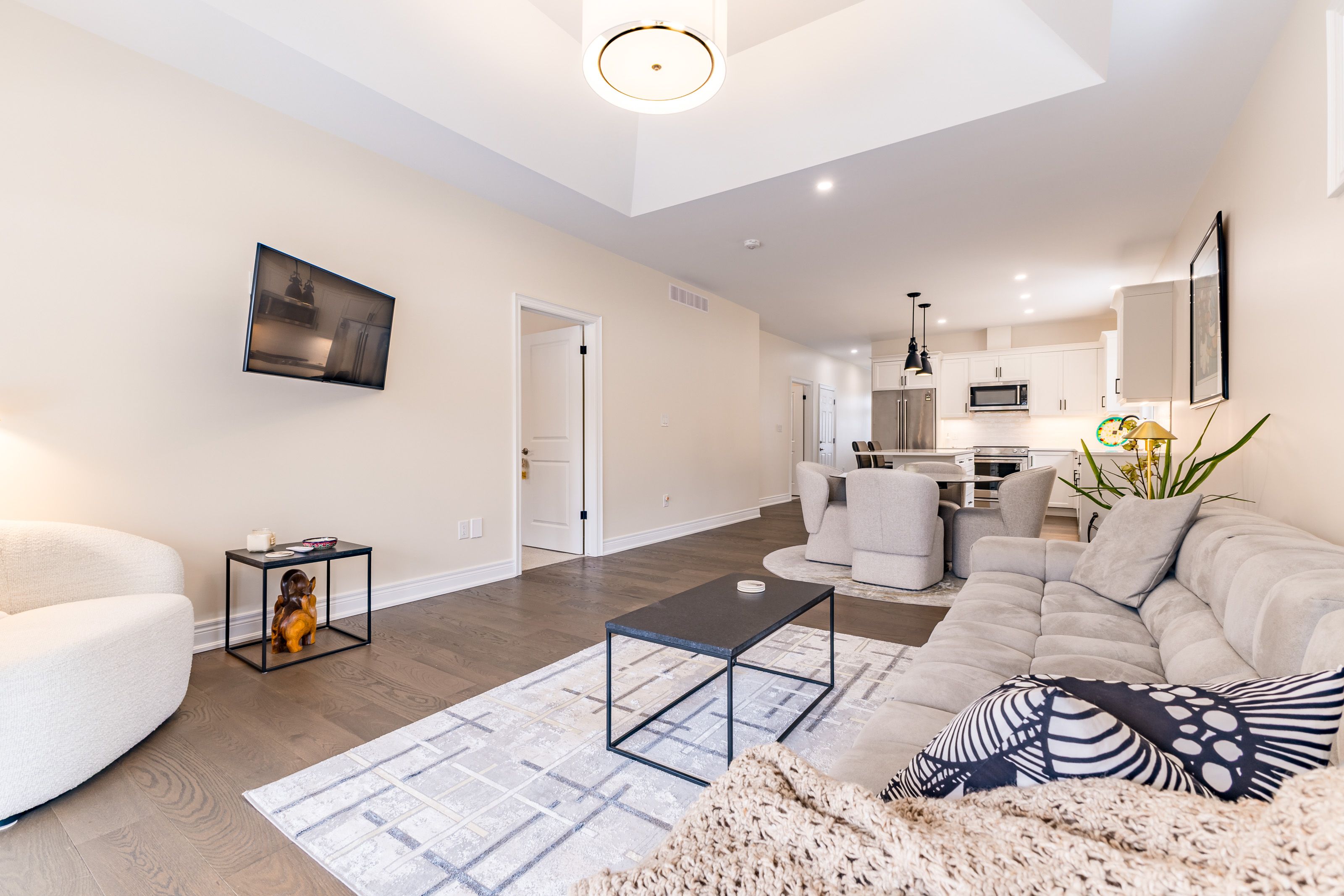 • Open concept design with engineered hardwood floors and tray ceiling.