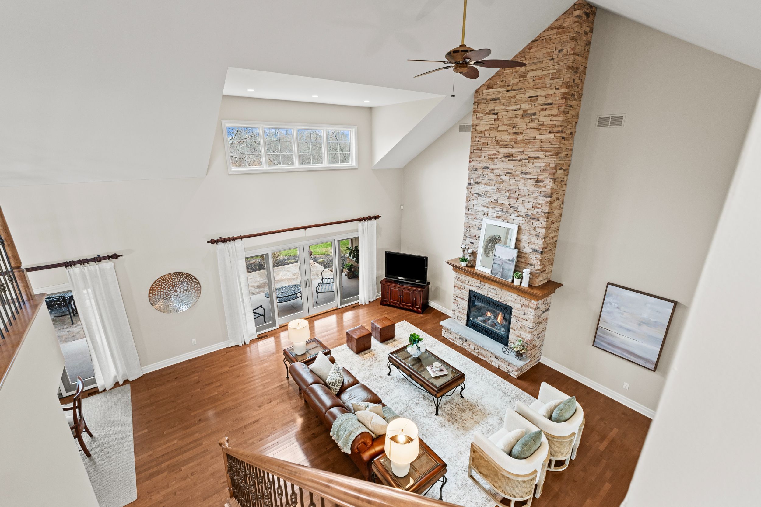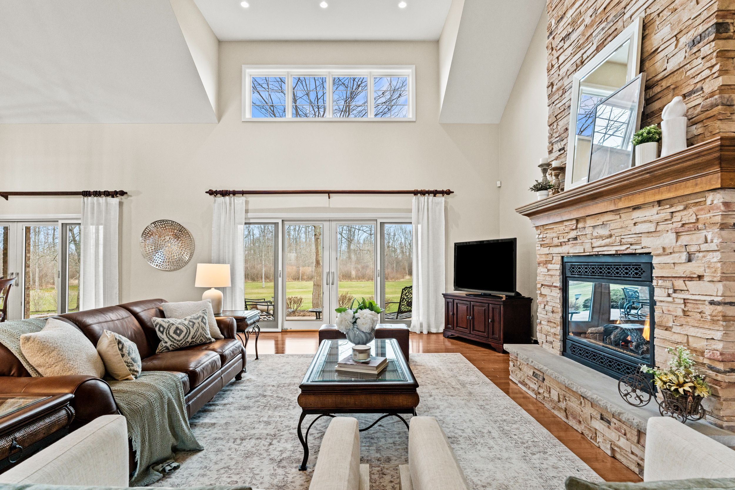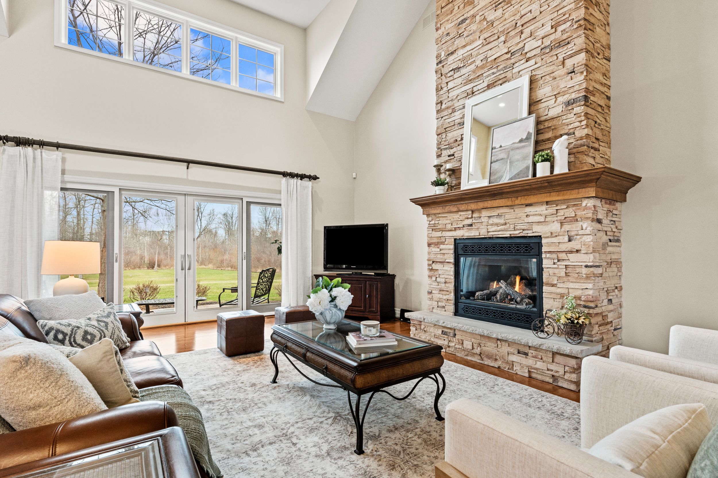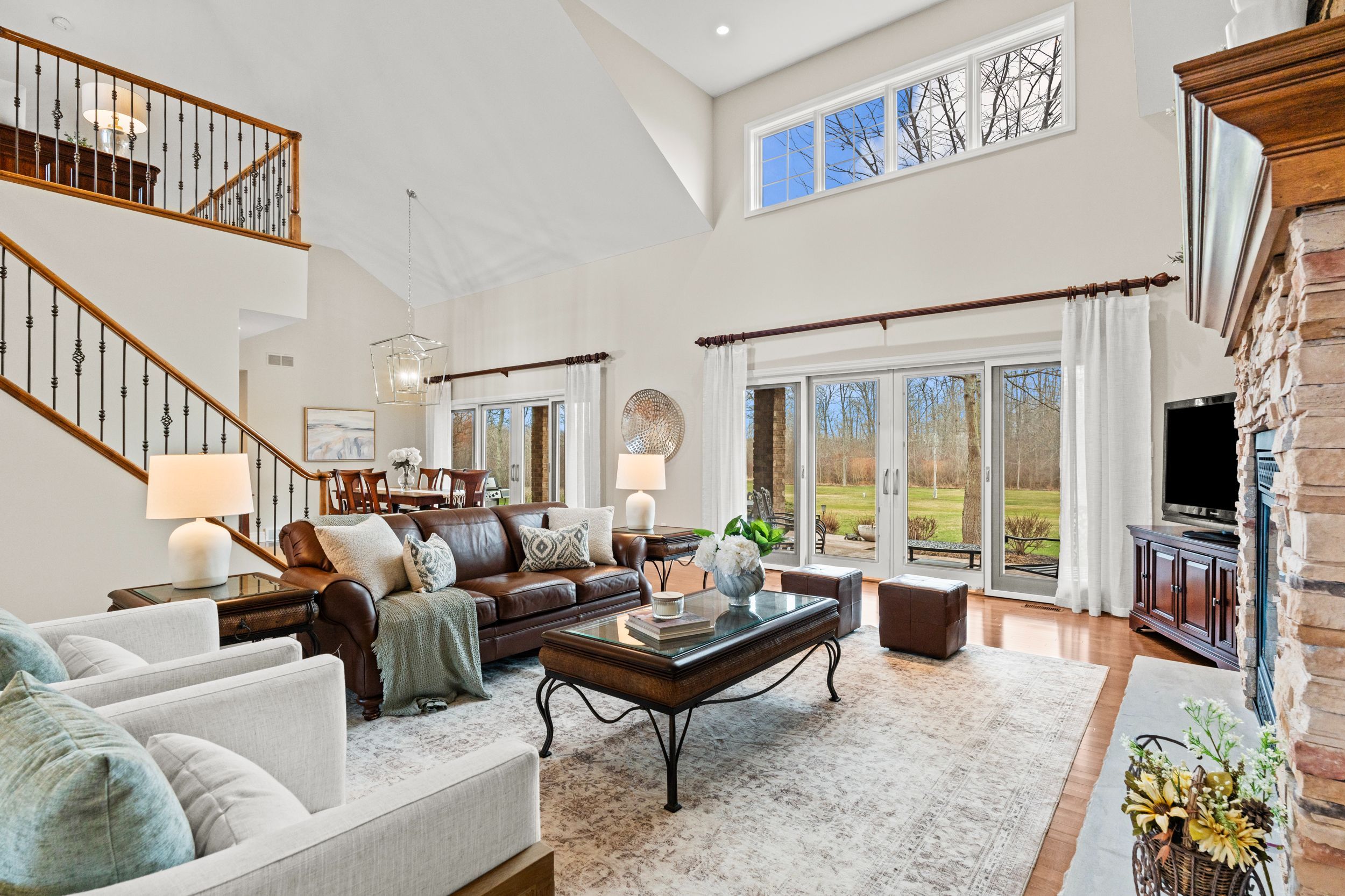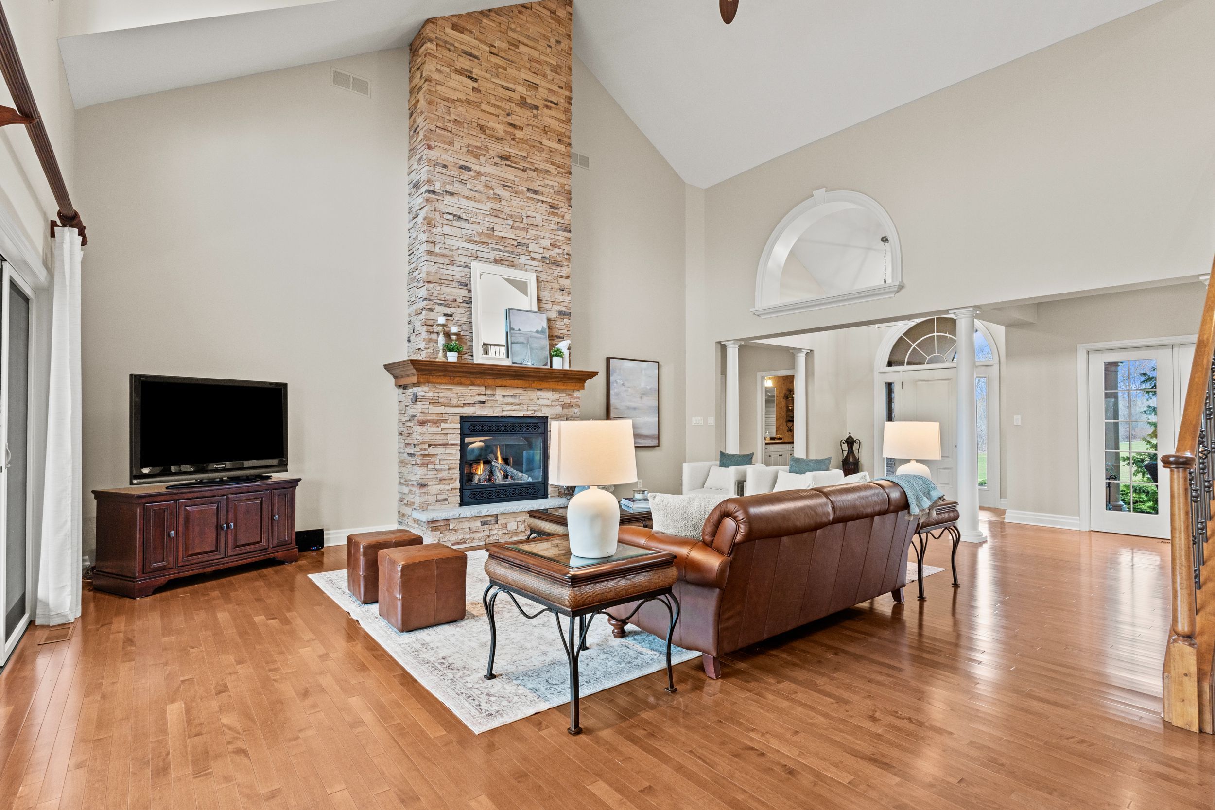 • Bright living room features cathedral ceilings and a stunning stone fireplace.
