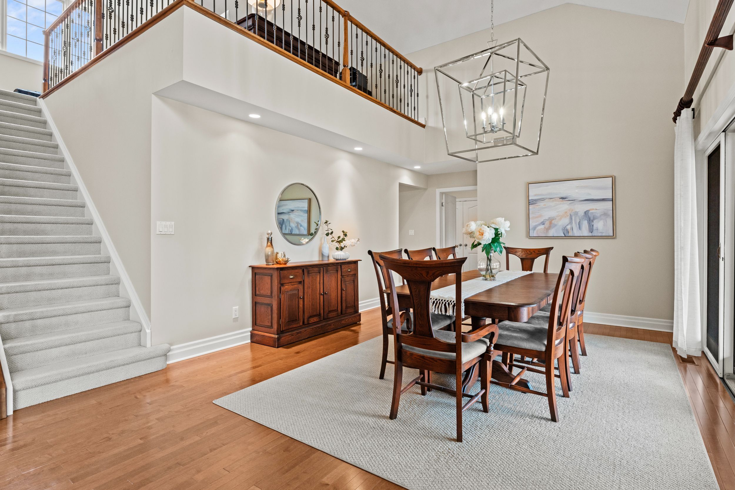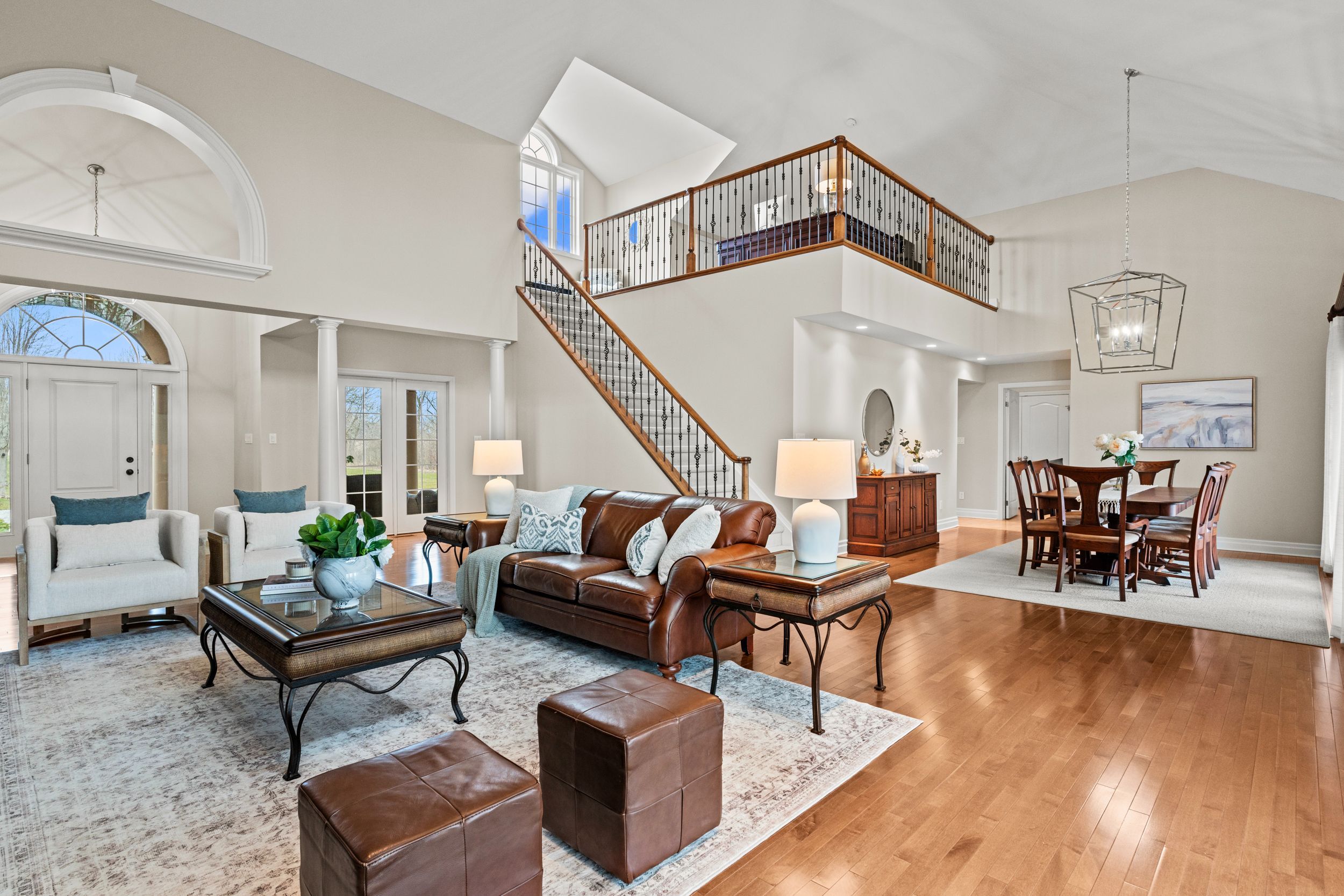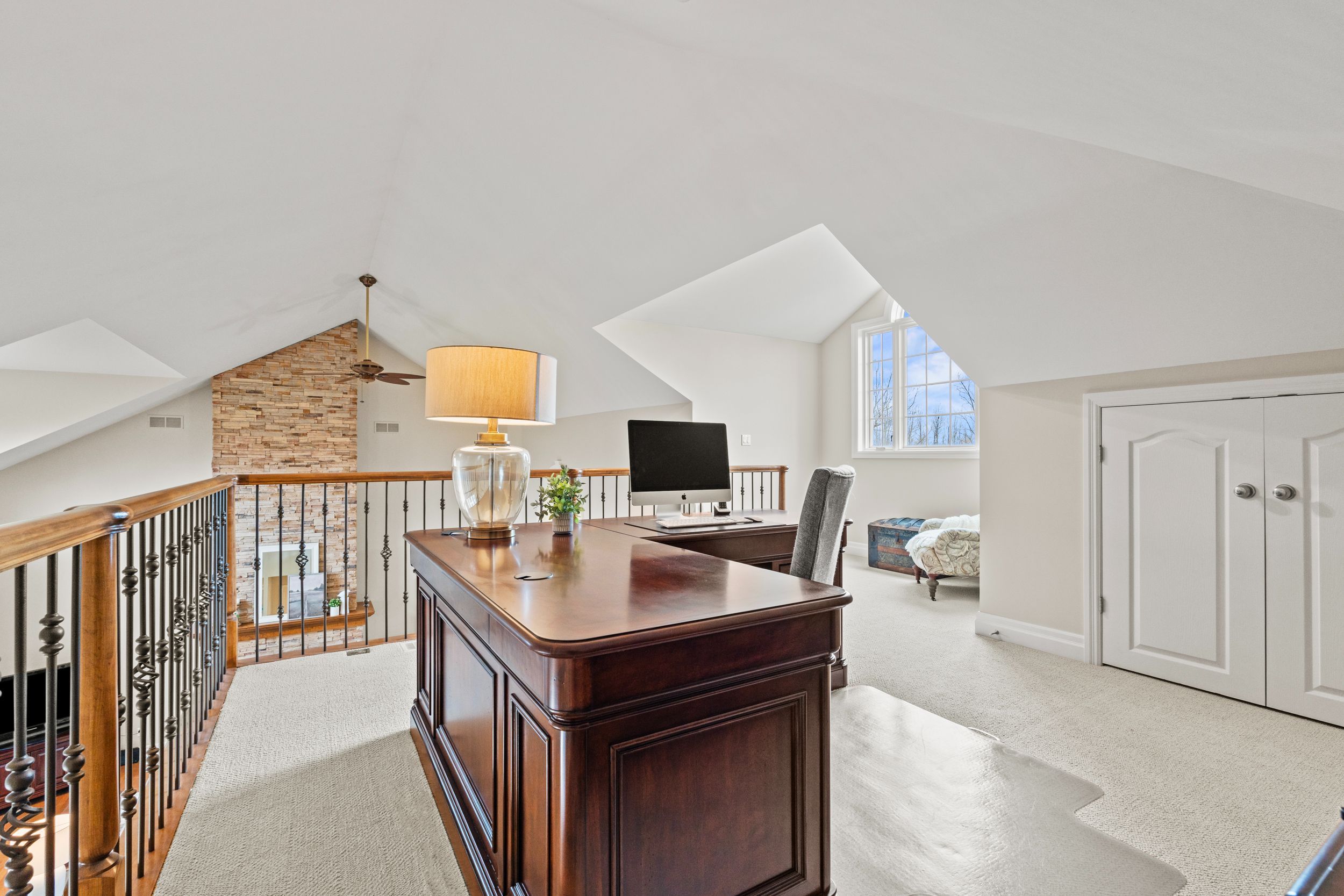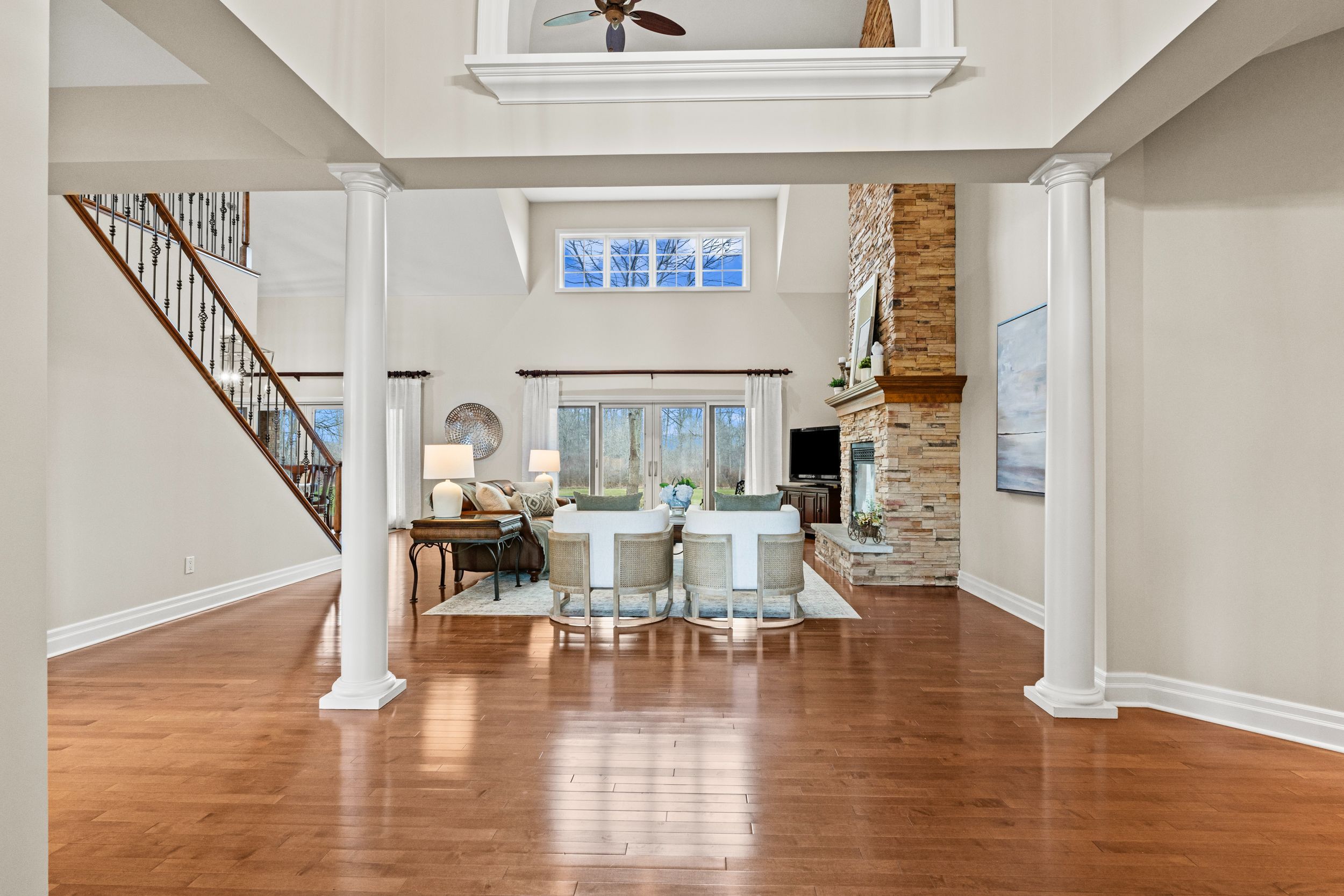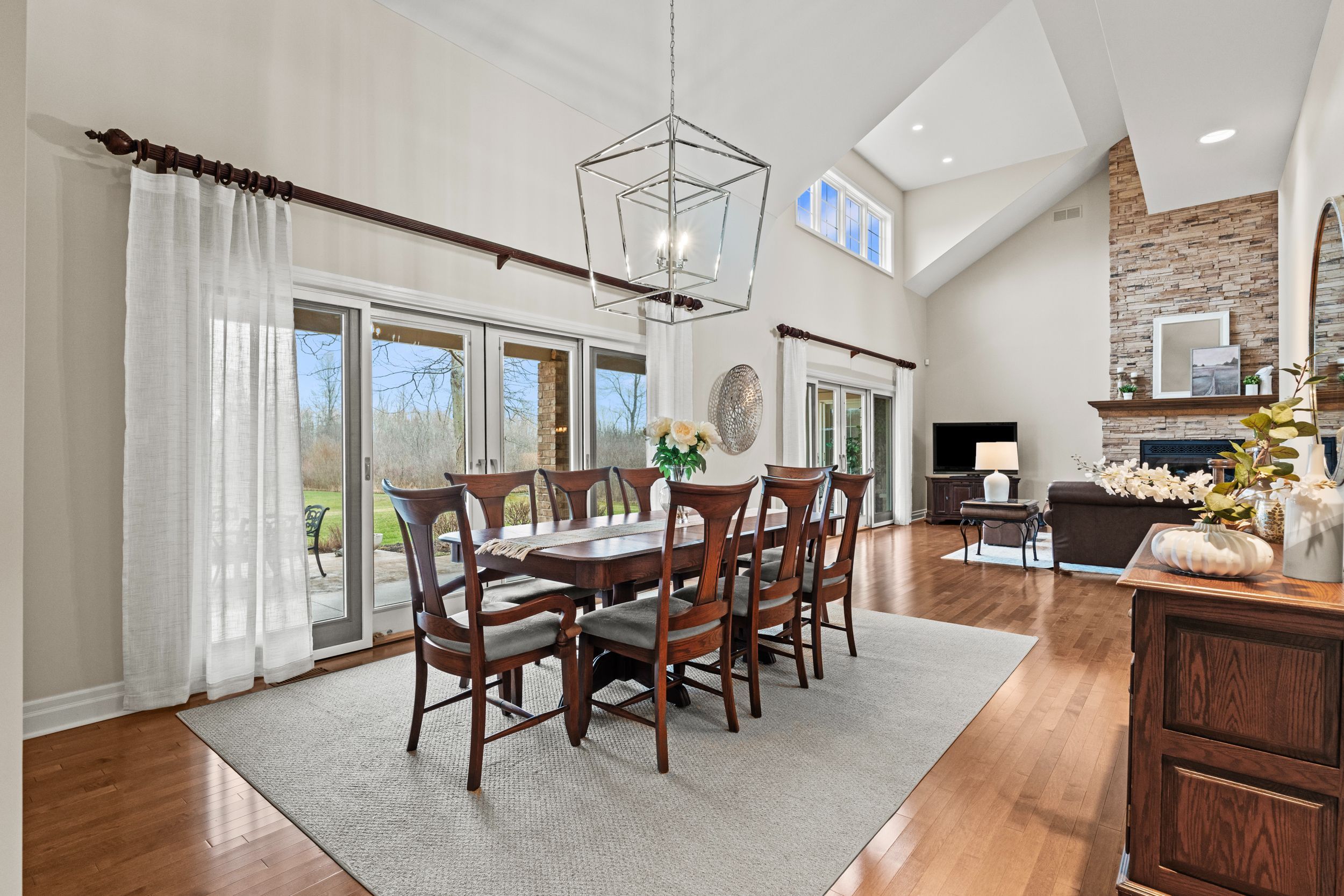 • Bright living room features cathedral ceilings and a stunning stone fireplace.
