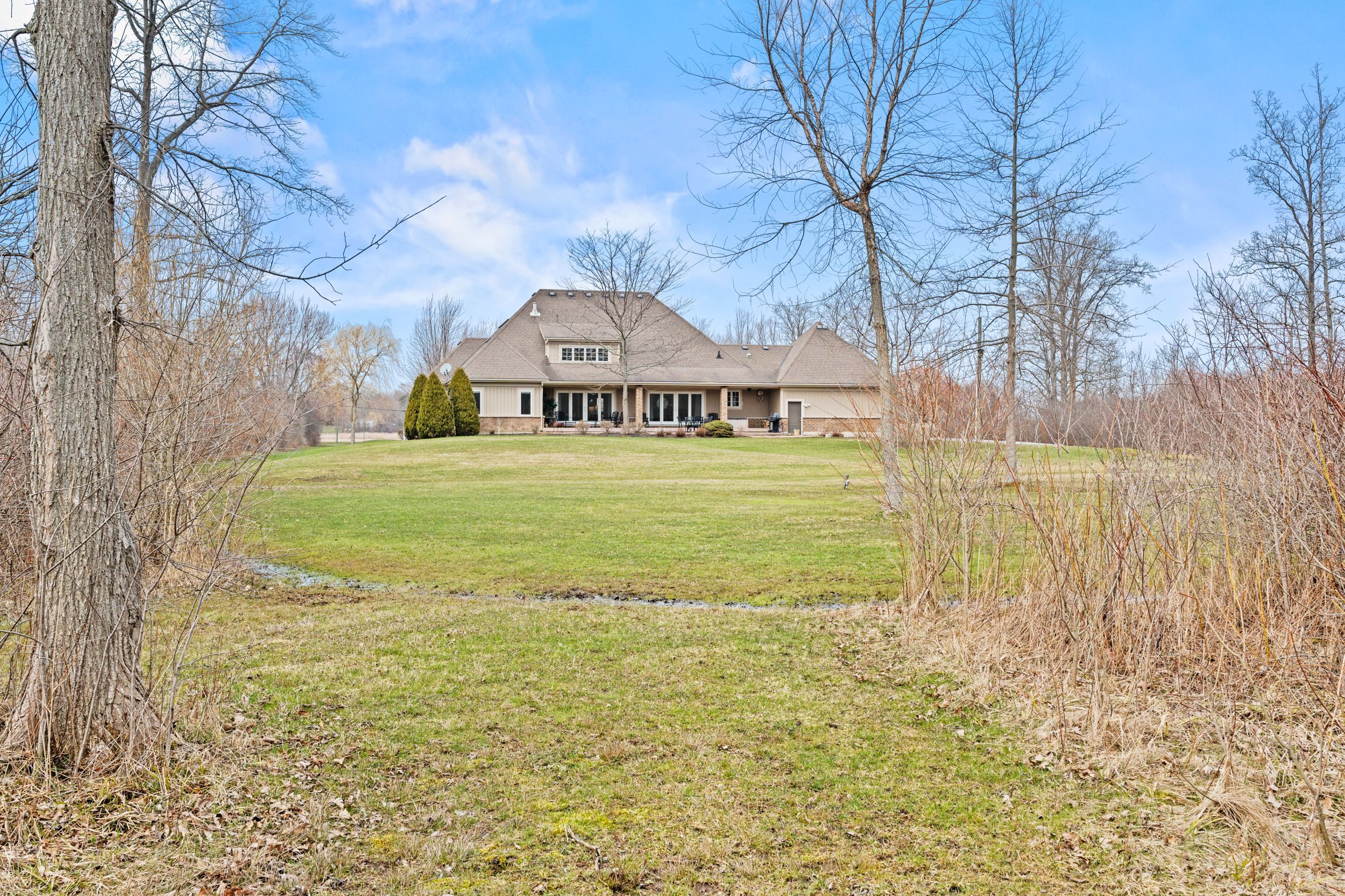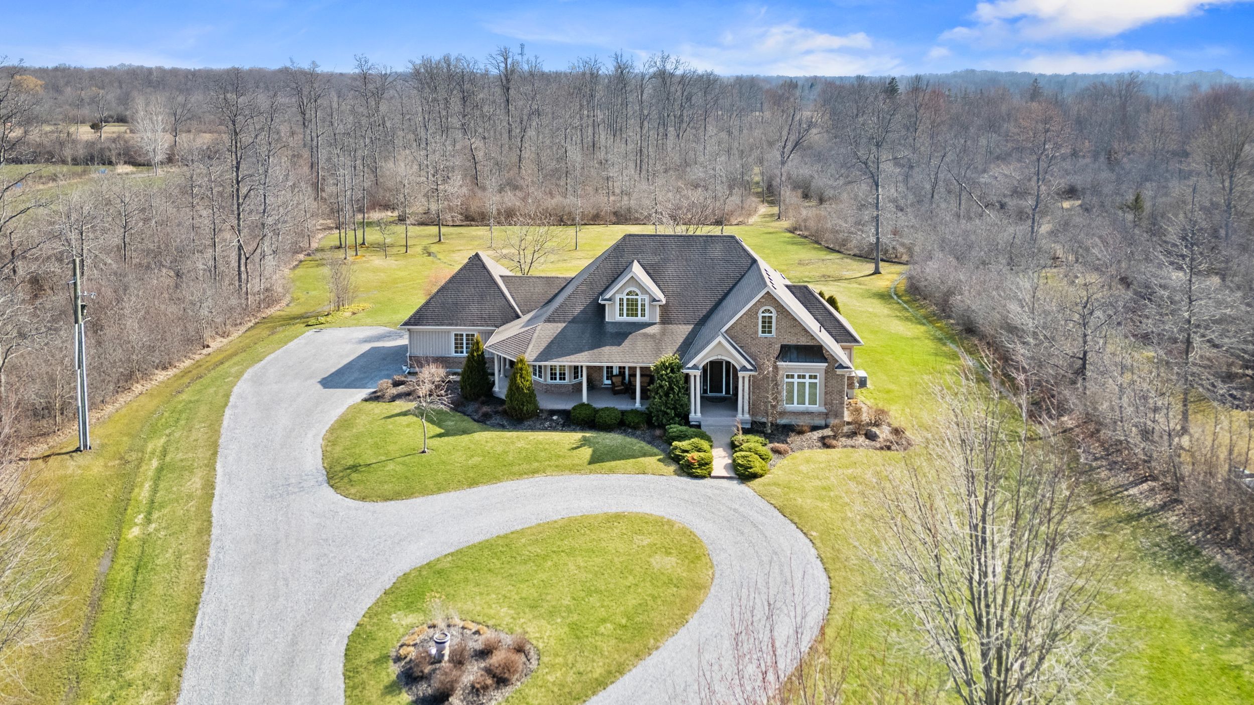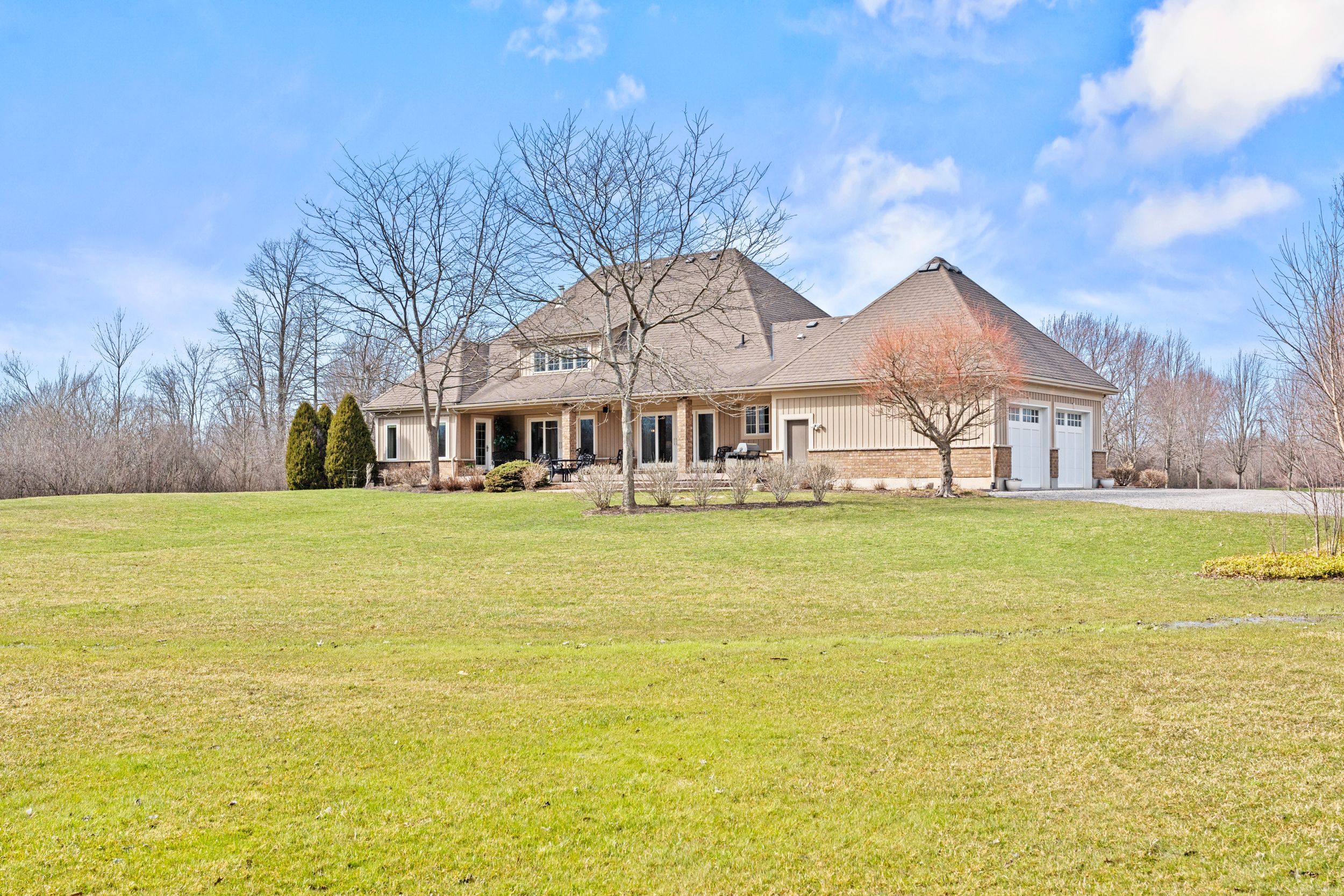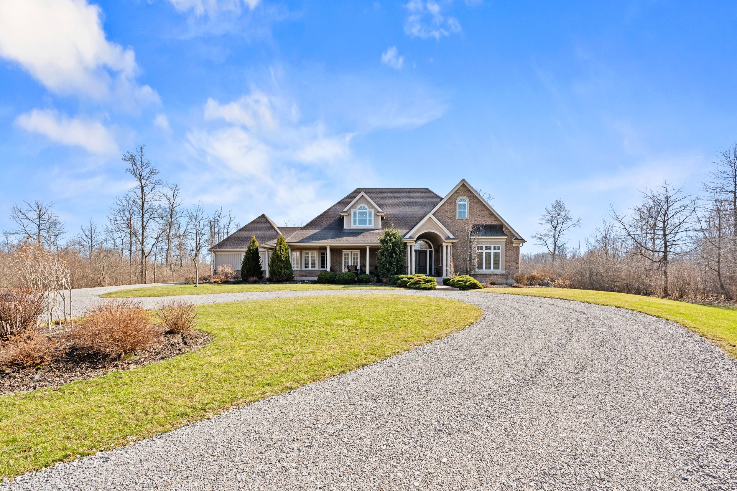 Imagine waking up to pure serenity everyday. When you're here, it feels like the rest of the world doesn't exist and that is exactly what makes this home so special. Set on just under 12 acres, this property offers a level of privacy that is rarely found. The home disappears from the road through the trees creating a setting that feels completely secluded. An expansive winding driveway leads to a stately bungalow with an oversized covered front porch. Inside, a bright foyer opens with sightlines through to the backyard that showcases the scale and natural surroundings. The living room features cathedral ceilings and a floor to ceiling stone fireplace with gas insert. This space flows into a formal dining area surrounded by windows that bring in natural light and views of the back yard. The kitchen is intentionally separated from the primary living space allowing you to enjoy the main living areas without the noise or activity of a busy kitchen carrying throughout the home. Complete with eat in dining, island seating and stainless steel appliances, it also offers a panoramic view over the front grounds. A lofted upper level provides flexible space for a home office or additional lounge overlooking the main floor. The primary suite overlooks the backyard and includes a walk in closet and five piece ensuite, while a second bedroom and four piece bathroom are positioned down the hall. Main floor laundry offers storage and direct access to the oversized double car garage. The lower level features a rec-room with new carpeting, pot lighting and gas fireplace, along with an oversized bedroom with ensuite privilege to a two piece bathroom with rough in for a future shower/tub. Three additional storage and workshop areas complete this level. The grounds offer expansive yard space along with a mature forest and private walking/atv trails. Located minutes to bay beach, sherkston shores, niagara falls and all other amenities.