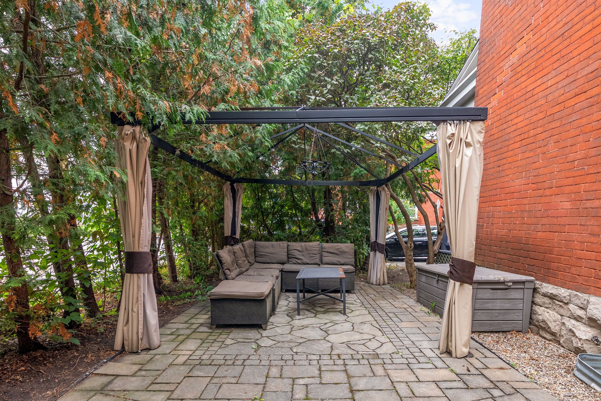 • Private outdoor space with parking for three vehicles, including a garage.