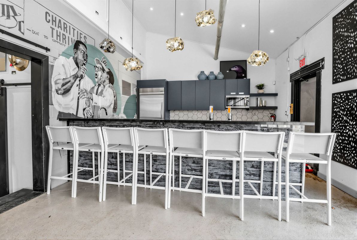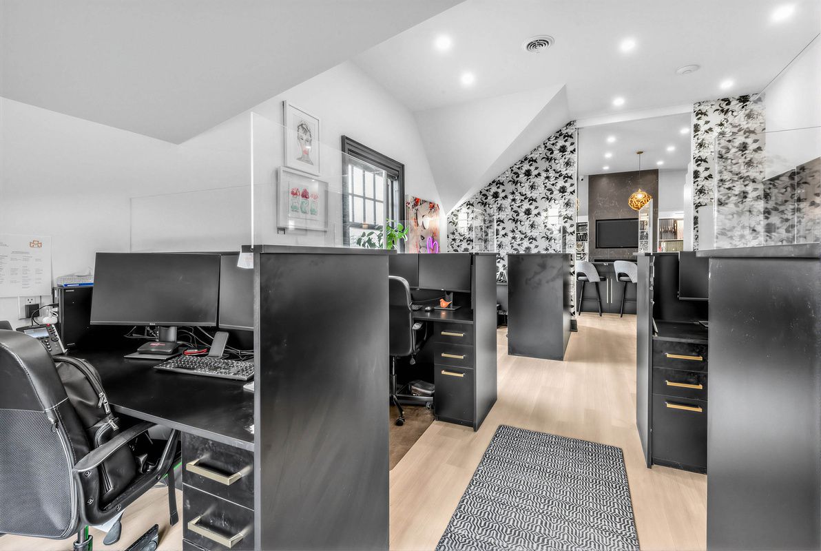 • Features include multiple entrances, high ceilings, and multiple office areas.