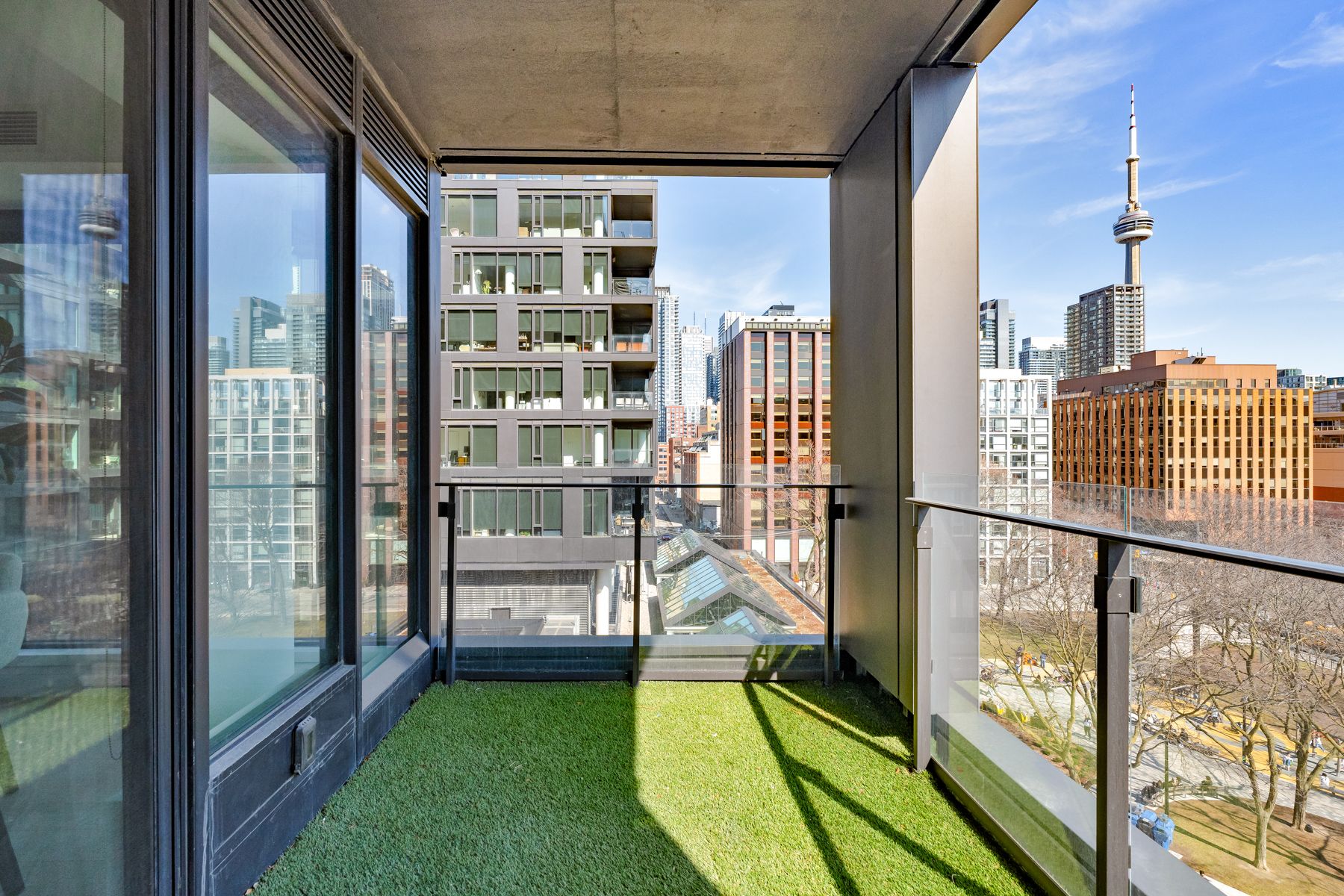 • Upgraded balcony with custom turf and peaceful park sightlines.