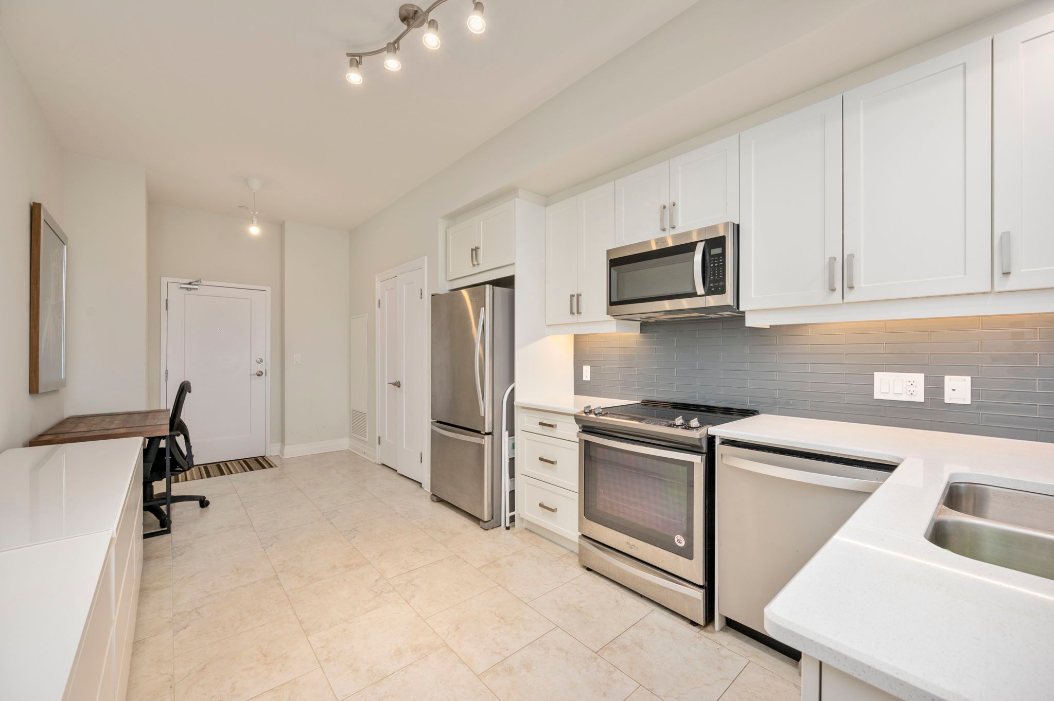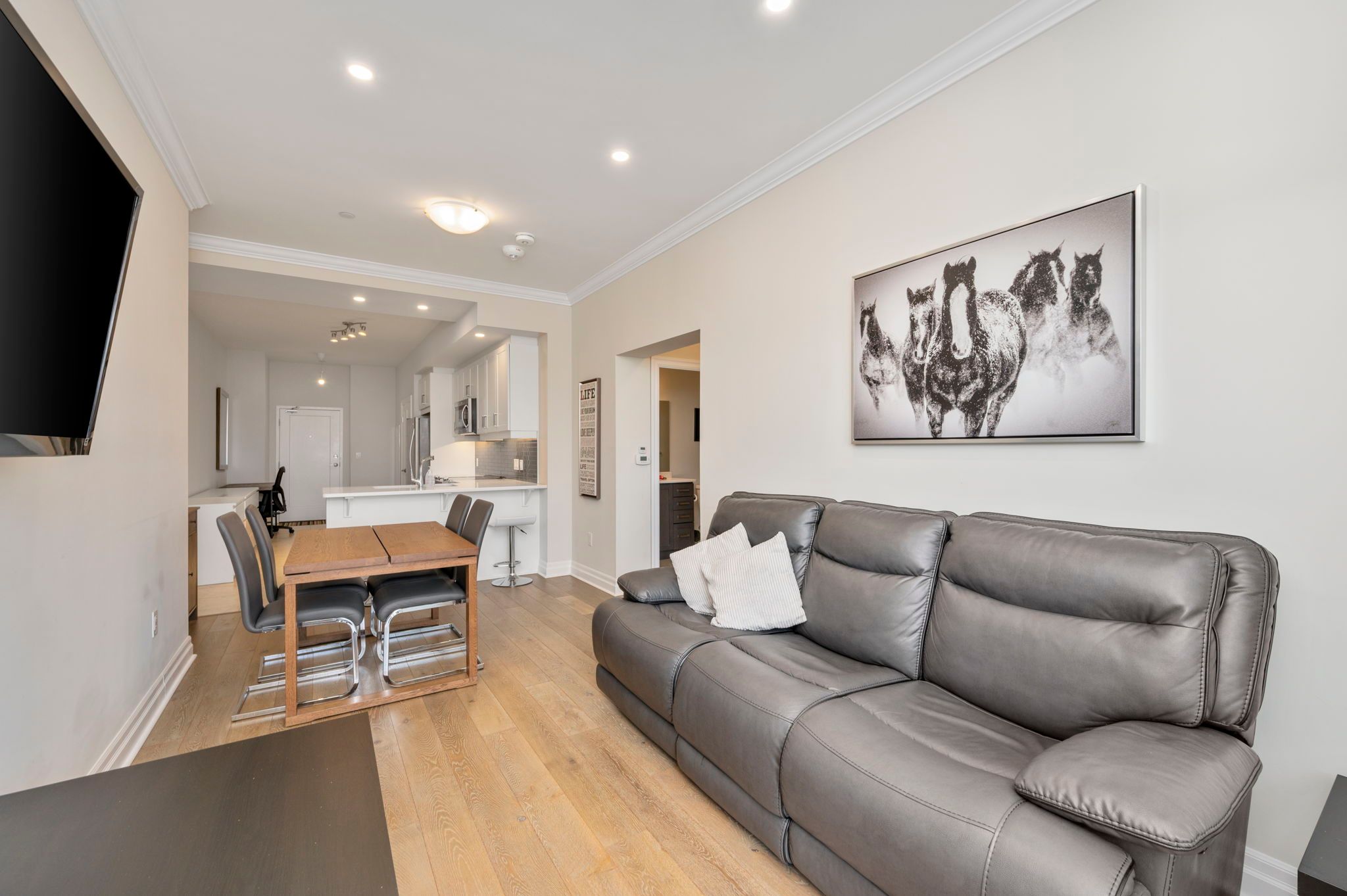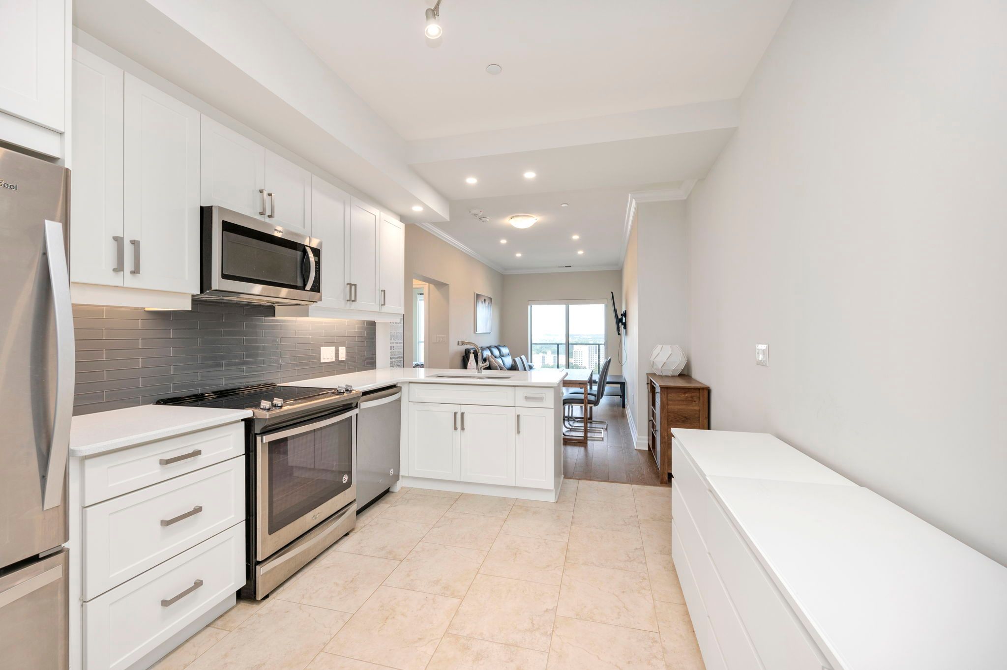 • Open concept kitchen features high-end finishes with stainless steel appliances.