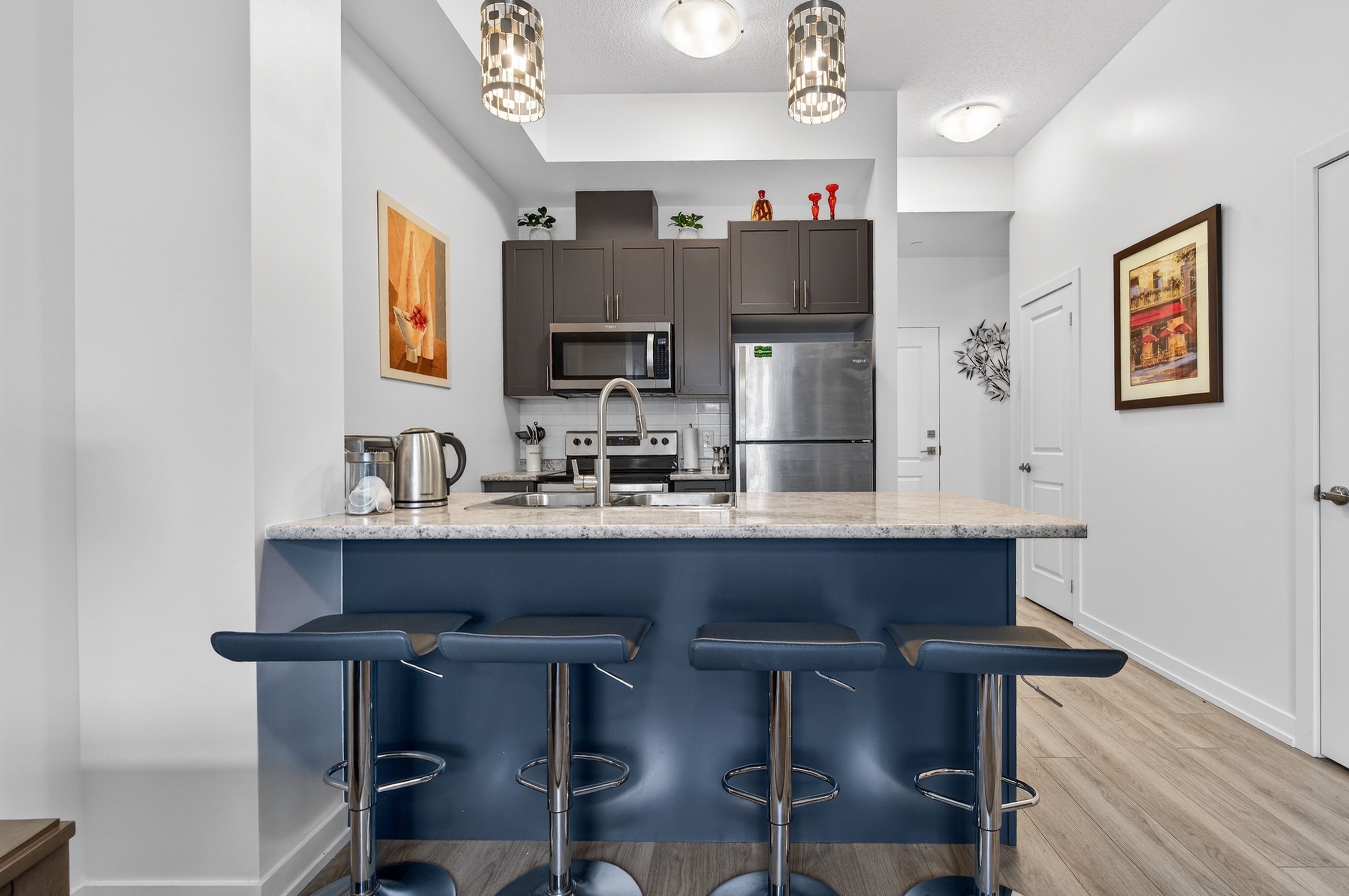 • Modern kitchen with stainless steel appliances and open-concept layout.