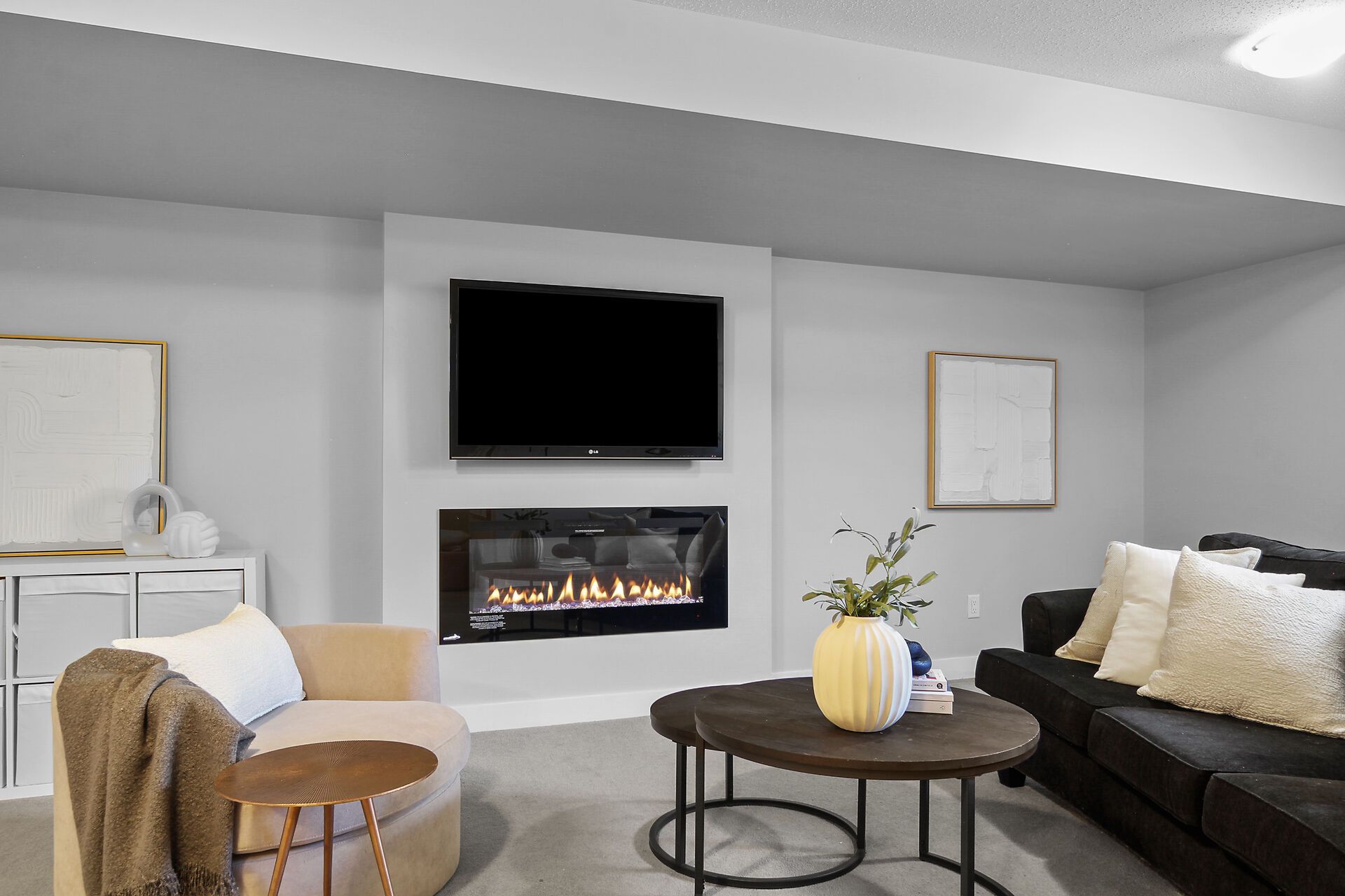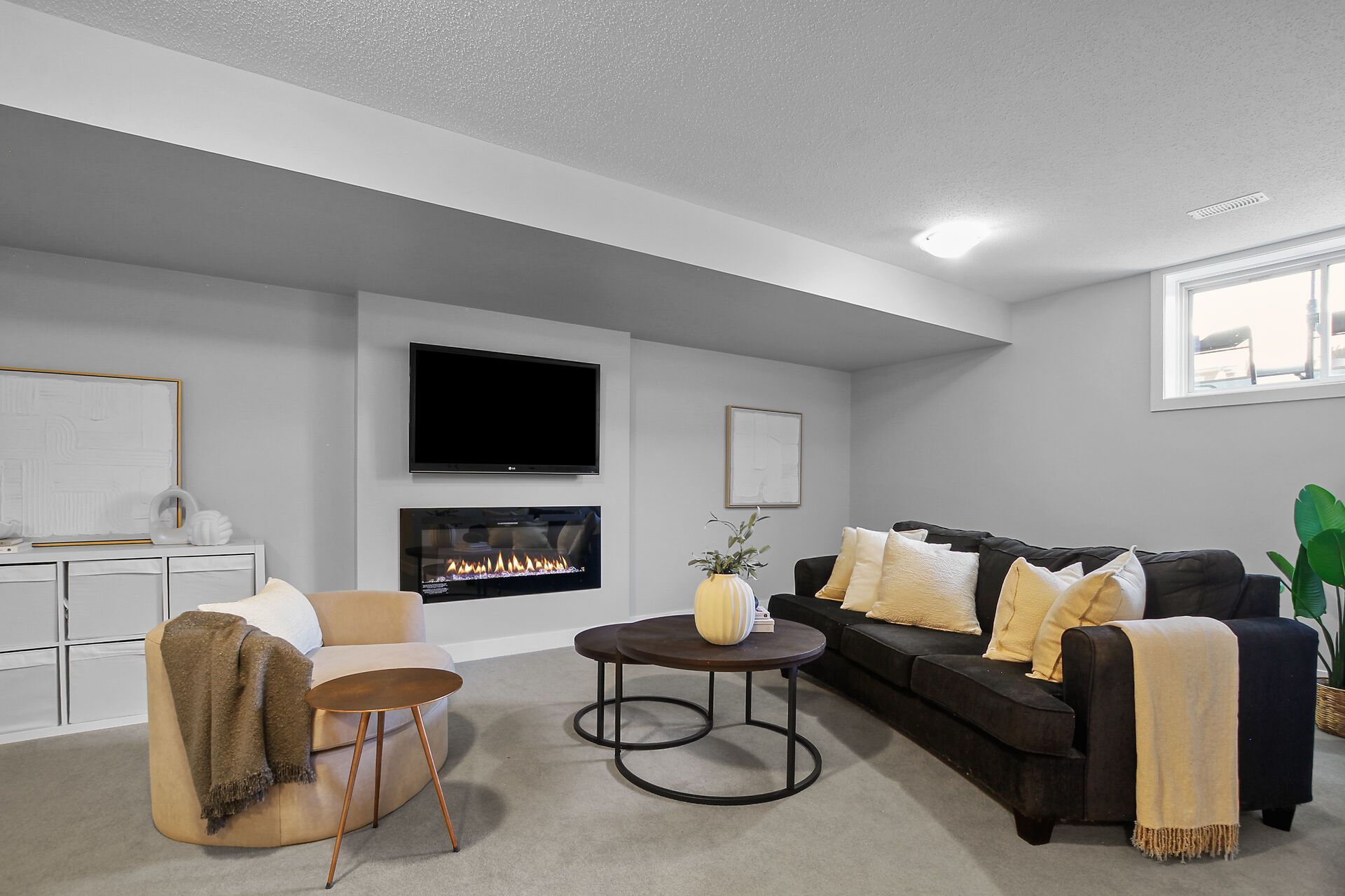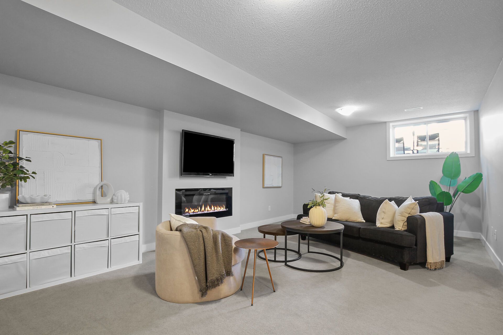 • Finished lower level with cozy electric fireplace and natural light.