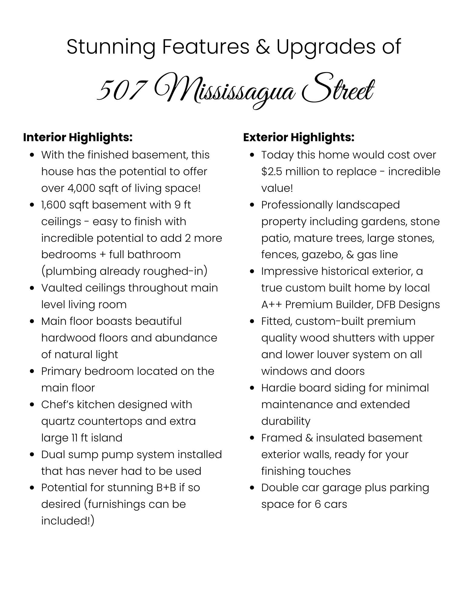 All dressed up & waiting! Located in the heart of wine country, a true custom-built home crafted by local high-end builder, dfb designs. Every inch offers the perfect blend of sophistication, charm, & space. Perfectly situated on mississagua street, bringing you straight into the heart of old town notl in just 2 mins. This 2-storey home has a reproduction exterior look suitable for several possibilities family home, b+b (furnishings can be included), retired couple w/ mf bedroom! The mf welcomes you with stunning hardwood floors & abundance of natural light. Chef's kitchen - a show-stopper designed w/ quartz countertops, custom blt tall cabinets, high-end appliances including double wide chef's refrigerator/freezer & 11ft island perfect for entertaining. Primary suite on the main level offers vaulted ceilings, w/i closet, generous 5-pc ensuite w/ dbl vanity. Living rm features architecturally detailed vaulted ceilings, cozy high-end gas fireplace, several walk-outs to the garden, while a separate dining area is spacious inviting for family gatherings. Powder rm & laundry complete main level. Upstairs, 2 adtl over-sized bedrooms w/ their own ensuites. 2nd-level den/office. Basement feat. 9-ft ceilings, framed, insulated exterior walls w/ rough-in plumbing for full bathrm, electric & gravity sump pump - plenty of potential, promising a personalized space for you & potential to bring sqft to 4300 (easy to complete - drawings available). Home is surrounded by professionally landscaped gardens & double-car garage w/ space for 6 cars. Stone interlock rear patio is crowned by a covered gazebo, w/ gas line for bbq. 100ftx114ft lot. Live the dream in niagara-on-the-lake mins to restaurants, world-class theatre, wineries, boutiques, golf & sailing club! With peaceful, small-town feel & so much to explore within walking distance, old town - perfect neighbourhood for history, heritage, culture, the arts, and foodies that enjoy michelin-star type restaurants. Show with pride!