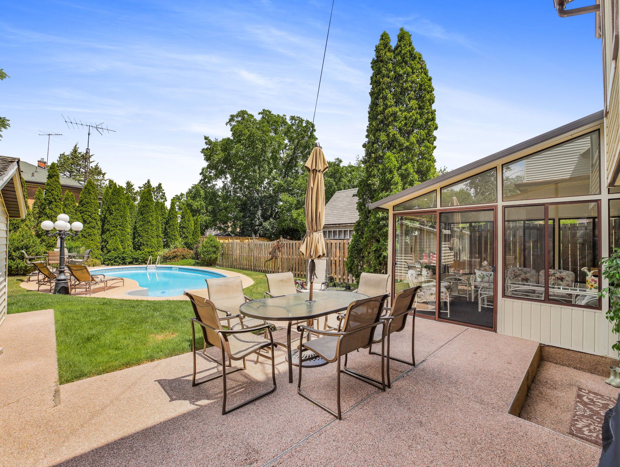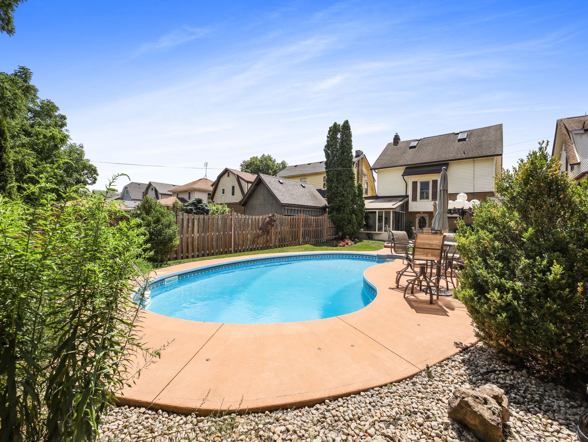 Welcome to a truly special home where timeless character and thoughtful upgrades meets exceptional outdoor living. Set on a beautifully landscaped lot, this property offers a private backyard oasis complete with a kidney-shaped inground pool, sunroom, extensive concrete work, and lush gardens-perfect for relaxing or entertaining all summer long. The impressive curb appeal is enhanced by trillium award-winning gardens. Inside, the main floor features a warm and inviting formal living room with hardwood floors, gas fireplace, and coffered ceilings, with patio doors leading to a charming front porch ideal for morning coffee or evening cocktails. The spacious eat-in kitchen offers an abundance of quality cabinetry, built-in appliances, island, and opens to a cozy family room designed for everyday living and entertaining. Upstairs, the second floor includes a massive primary bedroom, a 4-piece bath with jacuzzi tub and separate shower, an open den/office (easily converted back to a bedroom), and an additional walk-in closet. The finished third floor provides excellent bonus space for a guest suite, playroom, gaming area, or extra bedroom, along with additional storage. The finished basement features a rec/games room, 3-piece bath, laundry area, and workshop. Additional updates and features include furnace (2023), central air (2022), and a concrete driveway.